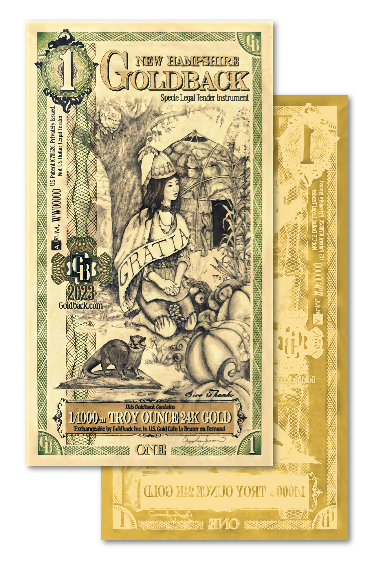 The New Hampshire Goldback is a unique, voluntary currency made with 24-karat gold. Each note contains a precise amount of gold, making it a practical way to own and use physical gold in everyday transactions. Designed specifically for use in New Hampshire, these notes are recognized by local businesses and collectors alike.