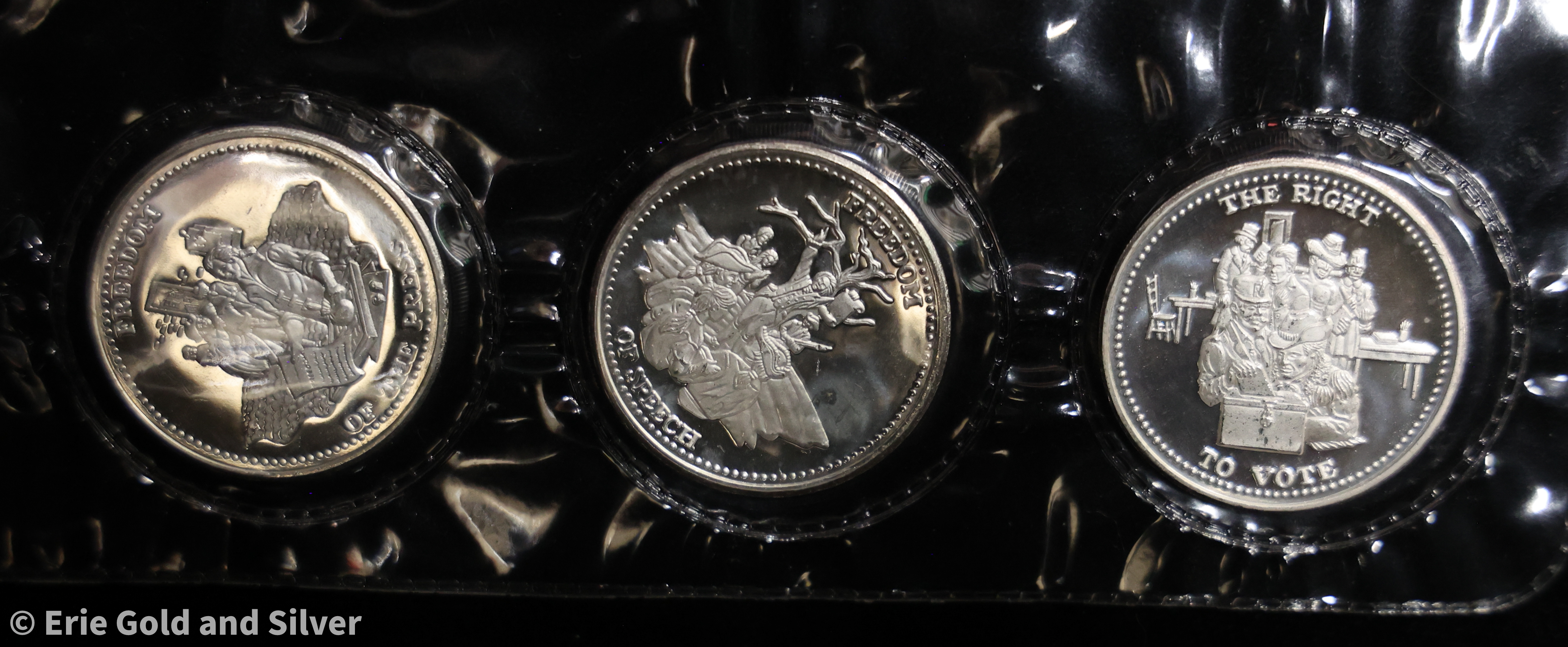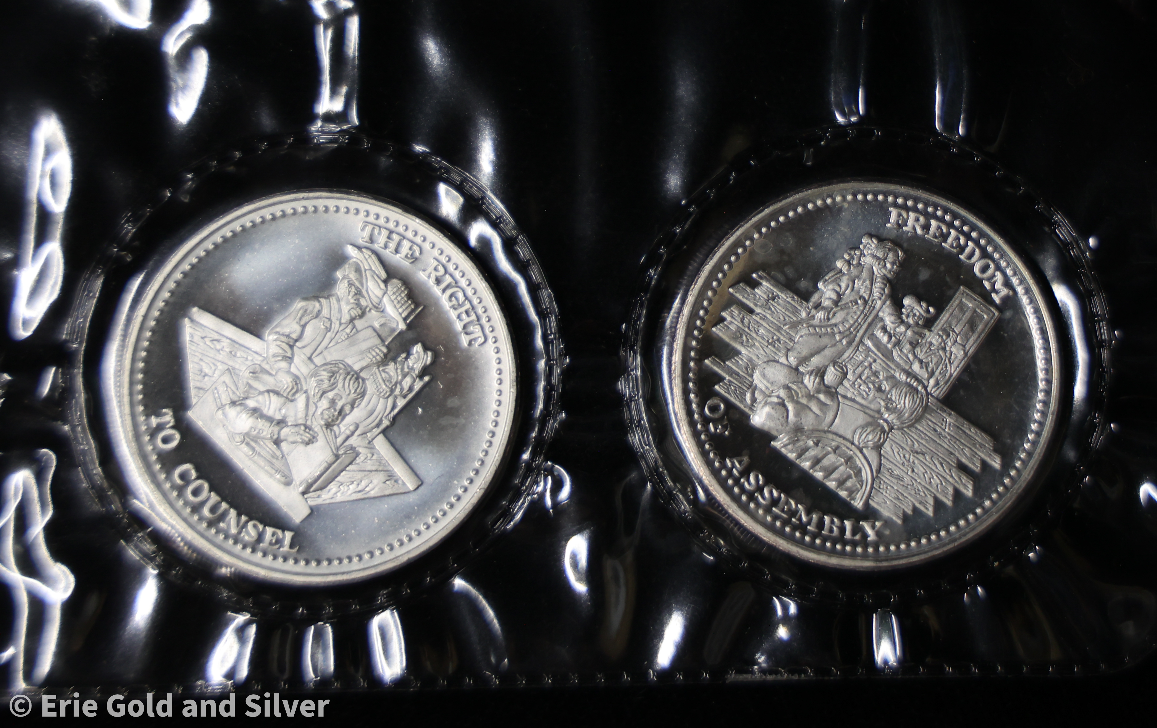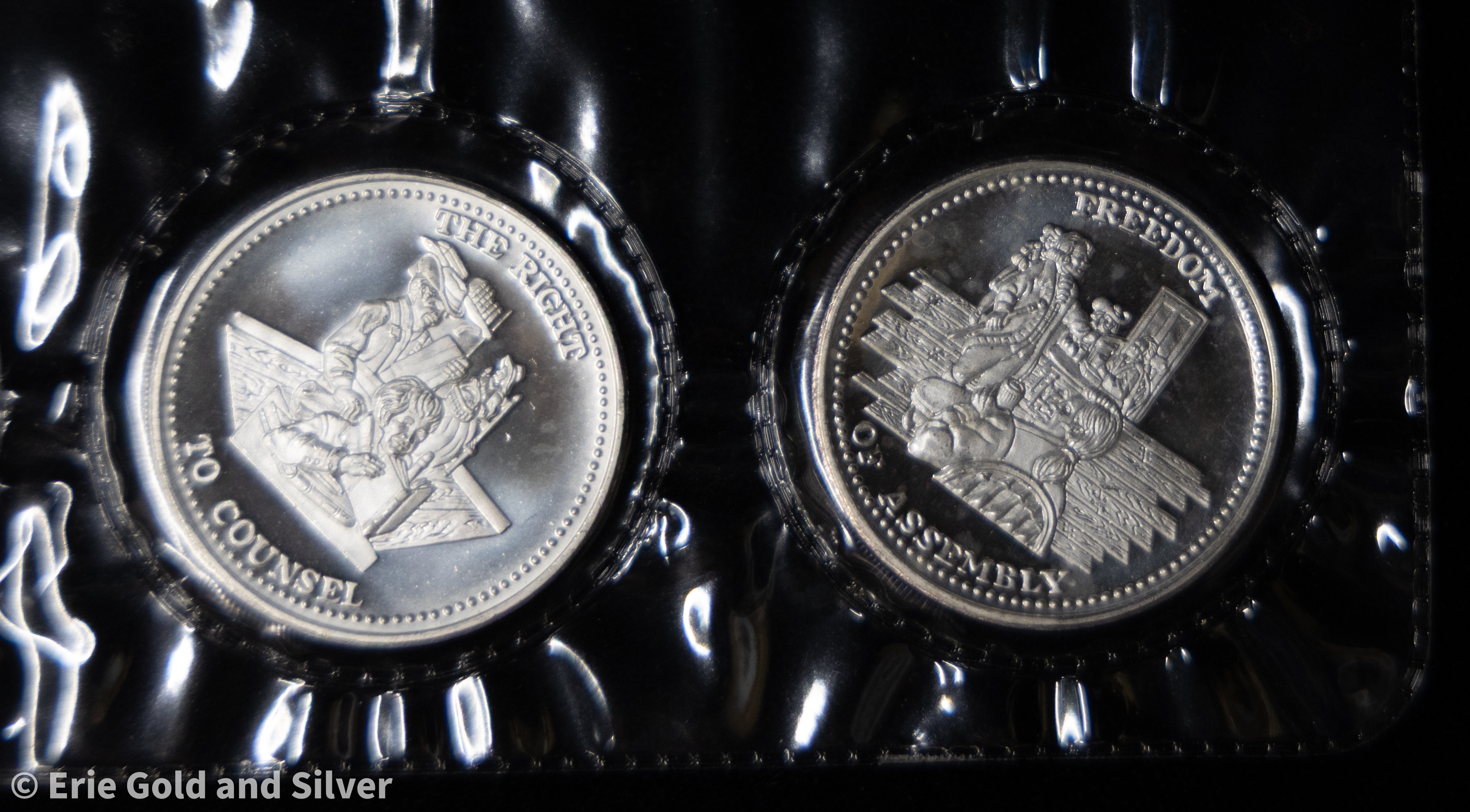 Celebrate the enduring principles of American liberty with this complete 10-coin set of Johnson Matthey's "Bill of Rights" silver rounds. Struck in the 1980s by the esteemed Johnson Matthey refinery, each round contains 1 troy ounce of .999 fine silver, collectively totaling 10 ounces of pure silver.