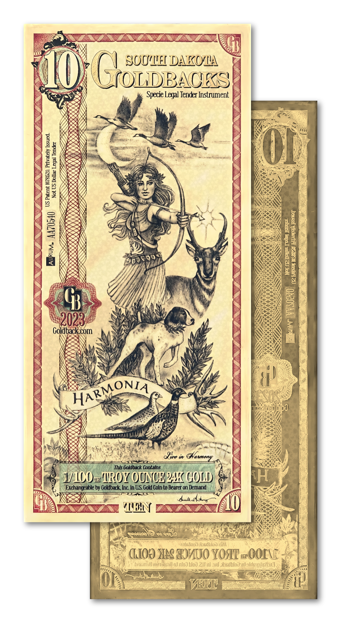 The South Dakota Goldback is a voluntary, gold-backed currency containing 24-karat gold. Designed for use in South Dakota, these notes provide a practical way to own and spend physical gold. Recognized by local businesses and valued by collectors, Goldbacks offer a unique way to engage in transactions using real money.