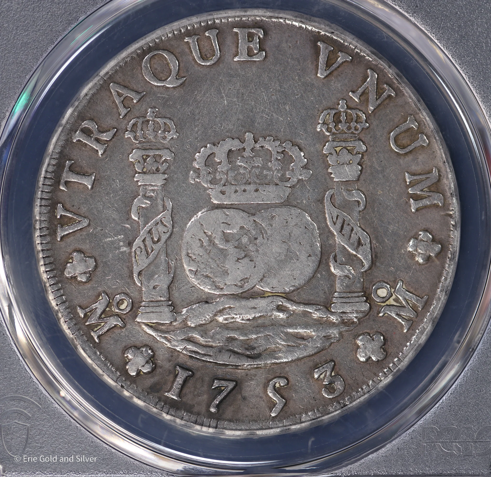 1753-Mo MF 8R Mexico Silver Pillar Dollar PCGS VF Detail | Calico-479