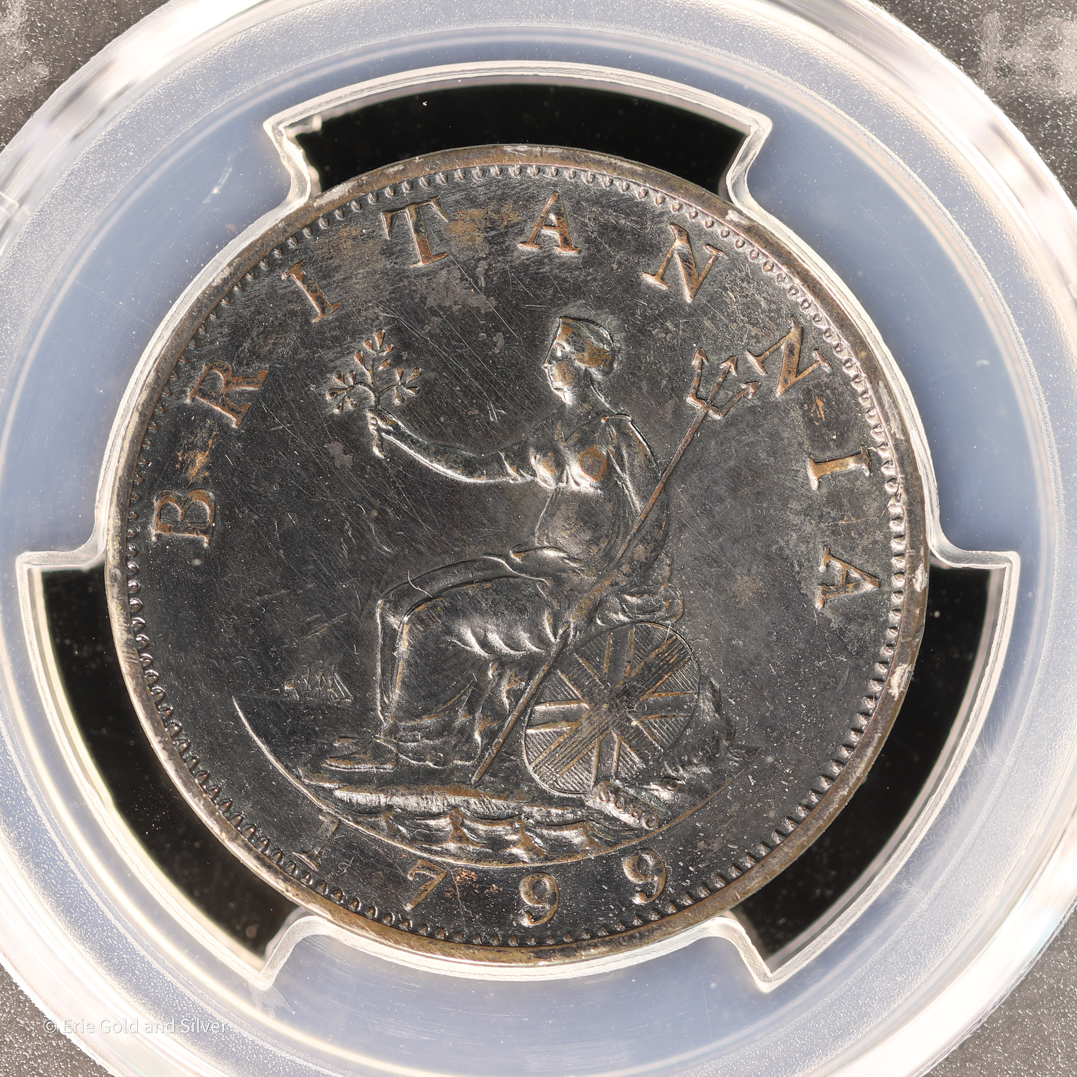 For sale is a 1799 Great Britain George III Copper 1/2 Penny. Certified / graded by PCGS at Genuine AU Detail.