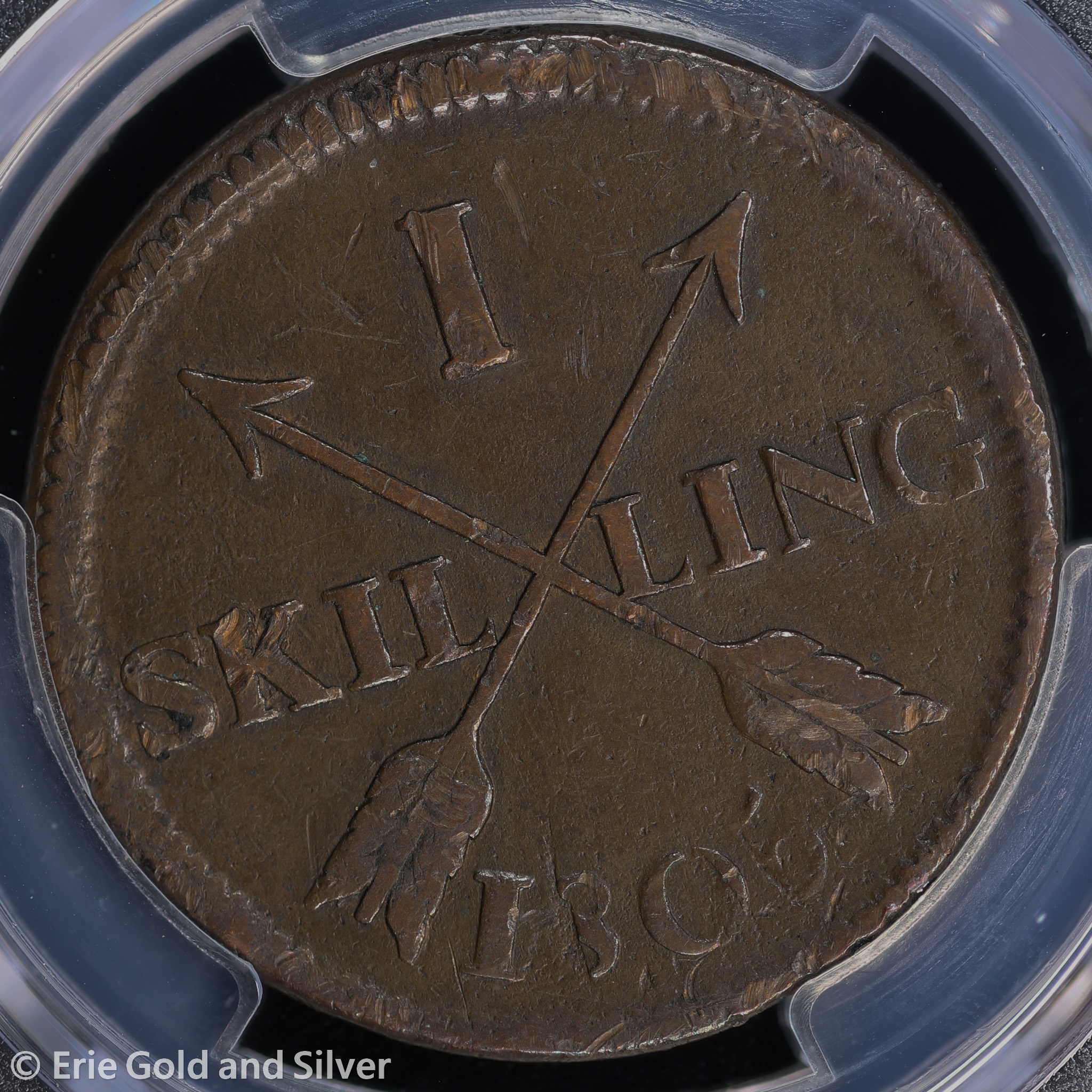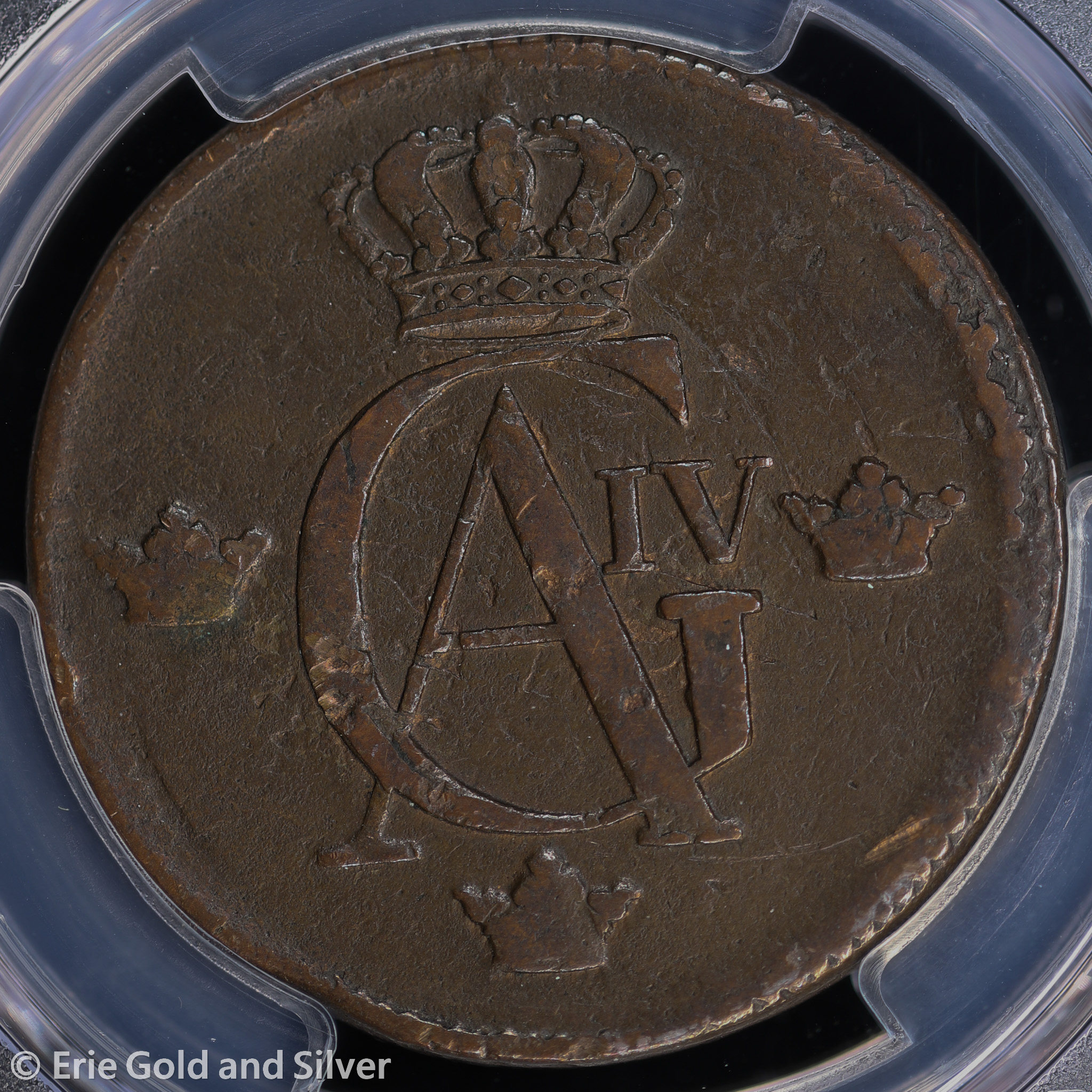 For sale is a 1805 Sweden 1 Skilling Copper Coin. Certified / graded by PCGS at Genuine VF Detail.