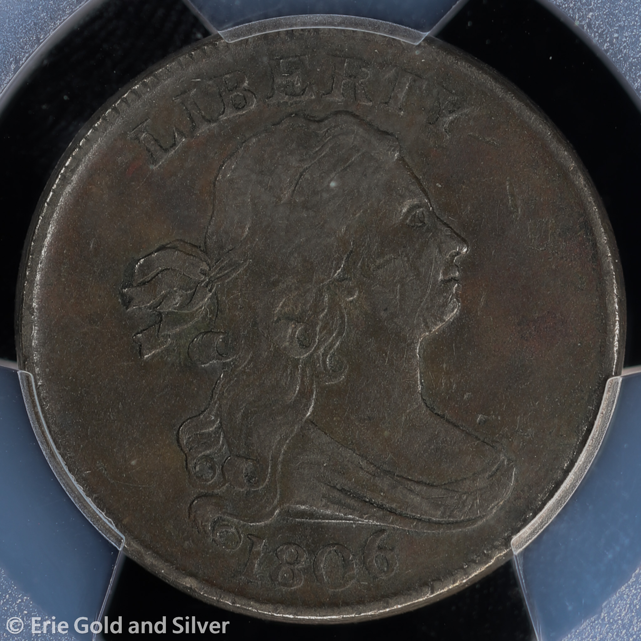 For sale is a 1806 Draped Bust Half Cent. Certified / graded by PCGS at Genuine XF Detail.