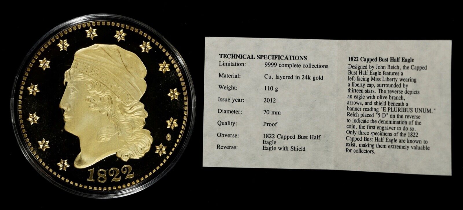 1822 Capped Bust Half Eagle $5 Gold Dream Replica Gilded Copper Round