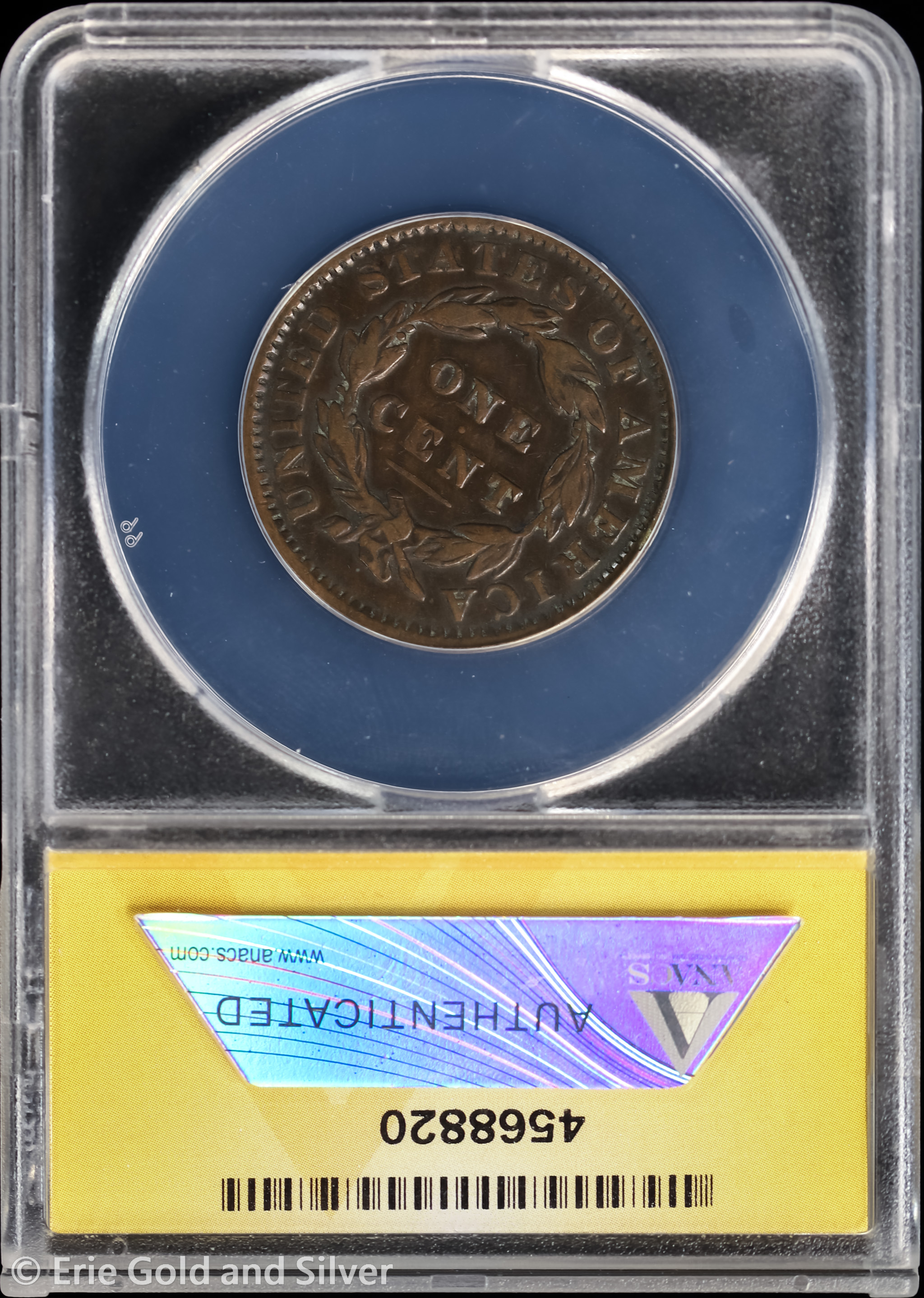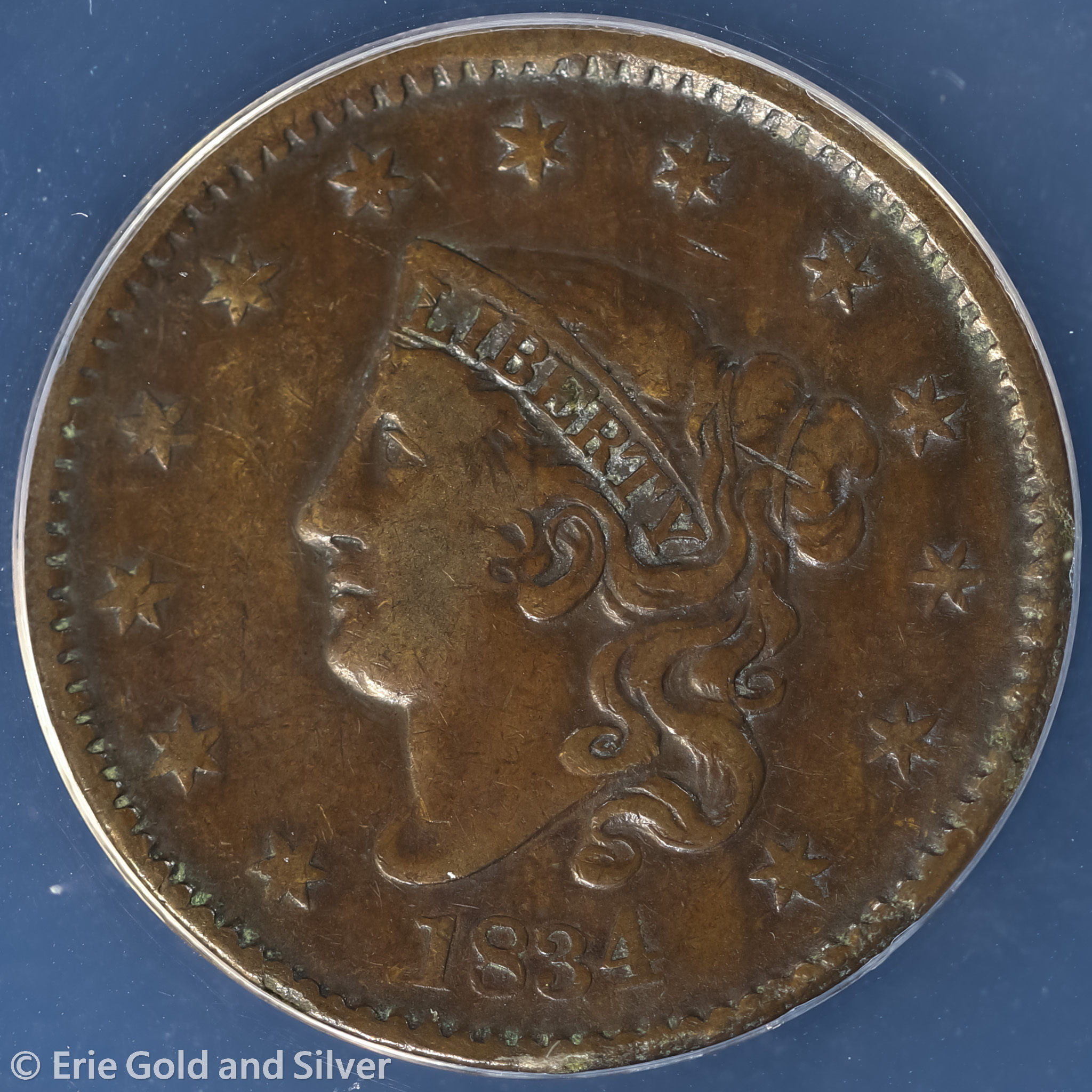 For sale is a 1834 Coronet Head Large Cent. Certified / graded by ANACS at VF 20.