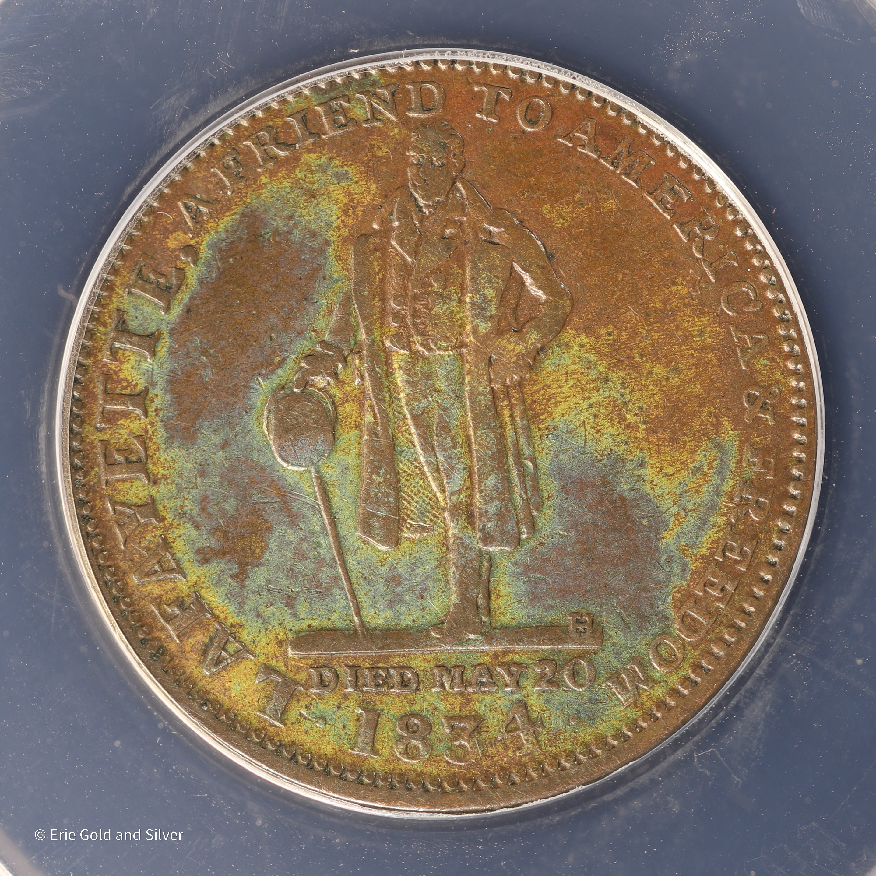 For sale is a 1834 Hard Times Merchant Toke- Lafayette, A Friend to America & Freedom. Certified / graded by ANACS at VF 30 Details