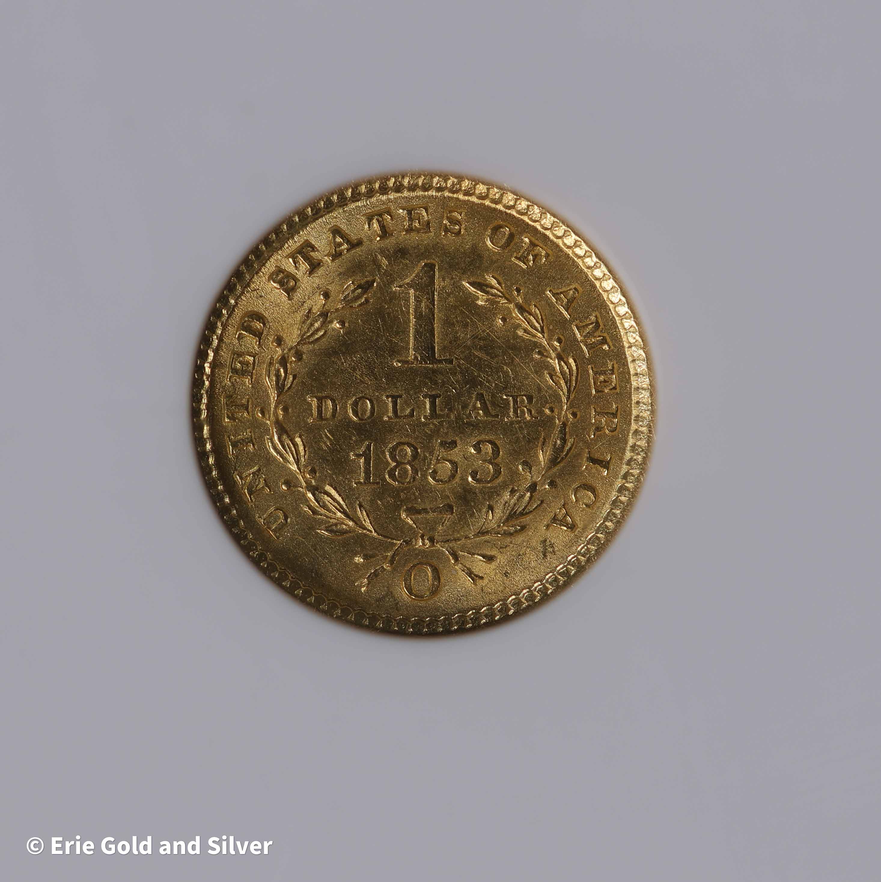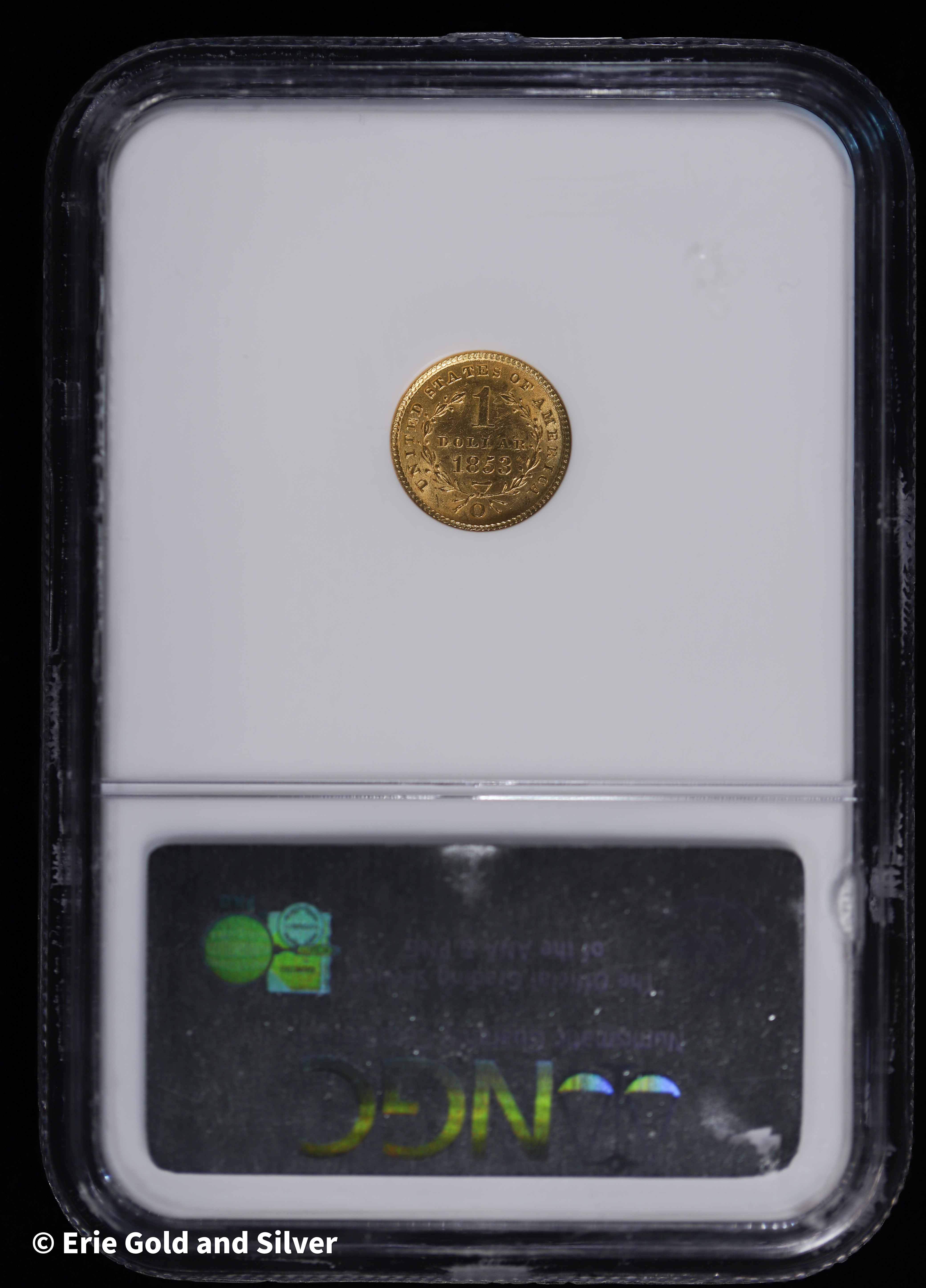 Add a scarce Southern mint issue to your collection with the 1853-O Liberty Head $1 Gold Coin. Struck at the historic New Orleans Mint, this classic U.S. gold dollar features the elegant Liberty Head design that defined early American gold coinage. Certified MS 62 by Numismatic Guaranty Company, this mint state example offers strong detail and attractive luster, making it a desirable piece for collectors of 19th-century U.S. gold coins.