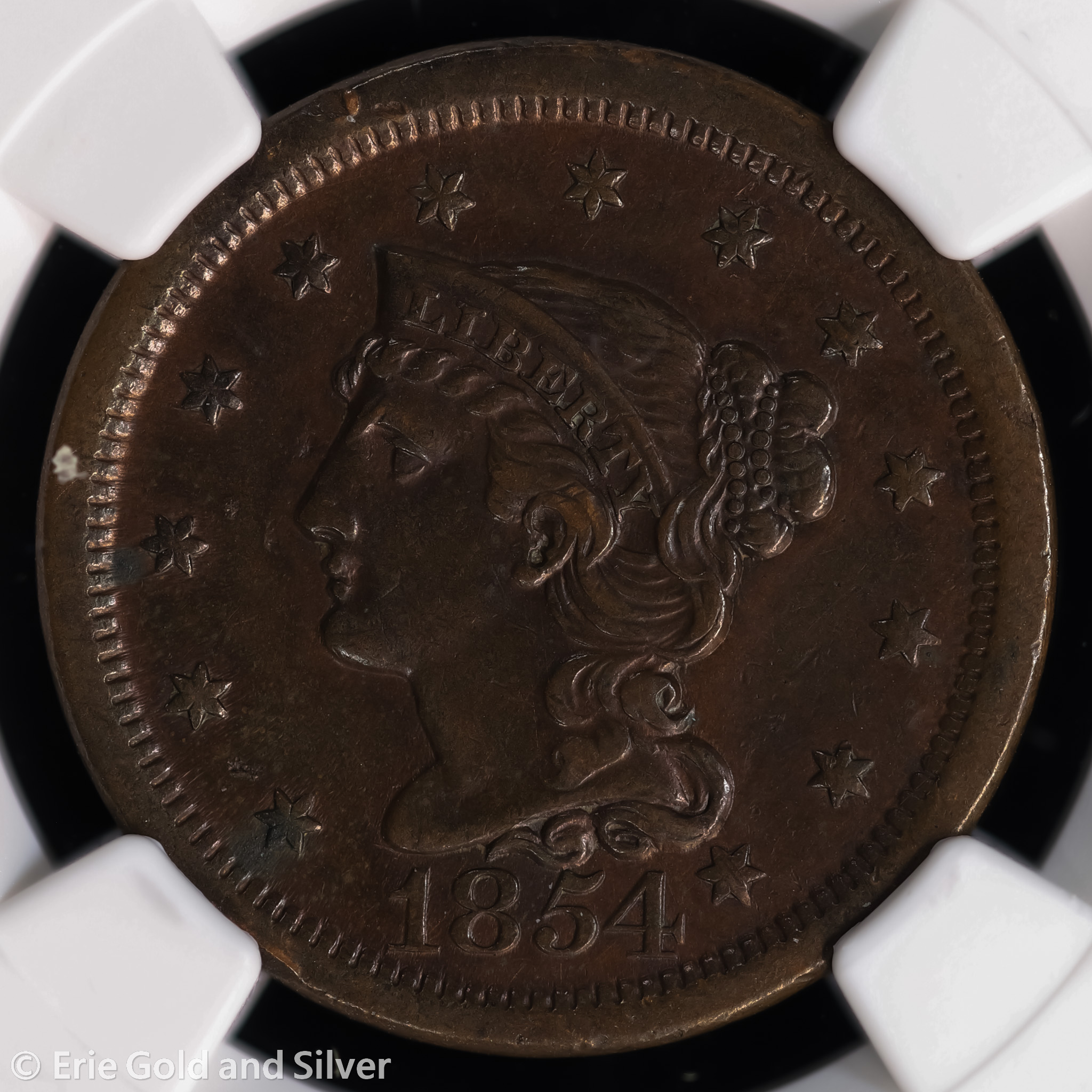 For sale is a 1854 Braided Hair Large Cent. Certified / graded by NGC at AU Details.