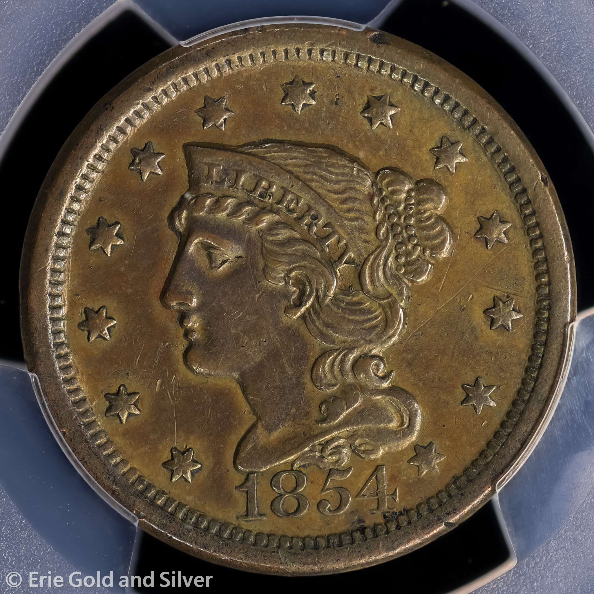 For sale is a 1854 Braided Hair Large Cent. Certified / graded by PCGS at Genuine XF Detail.