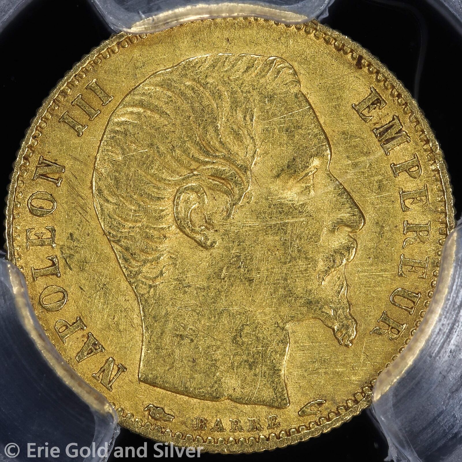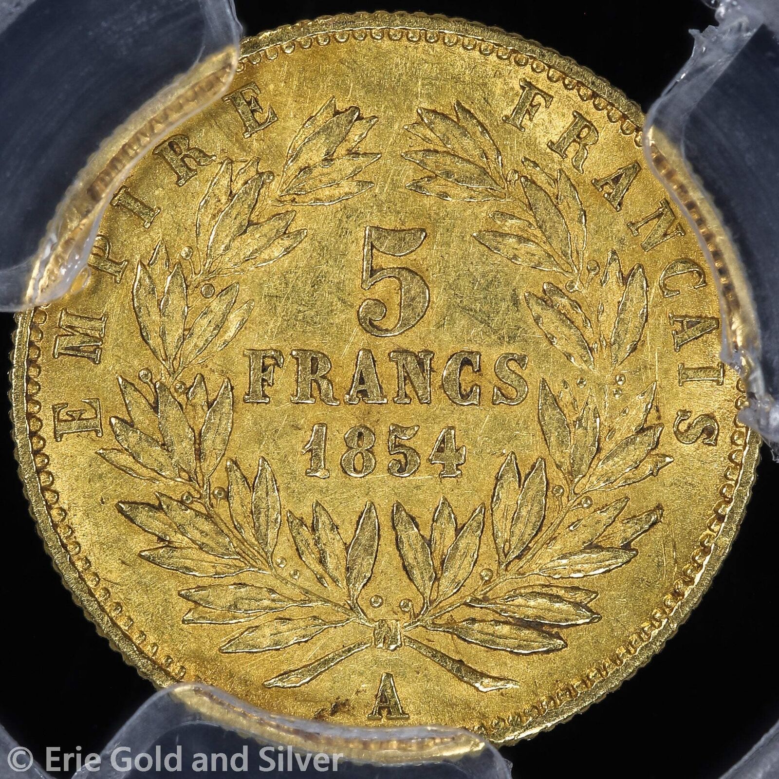 For sale is a 1854-A France Napoleon III Large Head 5 Francs Gold Coin. Certified / graded by PCGS at Genuine AU Detail. View pictures for details and condition. The coin pictured is the exact coin you will receive. Feel free to contact us with any questions.