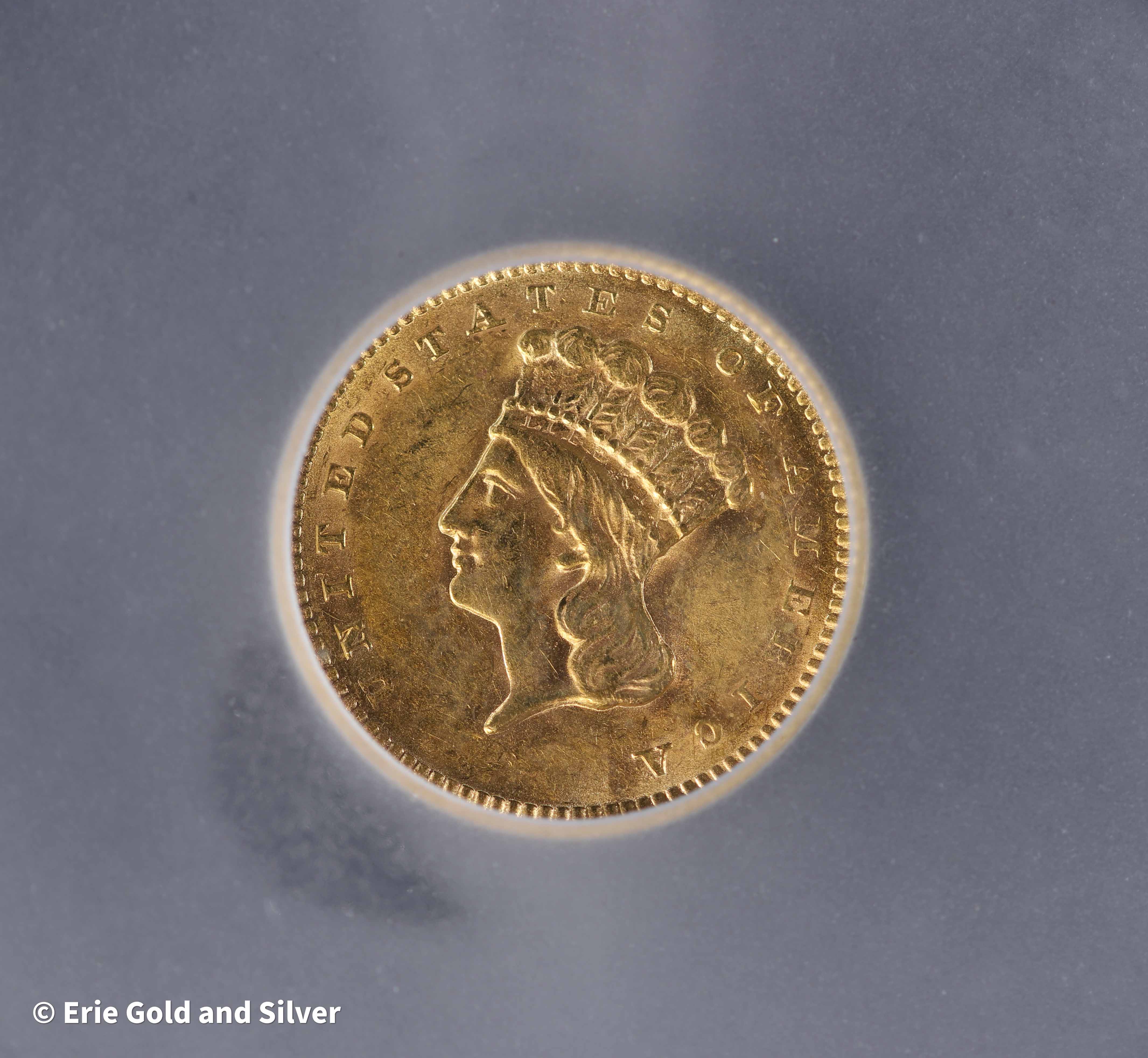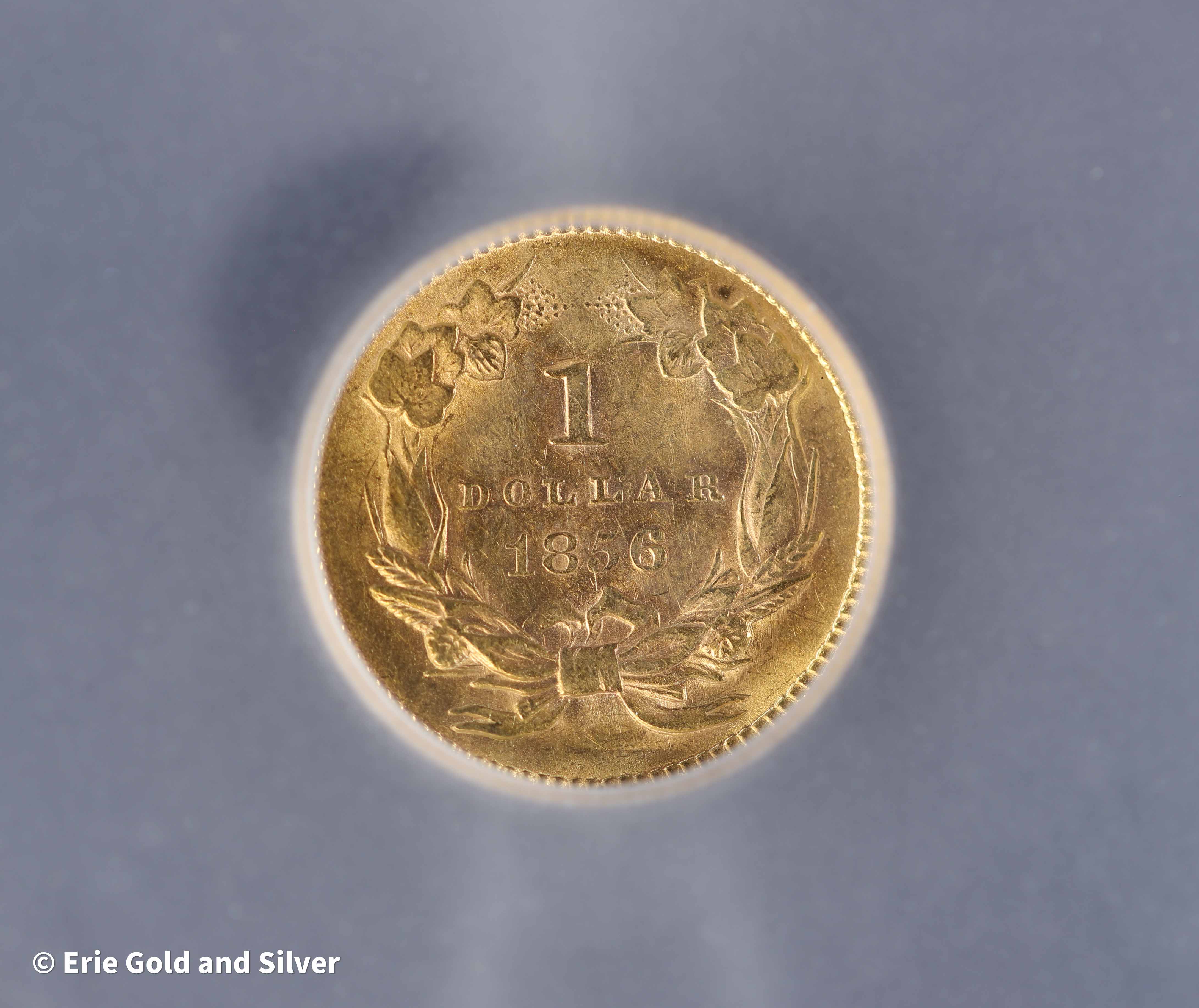 Add a historic U.S. gold rarity to your collection with the 1856 Indian Head Princess $1 Gold Coin – Slanted 5 Variety. Struck in solid gold, this classic coin features the distinctive Indian Head Princess design and the sought-after Slanted 5 date variety. Graded MS 61 by Independent Coin Graders, this mint state example retains strong detail and original character, making it an appealing piece for collectors of 19th-century American gold coinage.