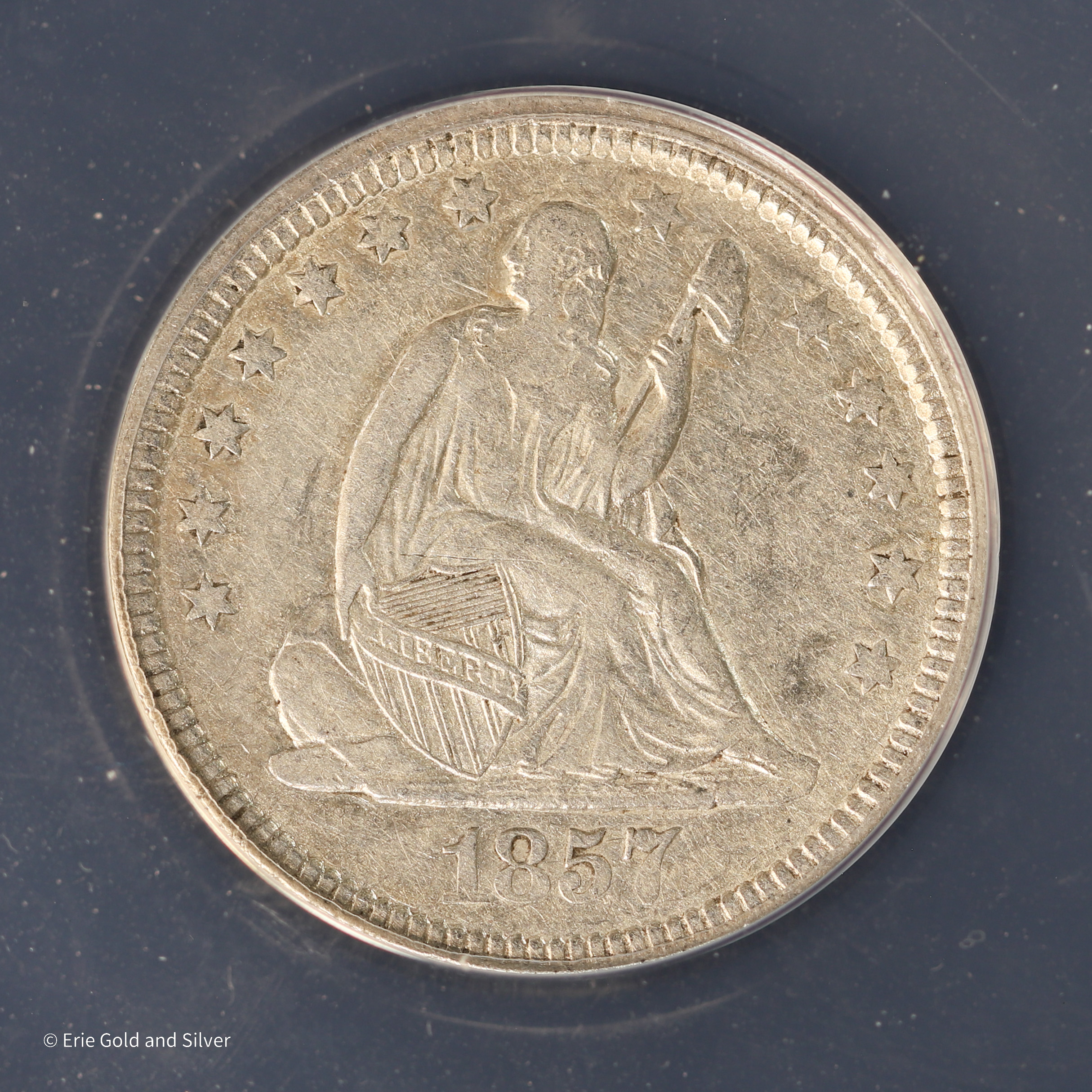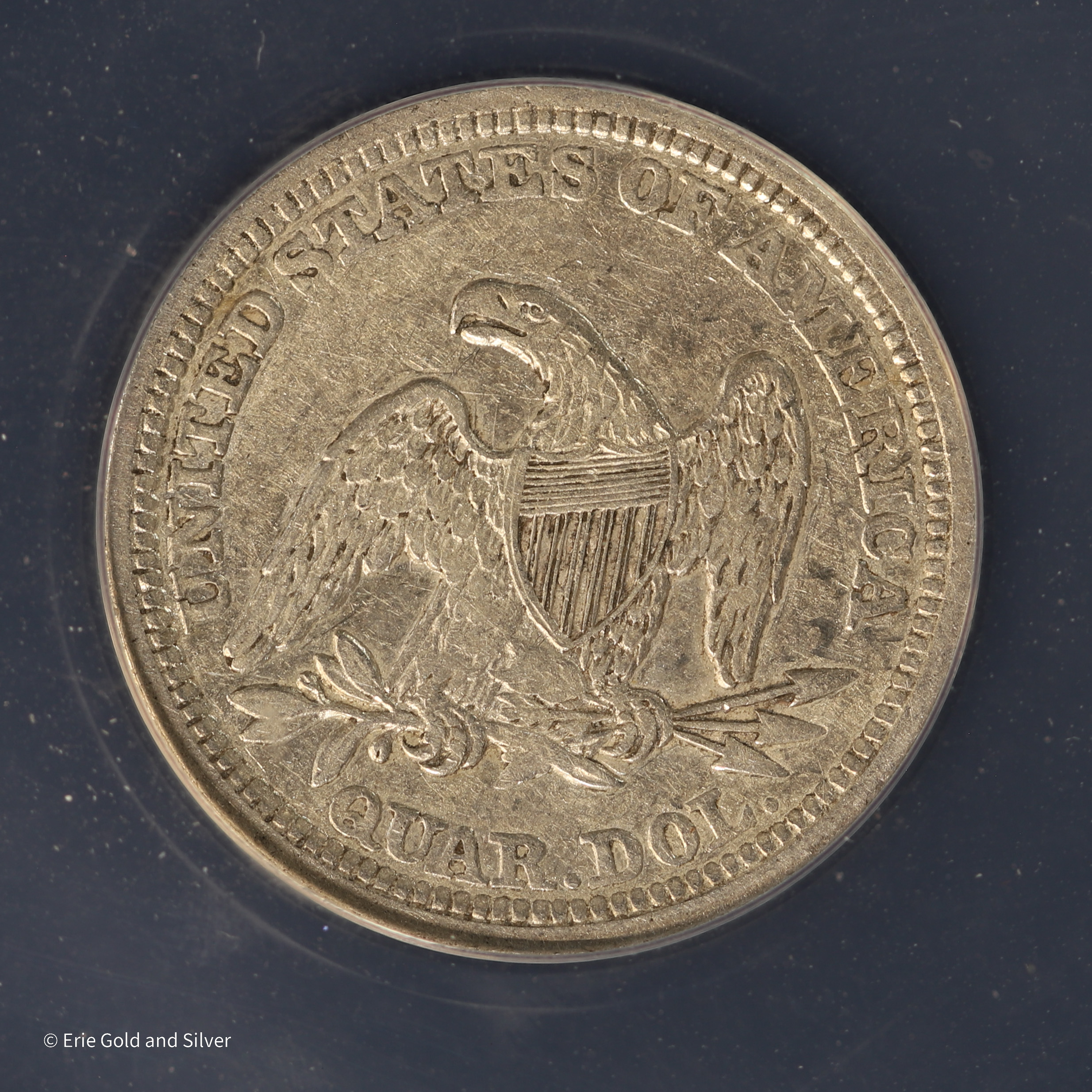 1857 25C Seated Liberty Quarter Reverse Clashed with 1857 Flying Eagle 1C Die ANACS EF 40 (Details) Cleaned