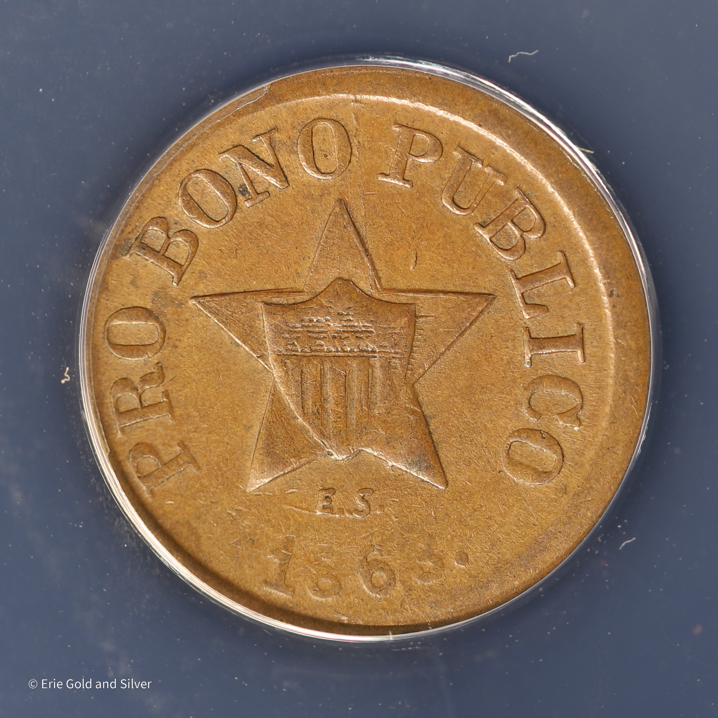 For sale is a 1863 Pro Bono Publico Patriotic Civil War Token. Certified / graded by ANACS at AU 50.