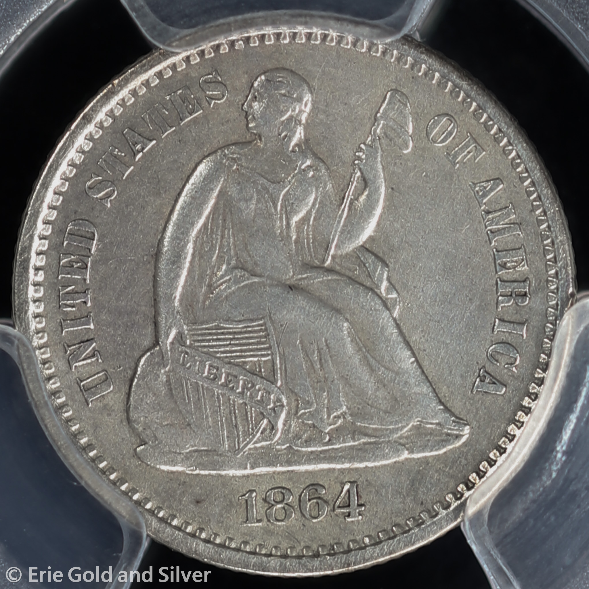 For sale is a 1864-S Seated Liberty Half Dime. Certified / graded by PCGS at Genuine AU Detail.