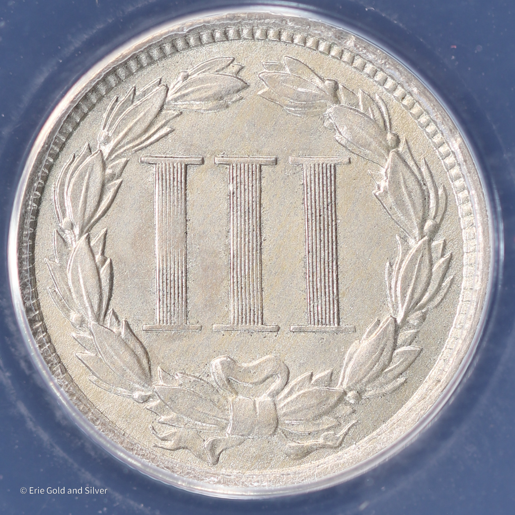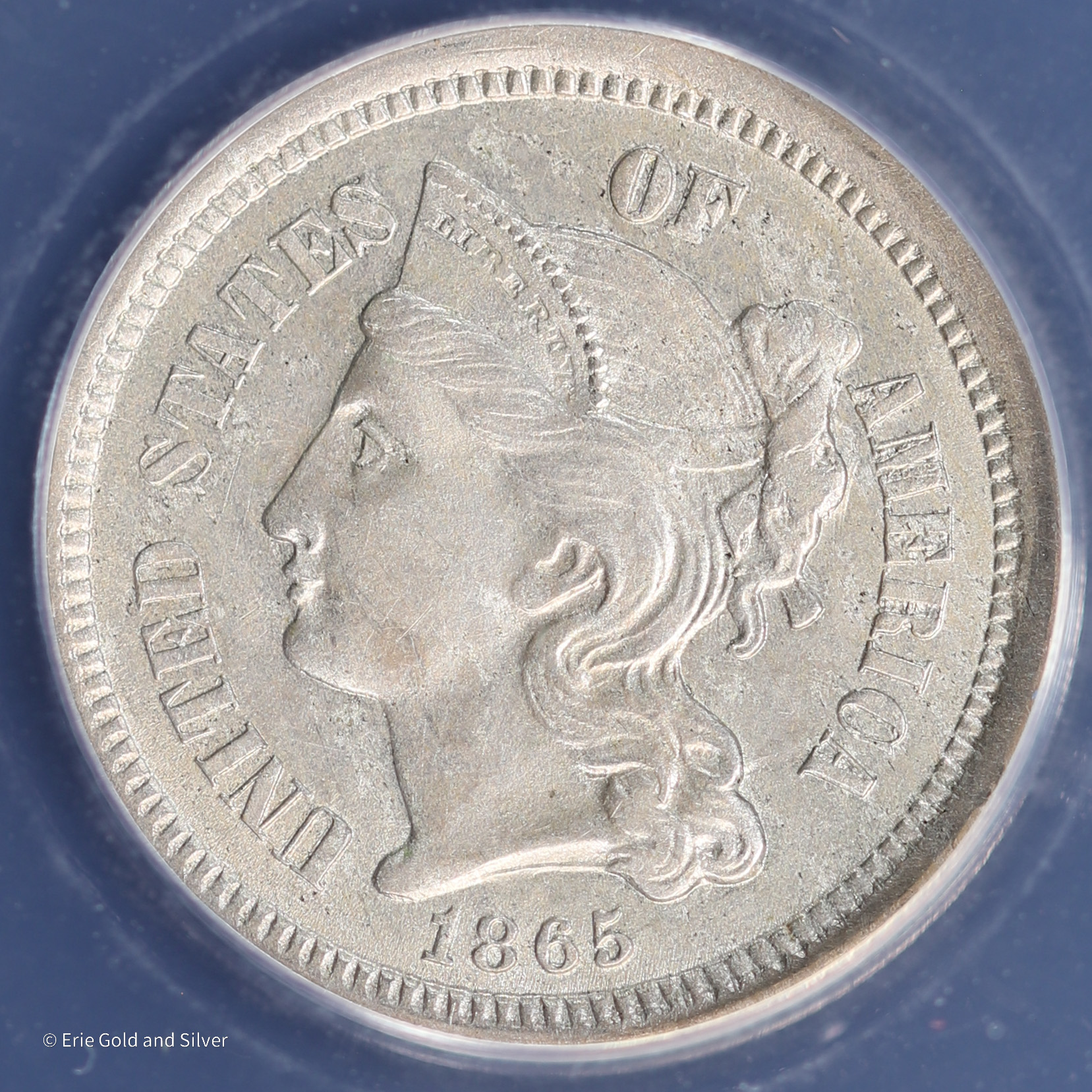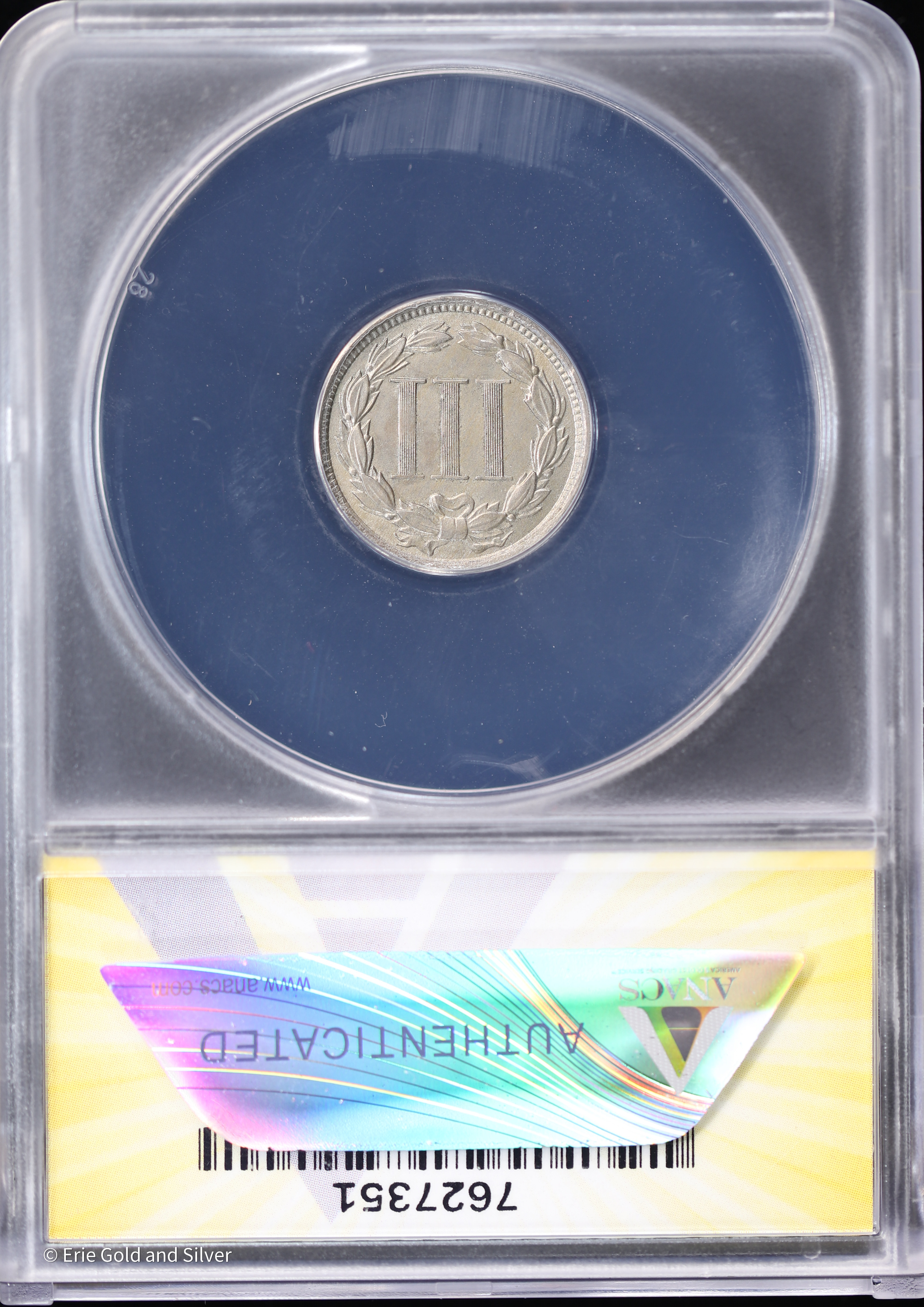For sale is a 1865 3C Nickel Three Cent. Graded / Certified by ANACS at AU 58.