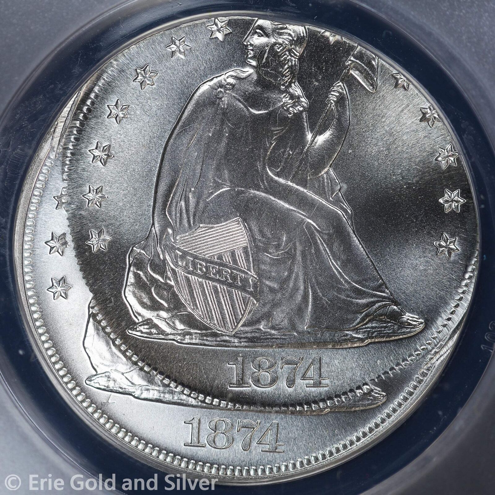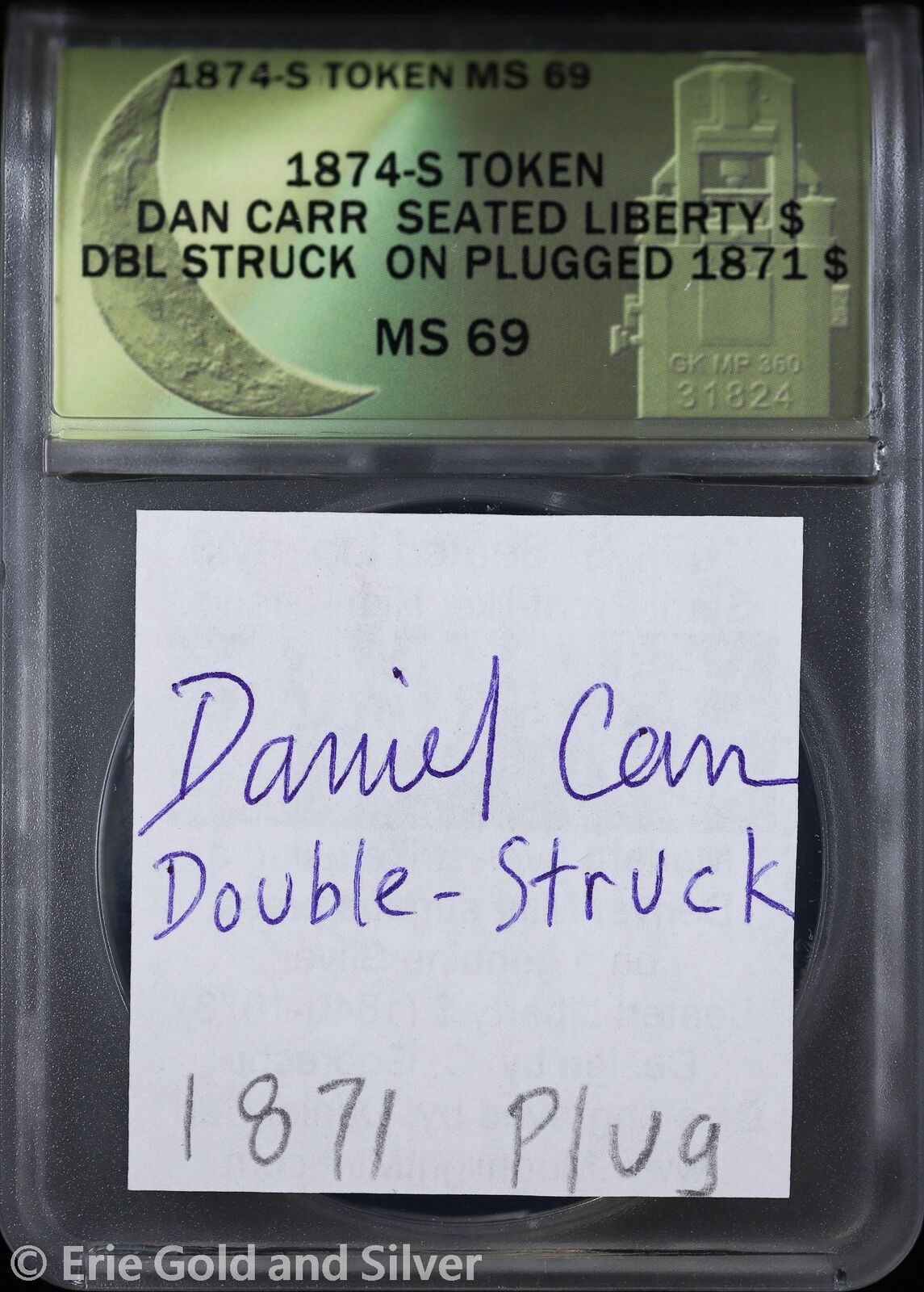 1874-S Dan Carr Seated Liberty Dollar Token ANACS MS 69 | DBL Struck on Plugged