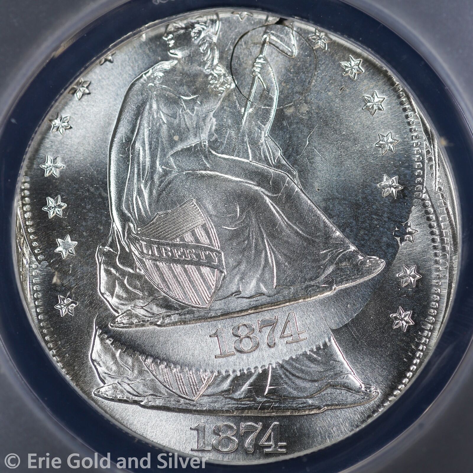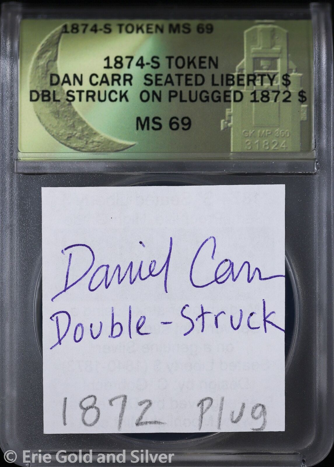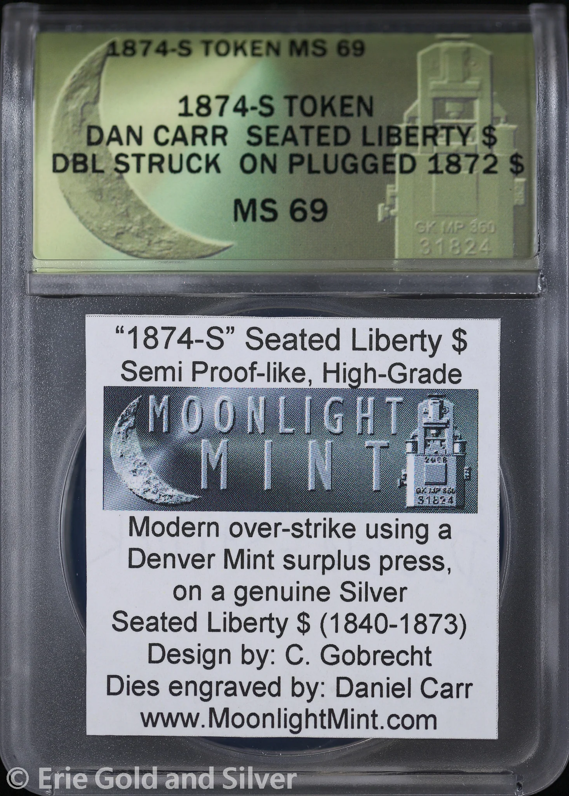 1874-S Dan Carr Seated Liberty Dollar Token ANACS MS 69 | DBL Struck on Plugged