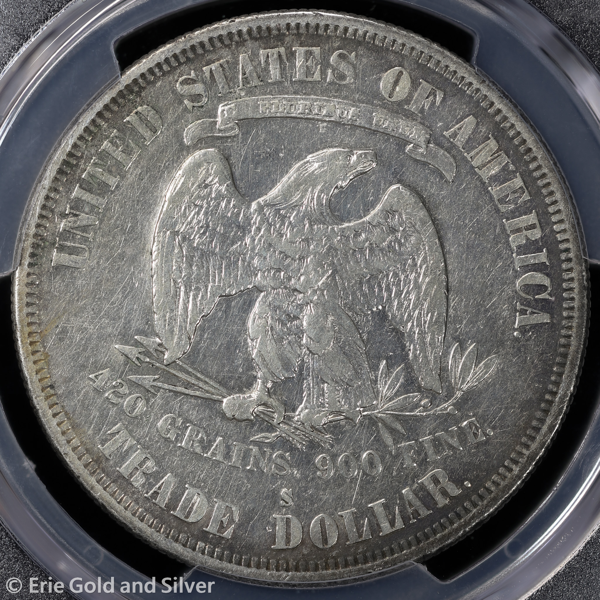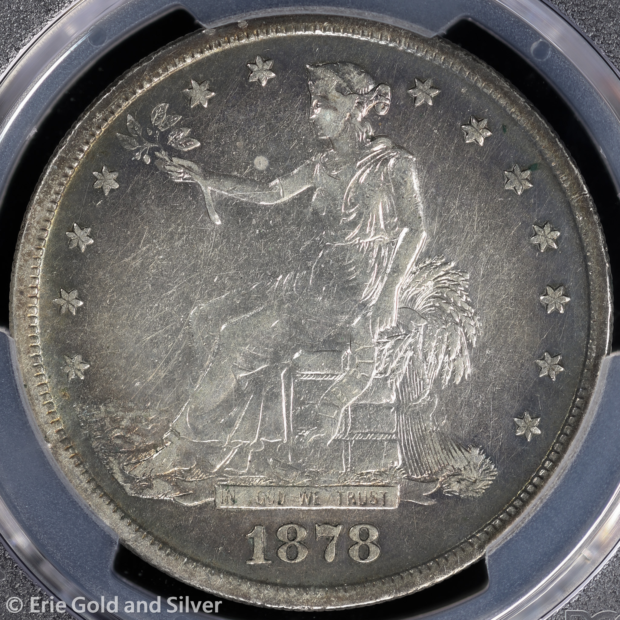 For sale is a 1878-S Silver Trade Dollar. Certified / graded by PCGS at Genuine VF Detail.