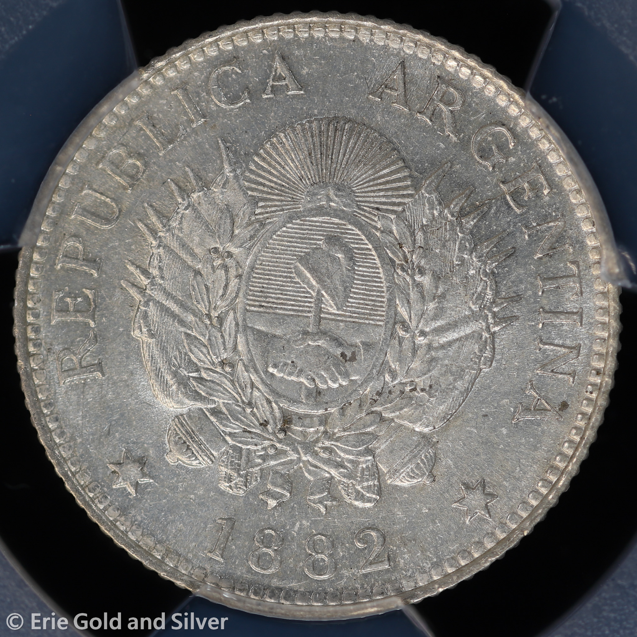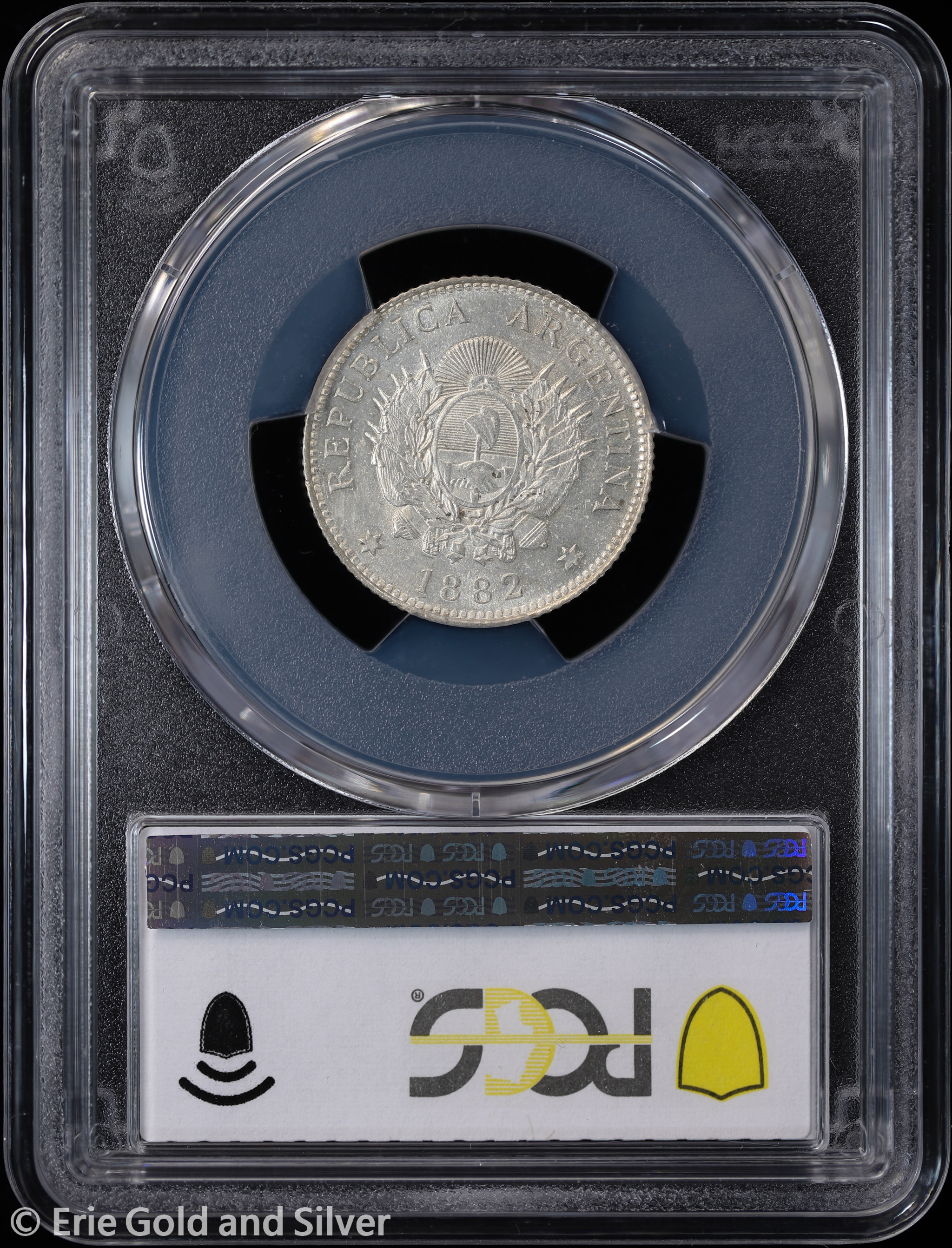 For sale is a 1882 Argentina Silver 20 Centavos Coin. Certified / graded by PCGS at MS 61.