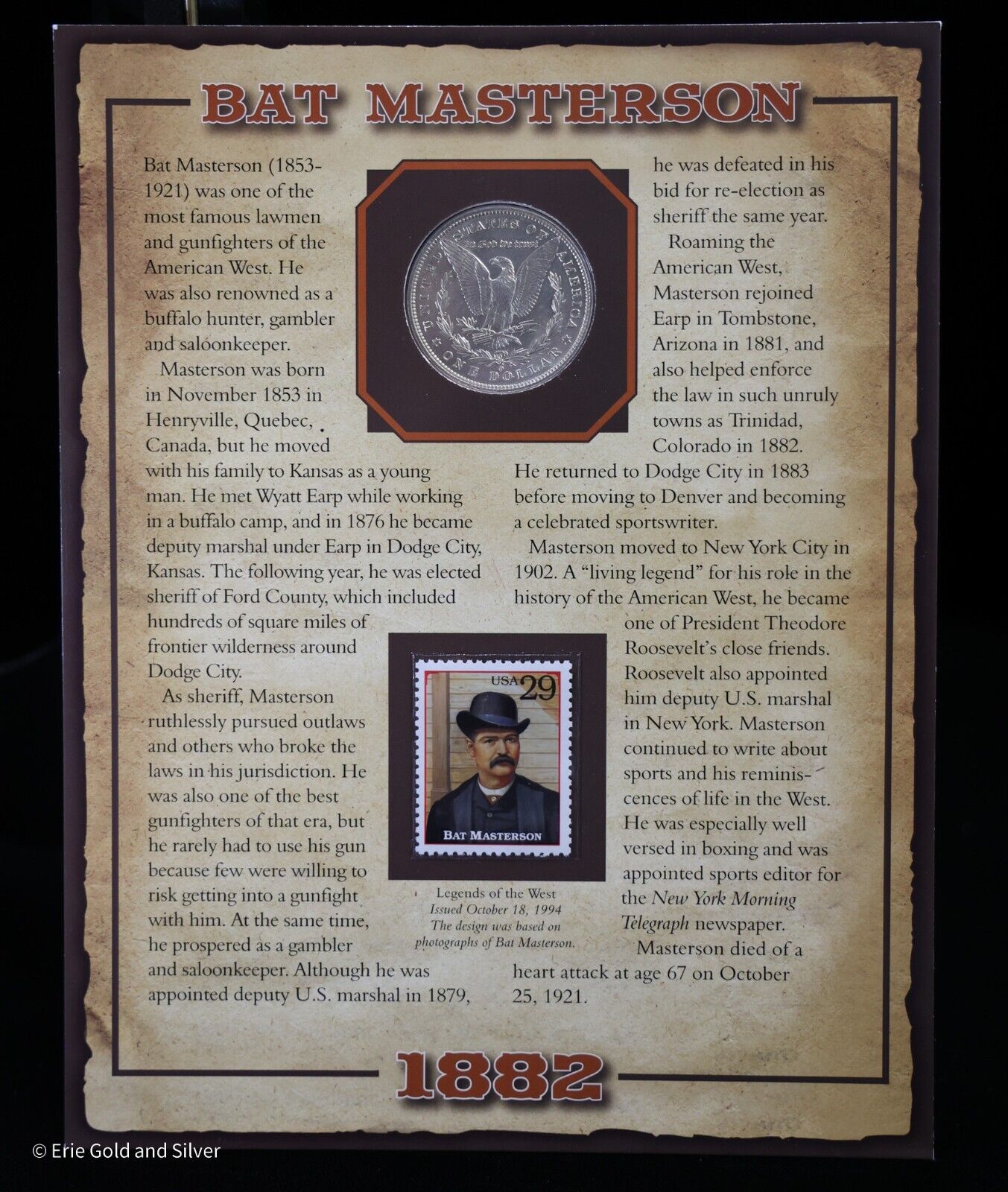 1882 Morgan Silver Dollar Legends of the West w/ Bat Masterson Stamp