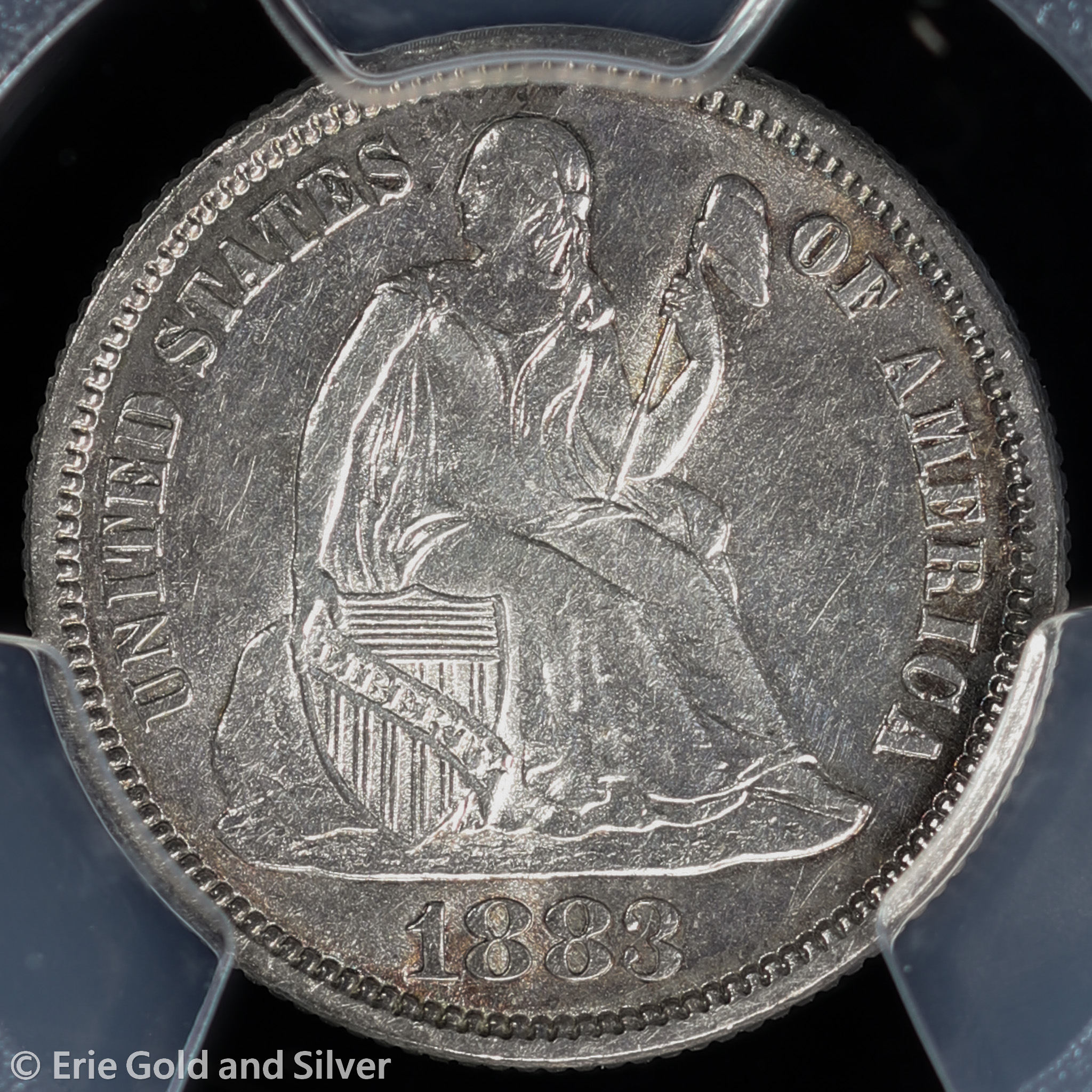 For sale is a 1883 Seated Liberty Dime. Certified / graded by PCGS at Genuine AU Detail.