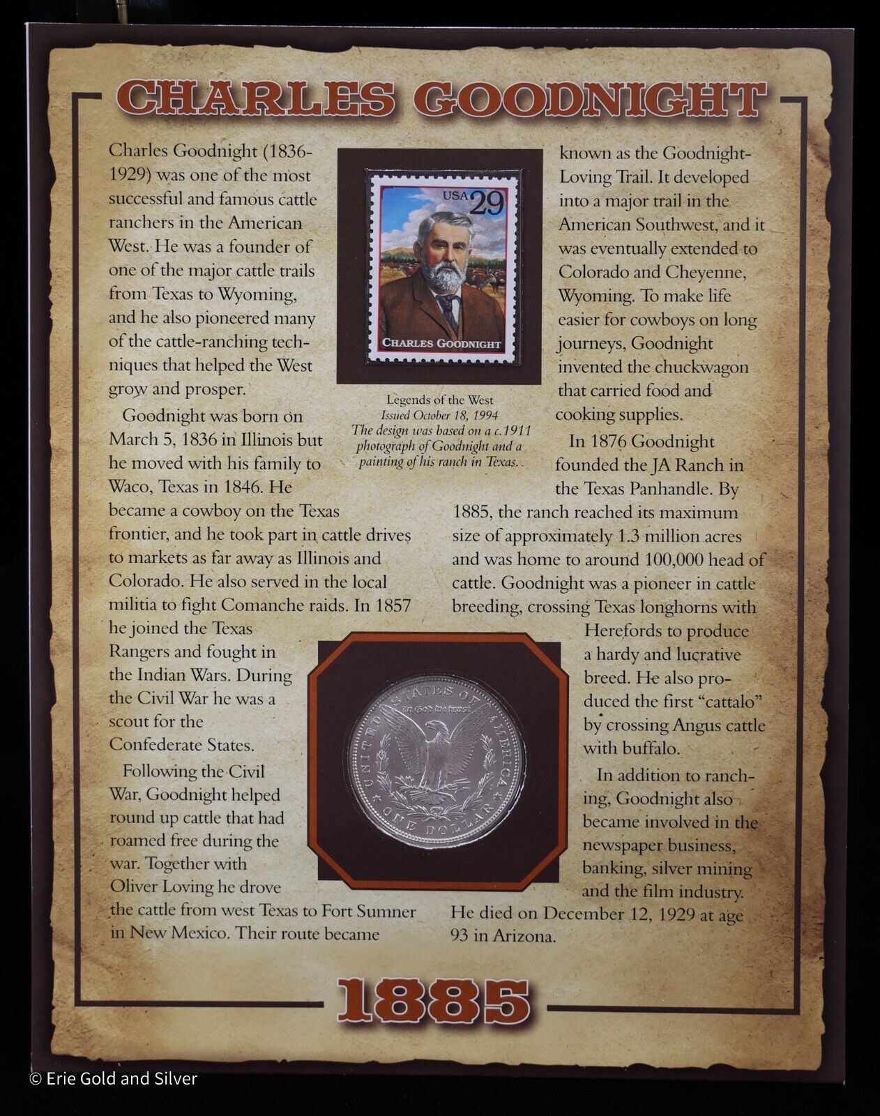 1885 Morgan Silver Dollar Legends of the West w/ Charles Goodnight Stamp