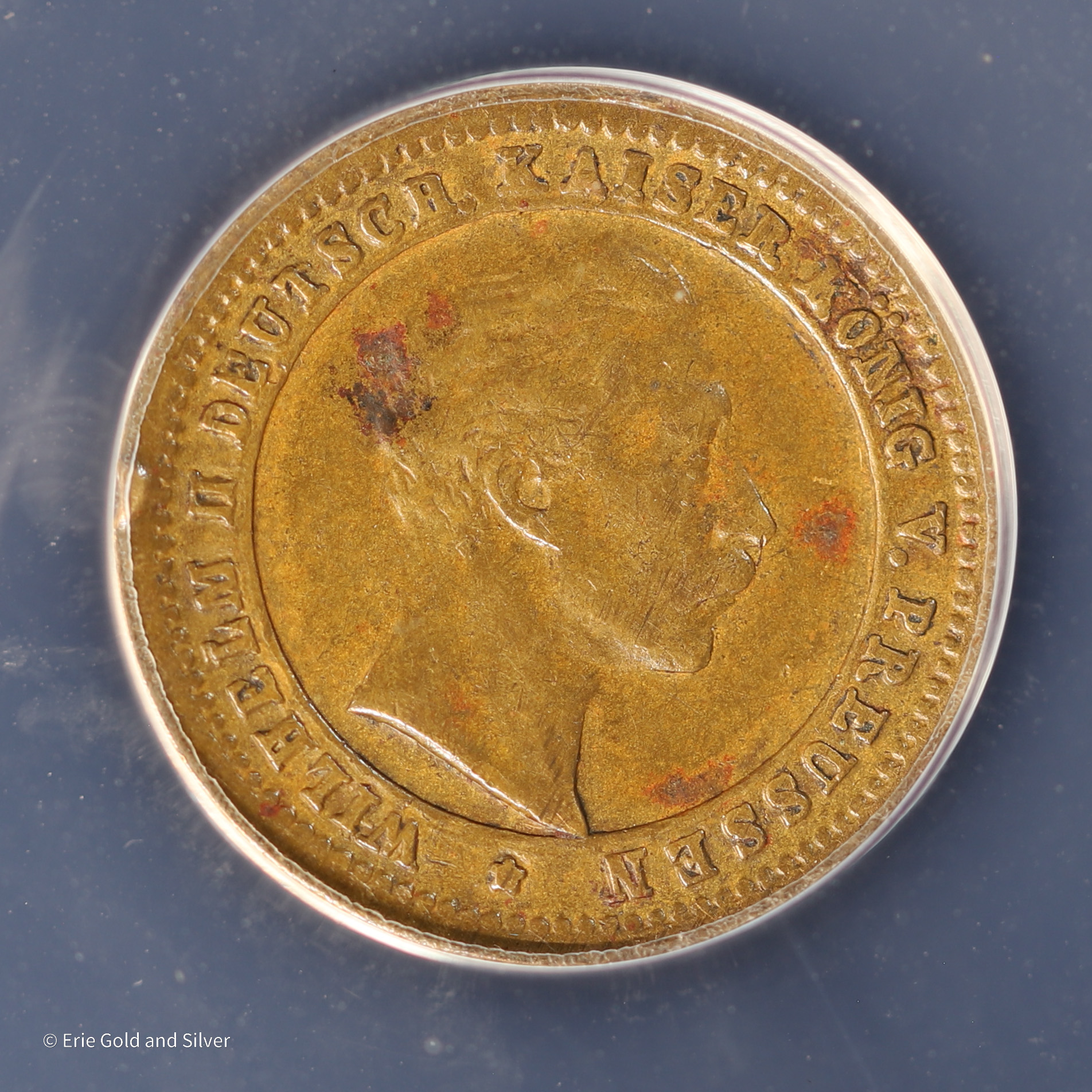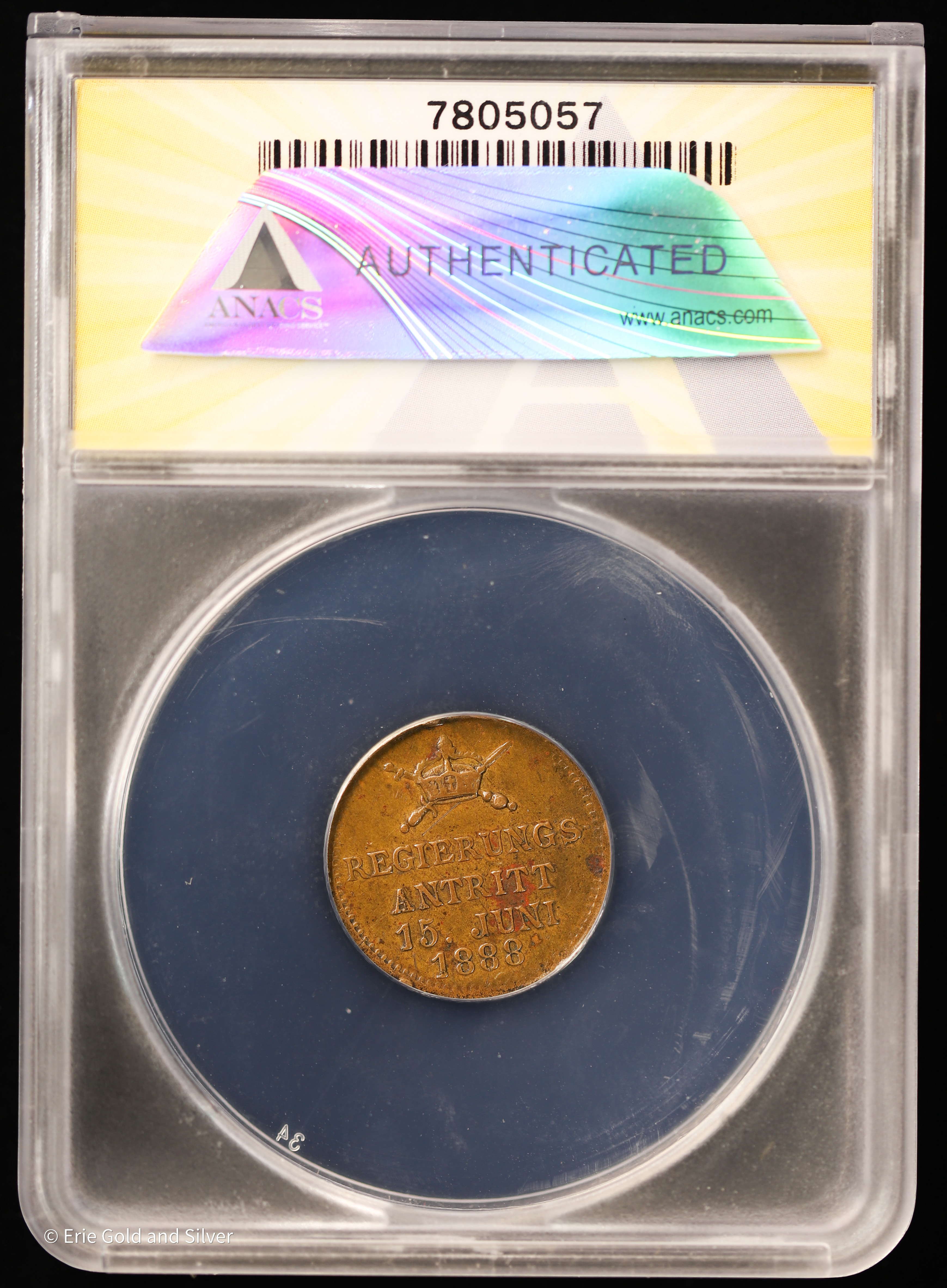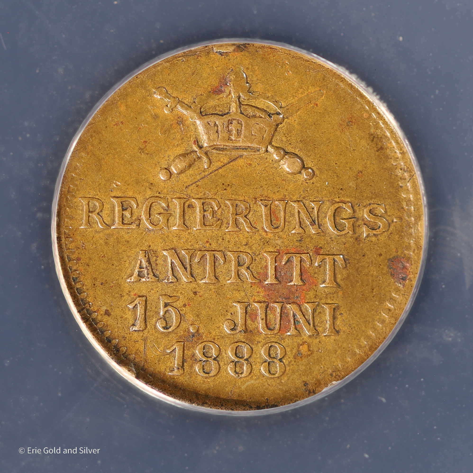 1888 Medal Wilhelm II King of Prussia ANACS EF 45 (Details) 19mm Mount Removed, Damaged, Regierungs Antritt on reverse.