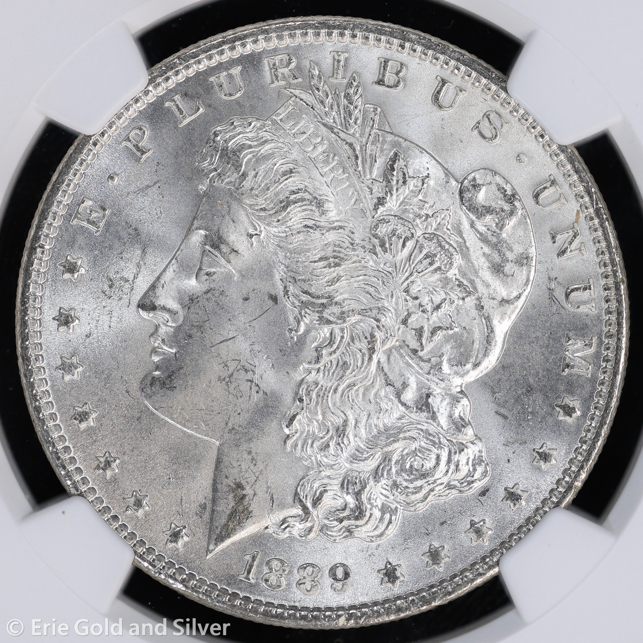 For sale is a 1889-P Morgan Silver Dollar. Certified / graded by NGC at MS 64+.