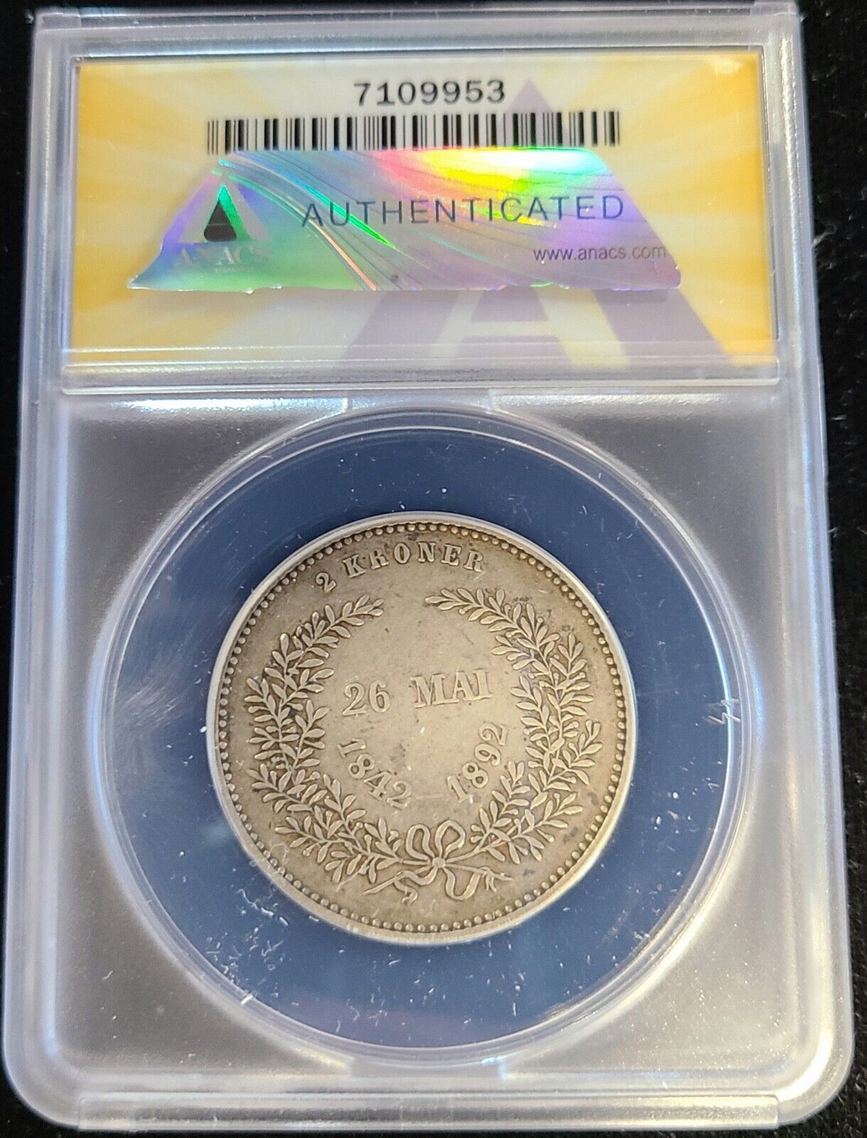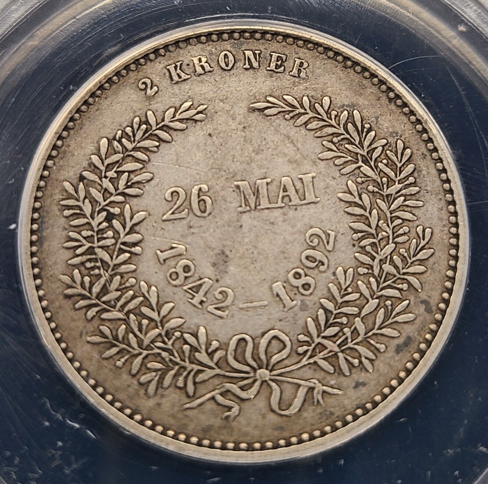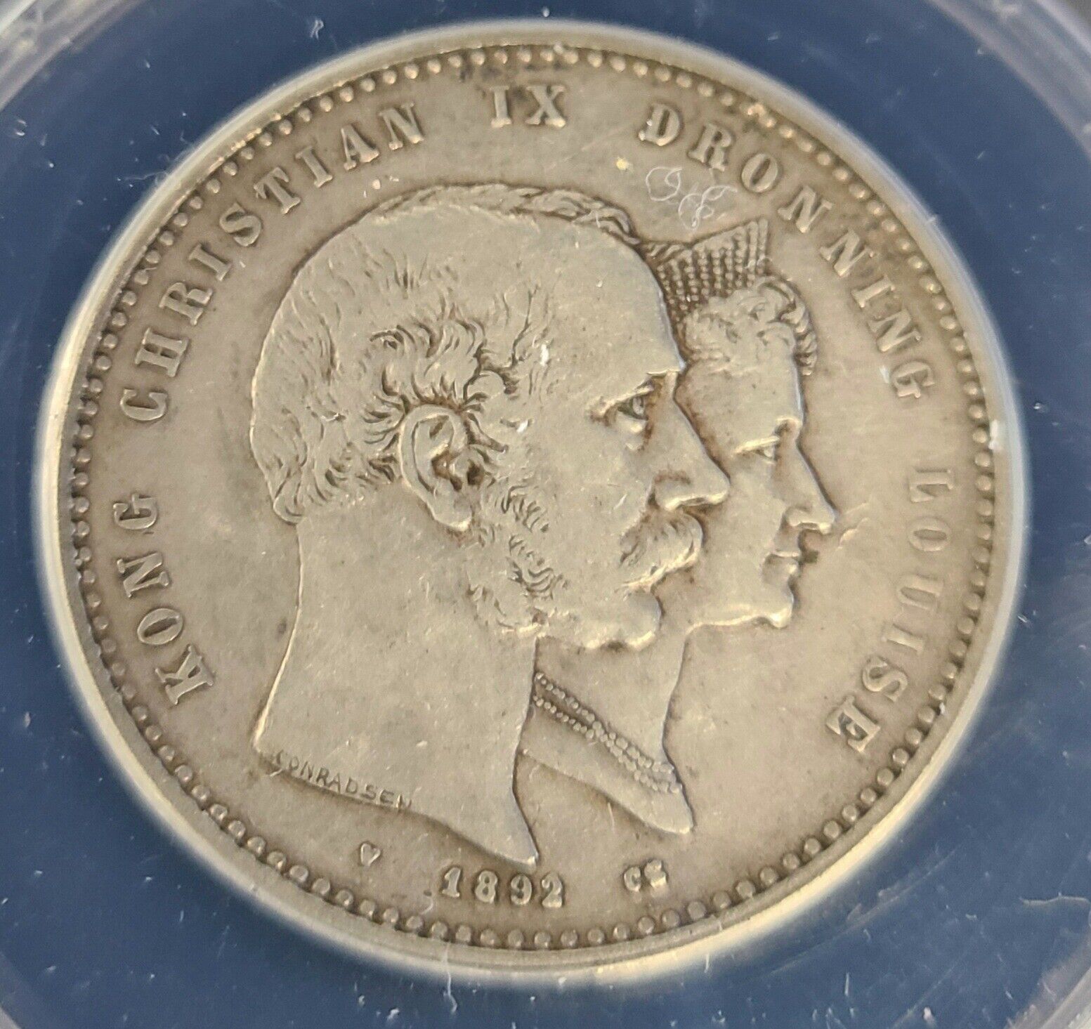 1892-(H) CS Denmark Silver 2 Kroner Golden Wedding Anniversary ANACS VF 35