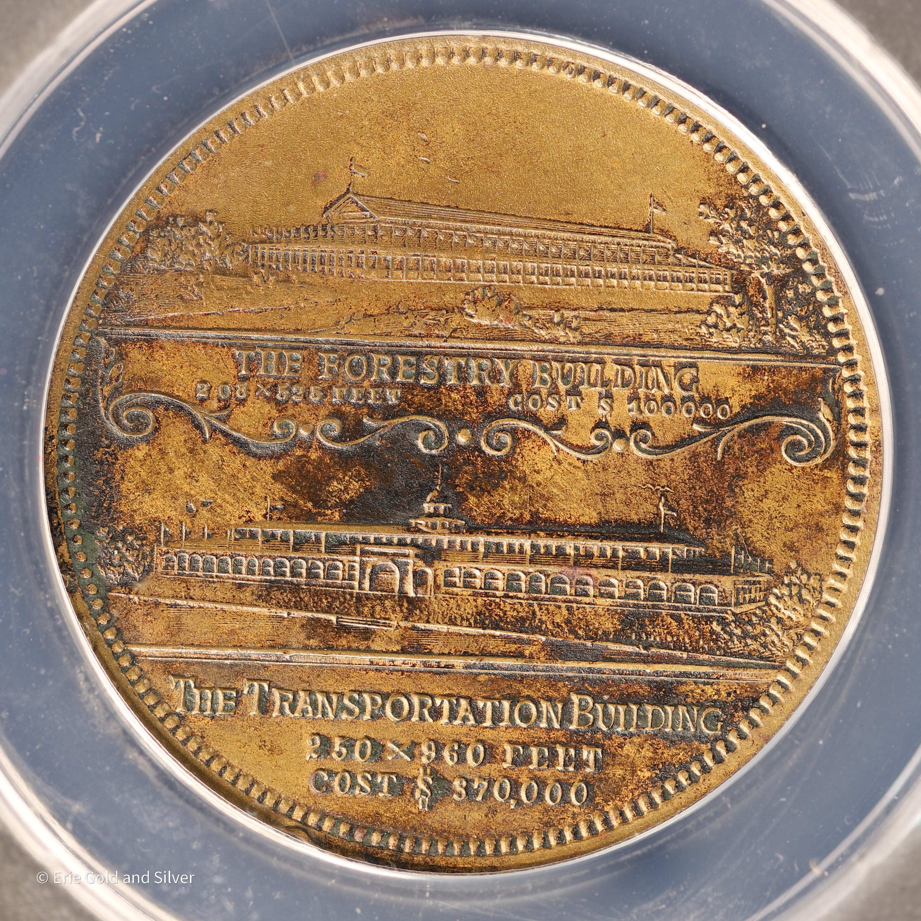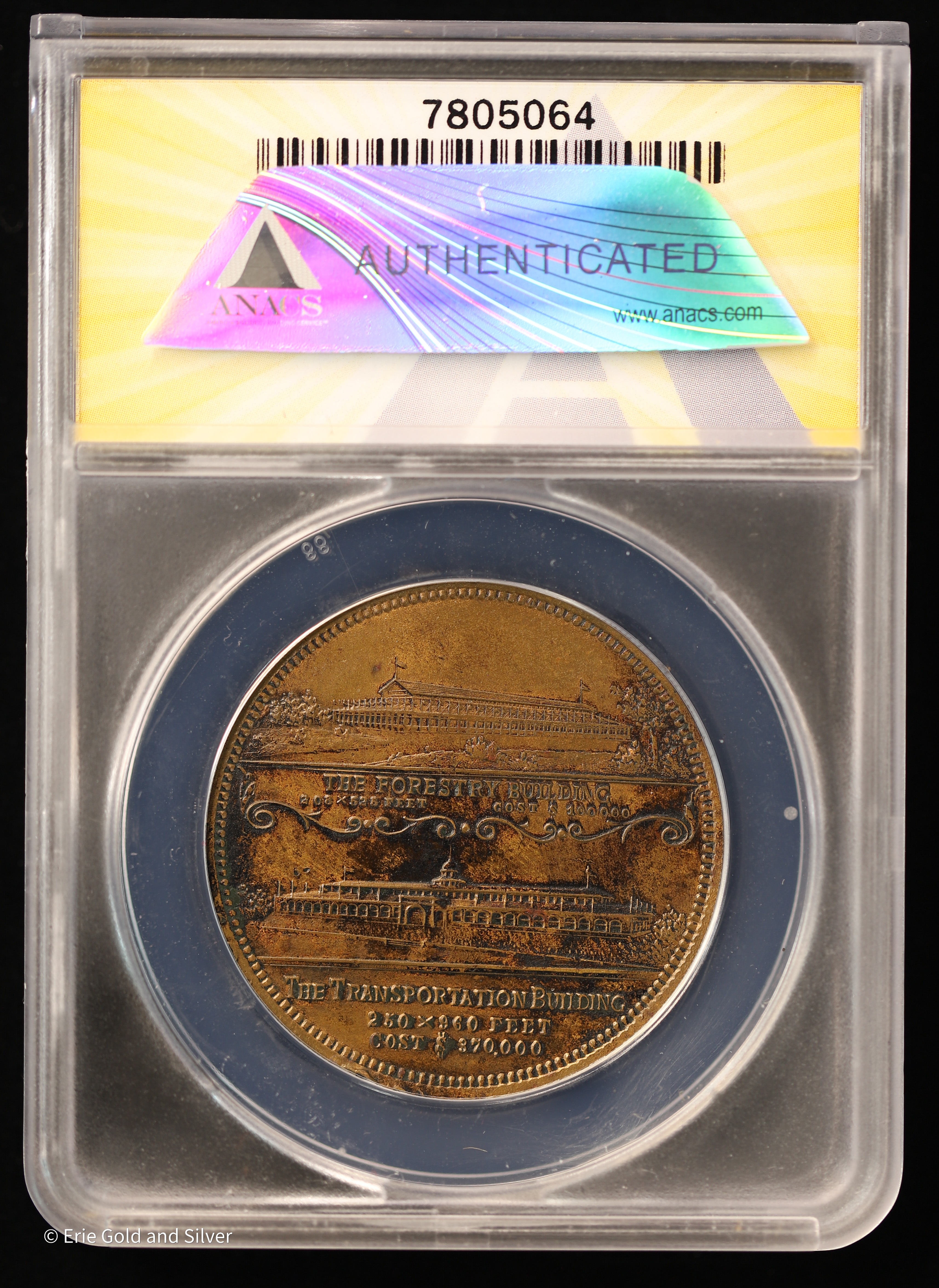 For sale is a 1893 World's Columbian Exposition Medal. Certified / graded by ANACS at AU 58. Reverse of medal showcases the Forestry Building and the Transportation Building.