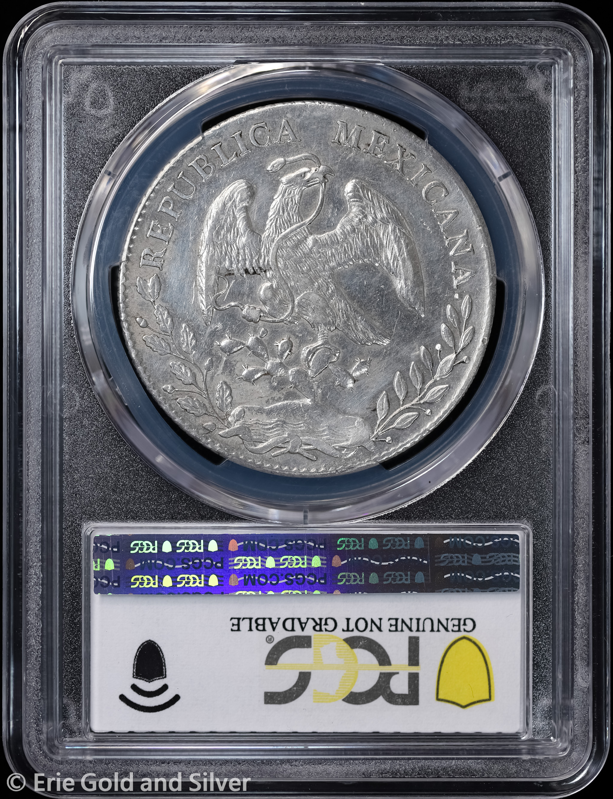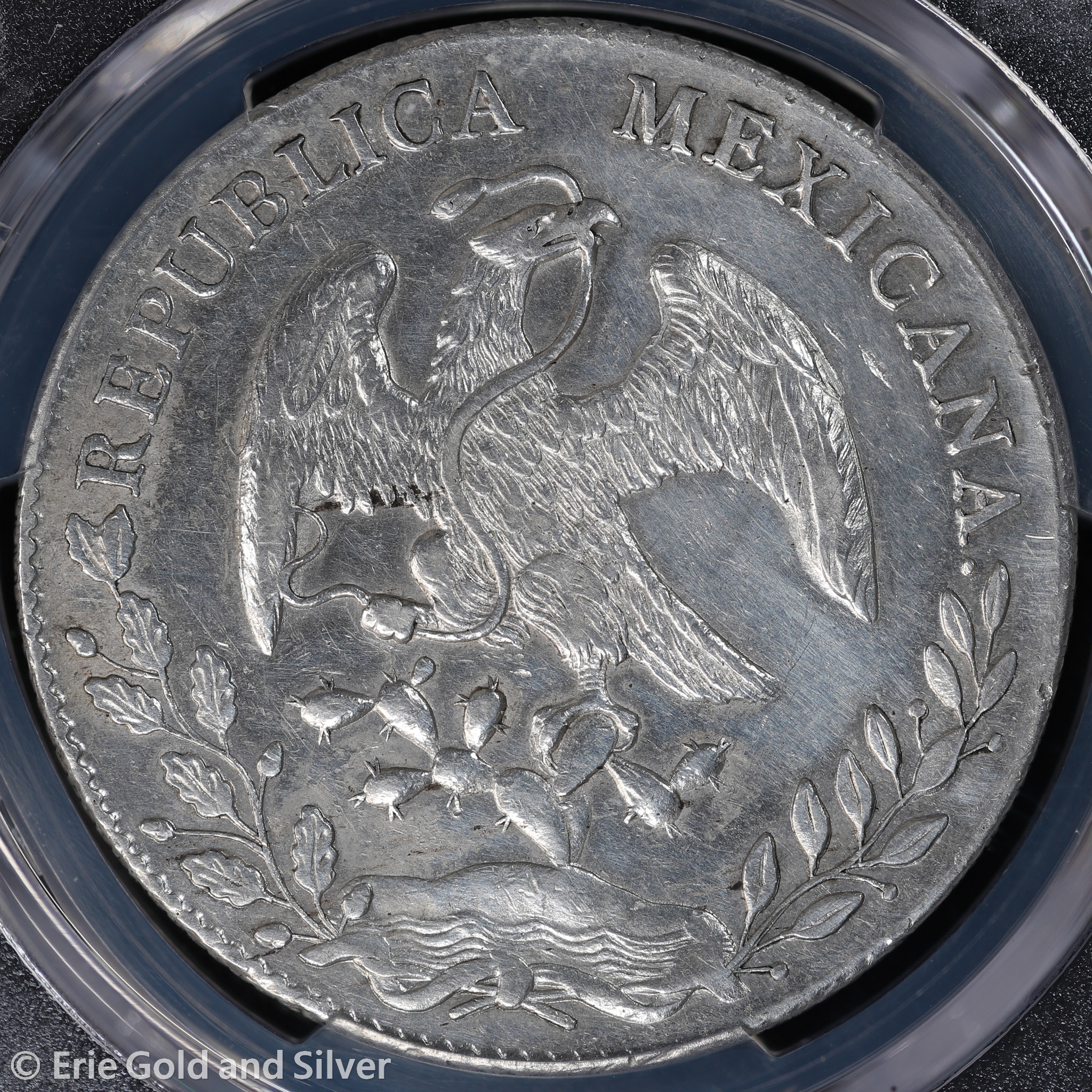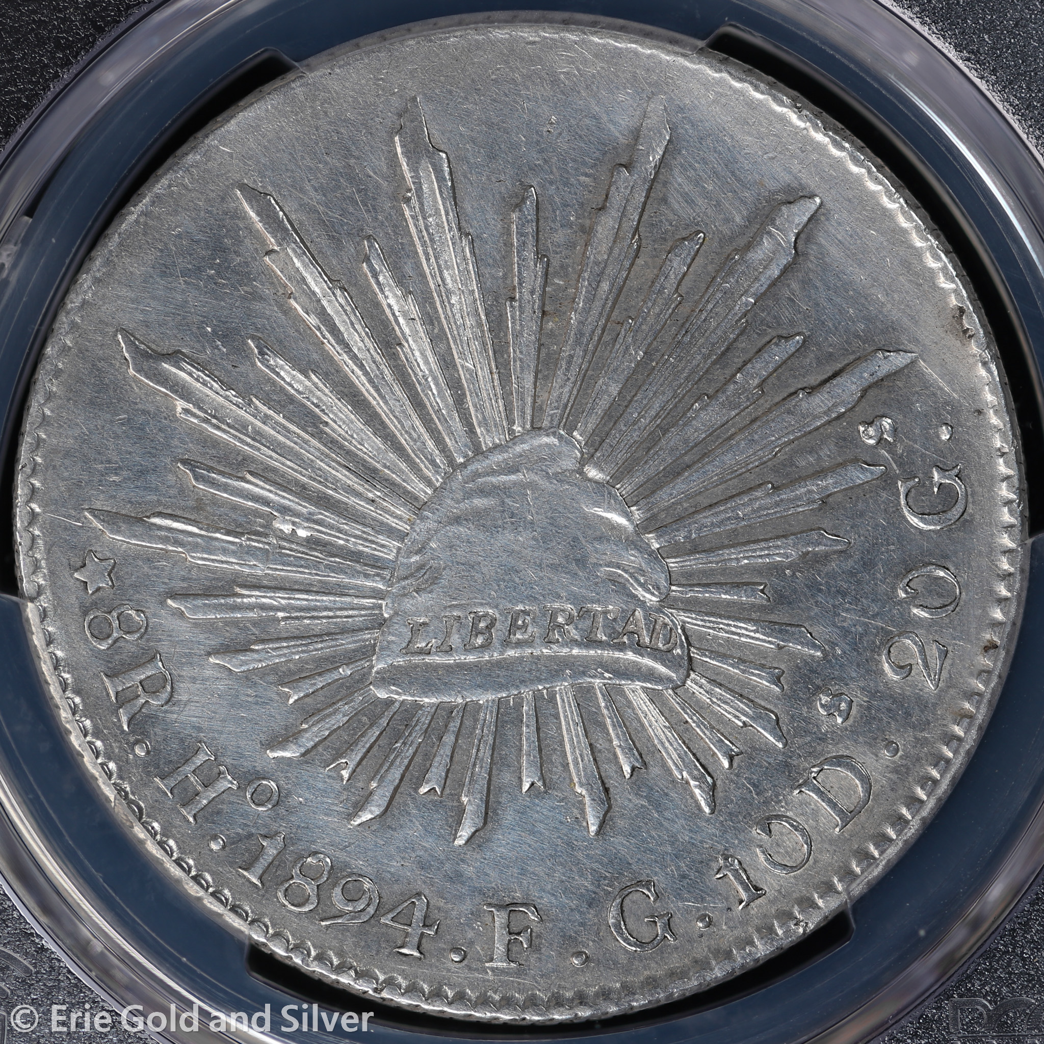 For sale is a 1894-Ho FG Mexico Silver 8 Reales Coin. Certified / graded by PCGS at Genuine AU Detail.
