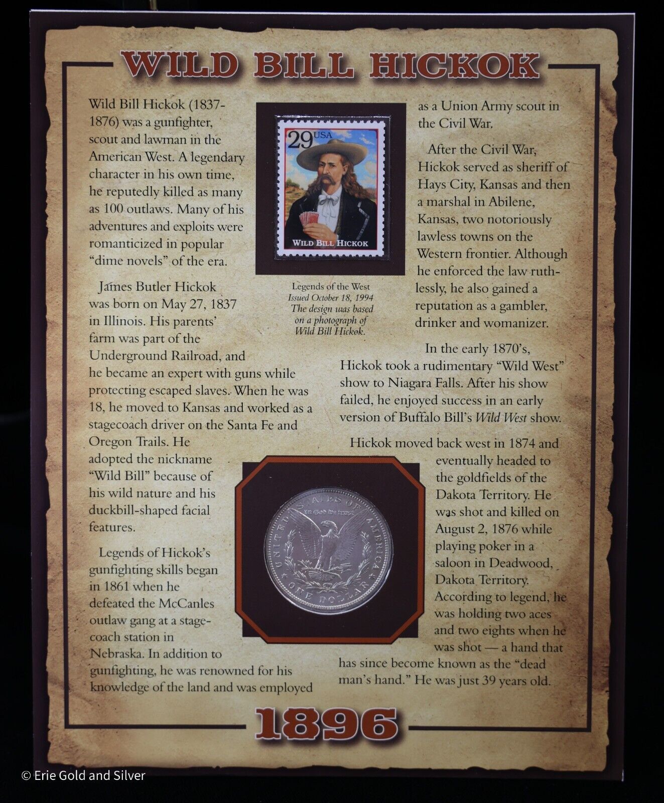 1896 Morgan Silver Dollar Legends of the West w/ Wild Bill Hickok Stamp