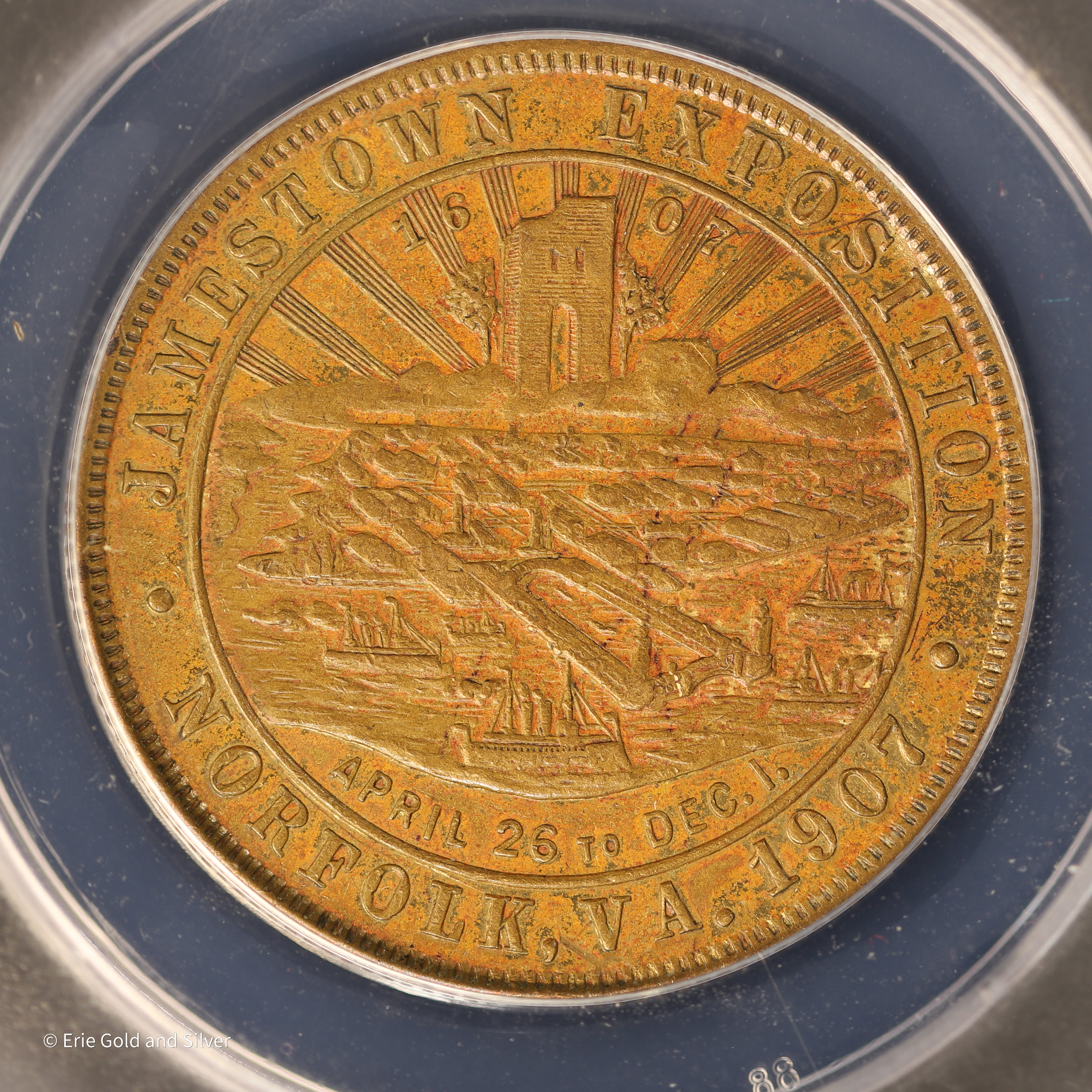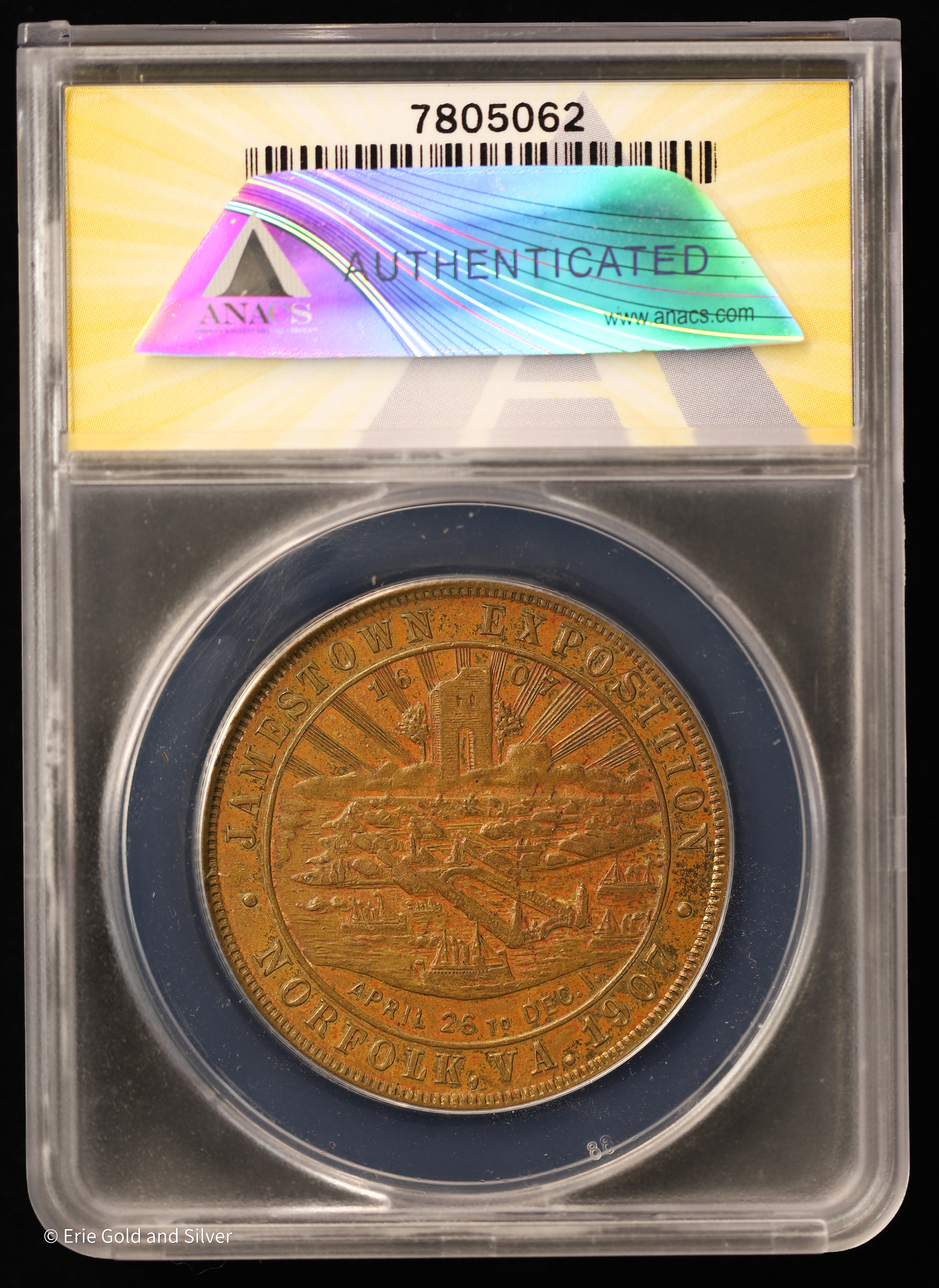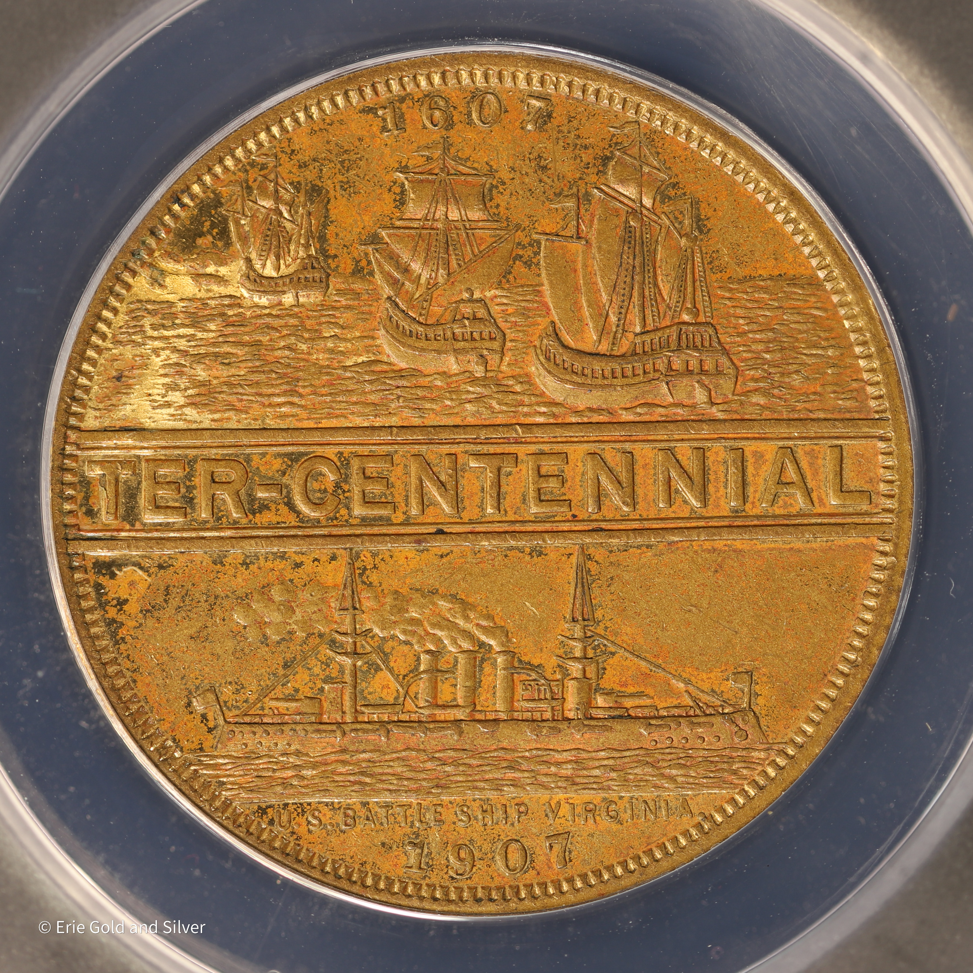 For sale is a 1907 Jamestown Ter-Centennial Medal So-Called $. Certified / graded by ANACS at AU 50 Gilt. Commemorates the 300th anniversary of Jamestown.