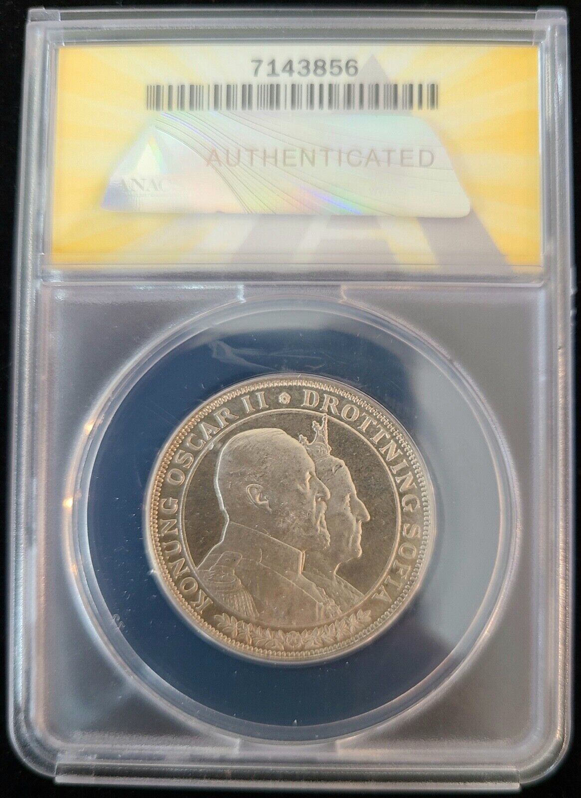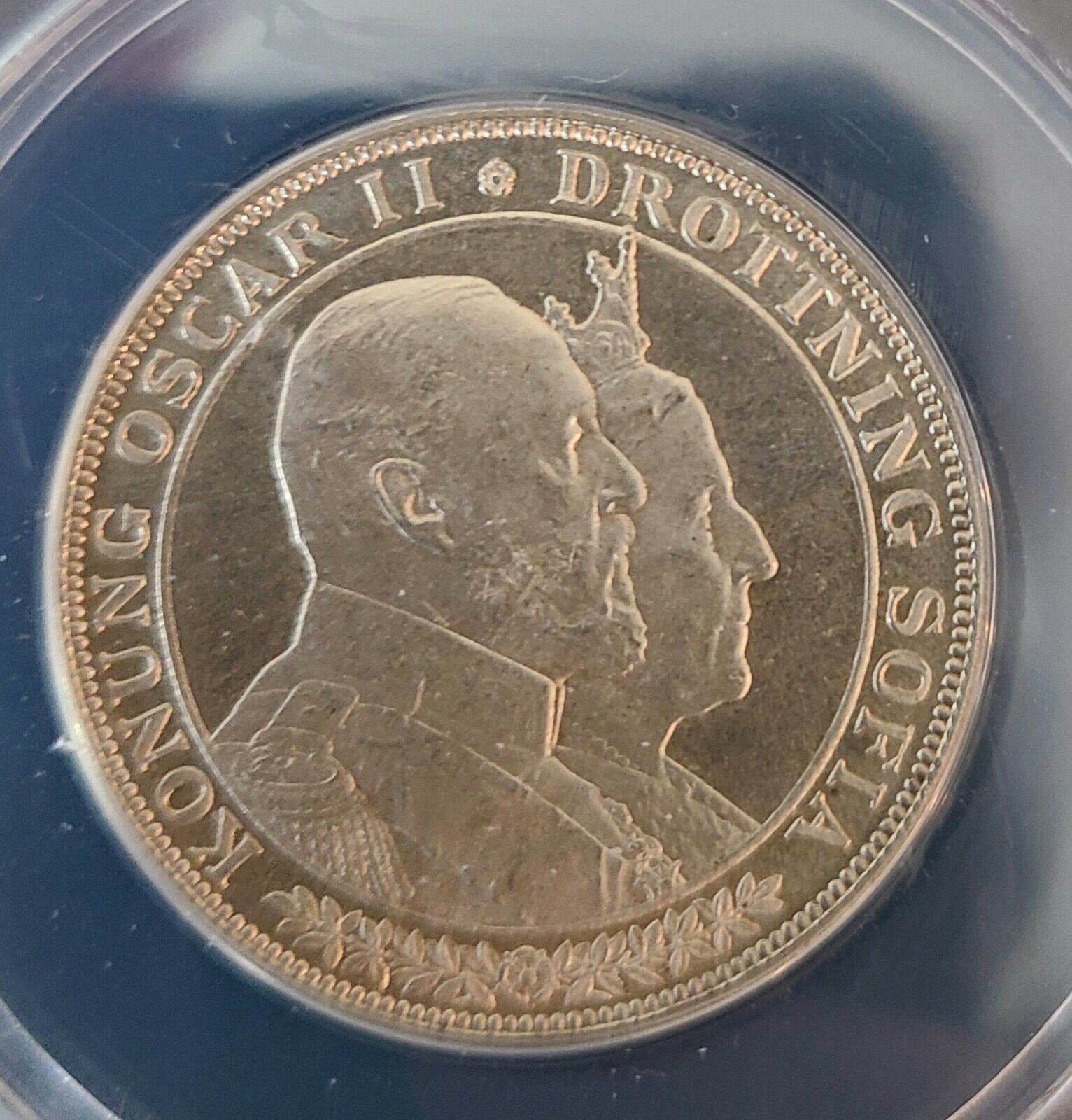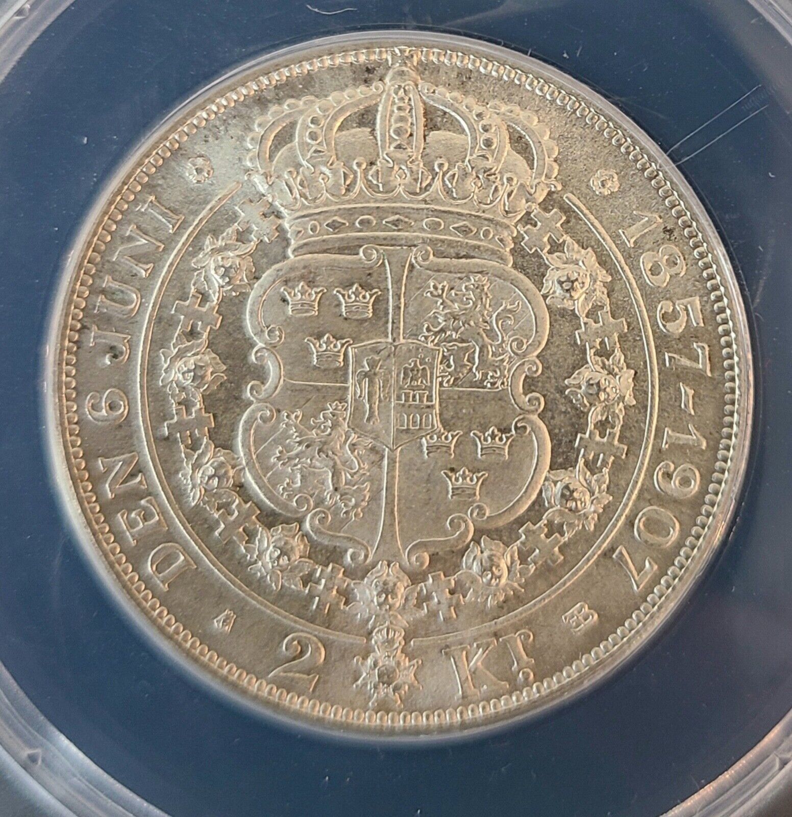 1907 Sweden Oscar II Golden Wedding Anniversary Silver 2 Kroner ANACS MS 65