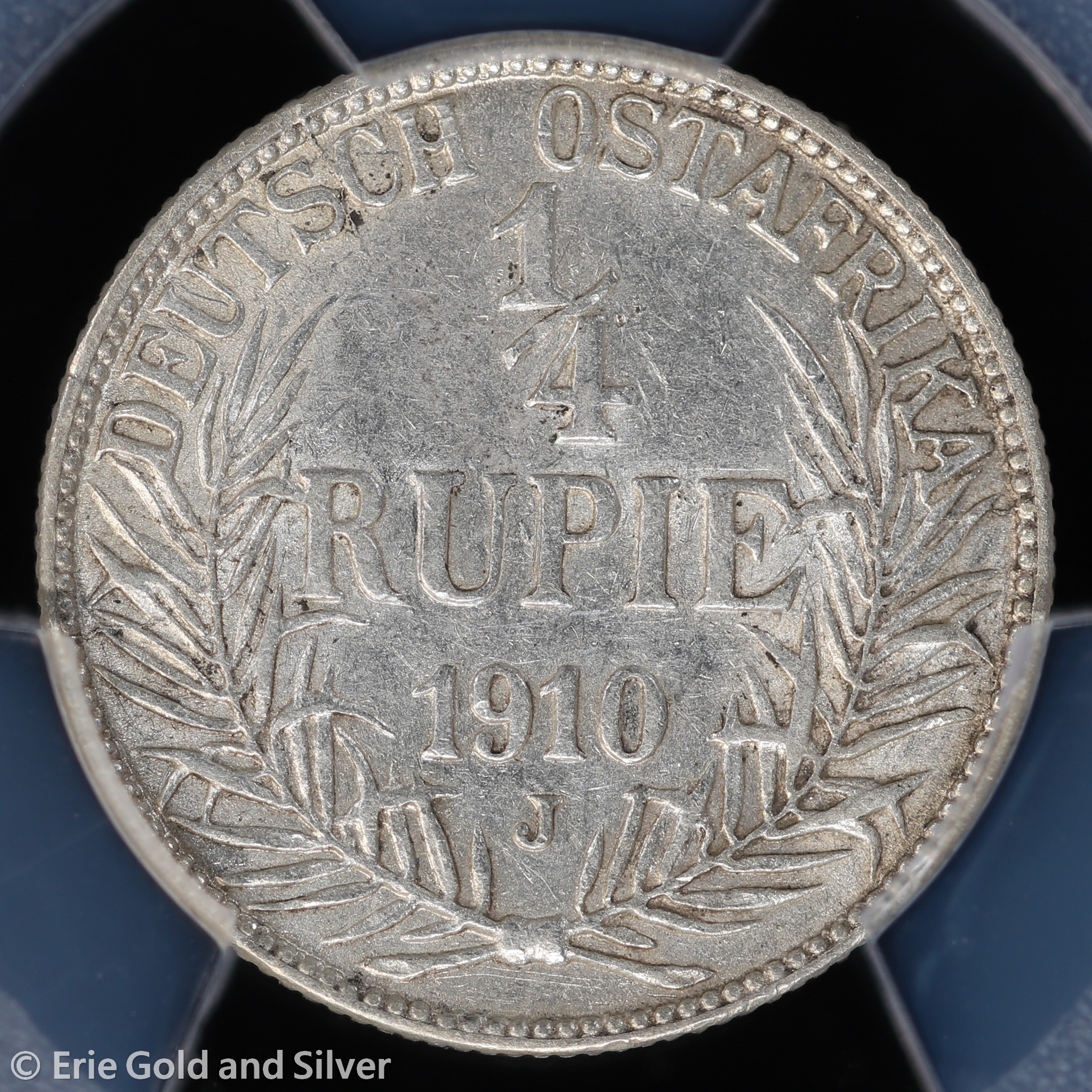 For sale is a 1910-J German East Africa Silver 1/4 Rupie. Certified / graded by PCGS at AU 50.