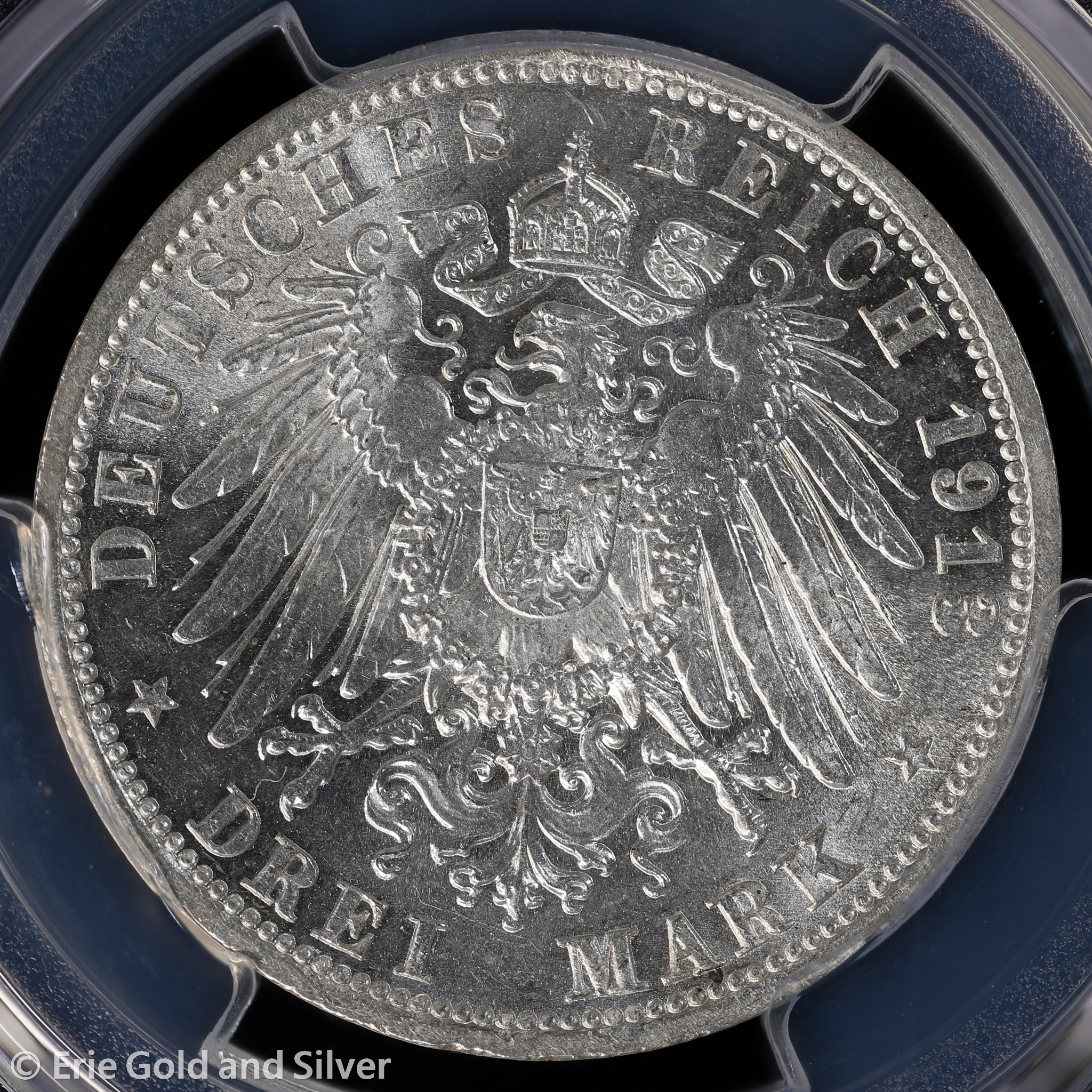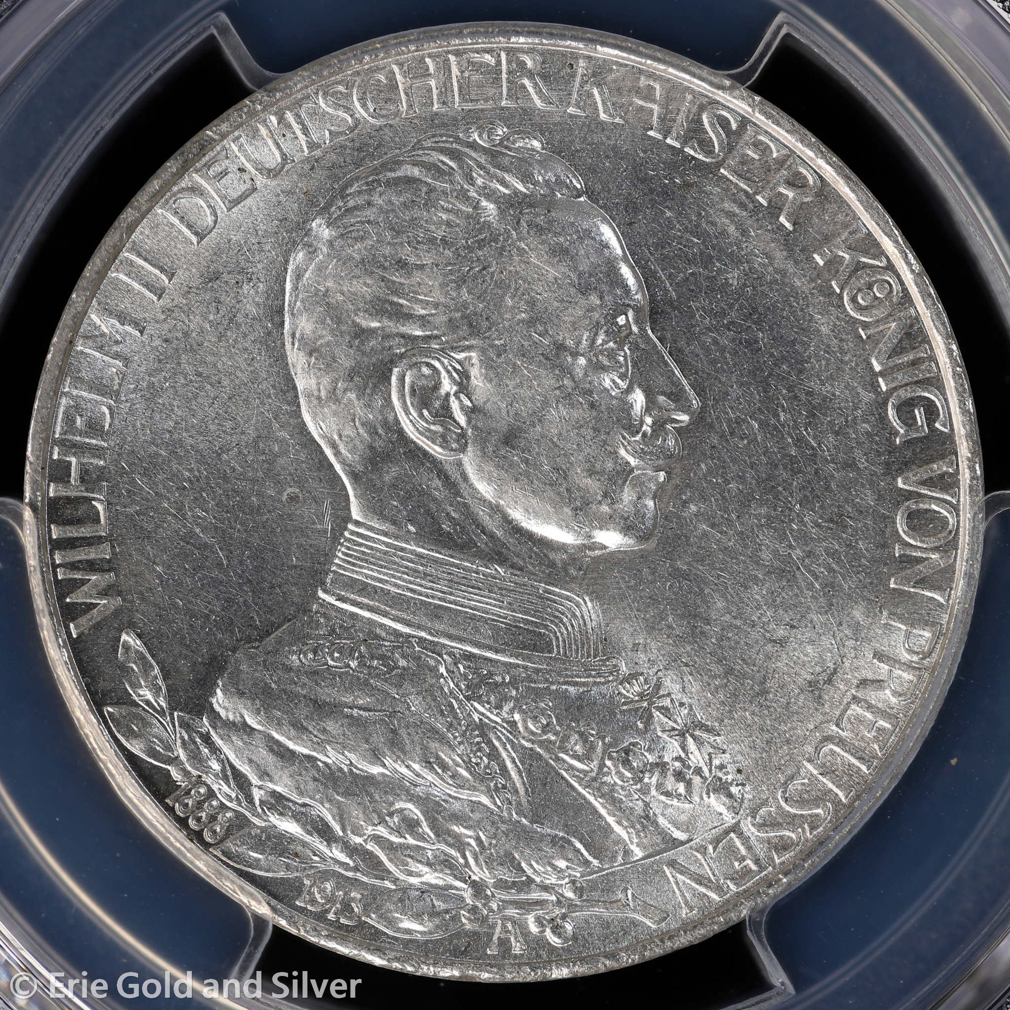 For sale is a 1913-A Prussia William II 25th Anniversary Silver 3 Marks. Certified / graded by PCGS at MS 61.