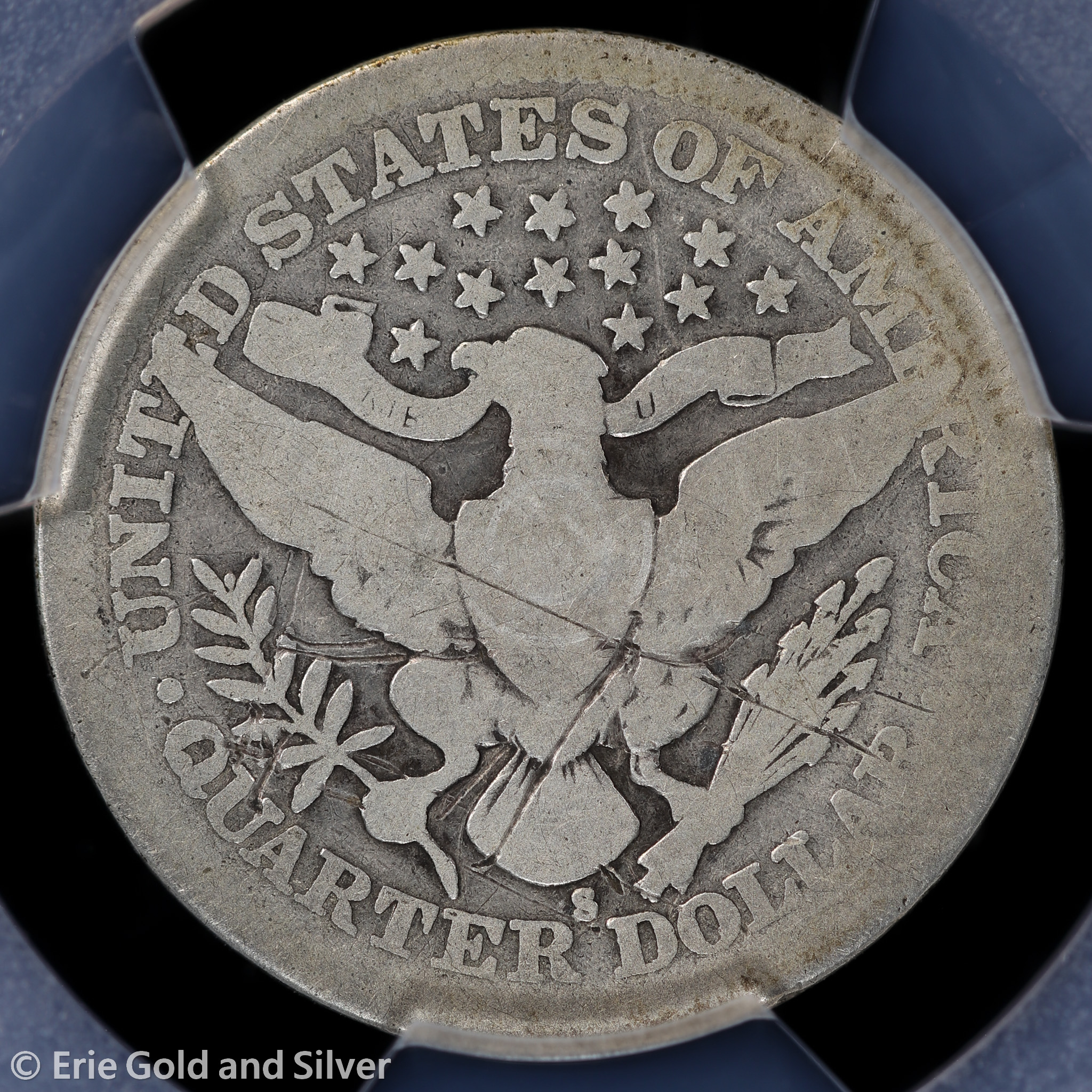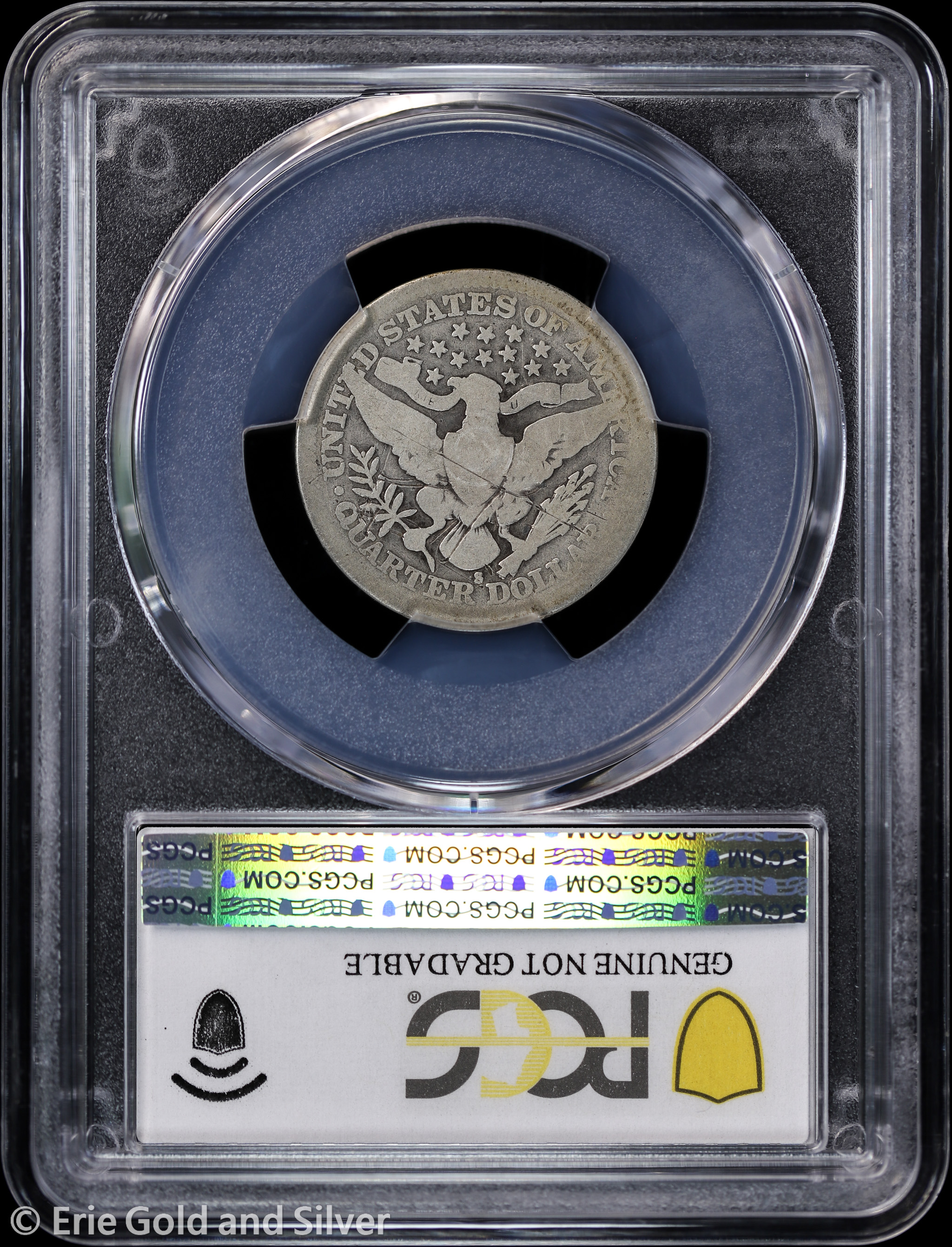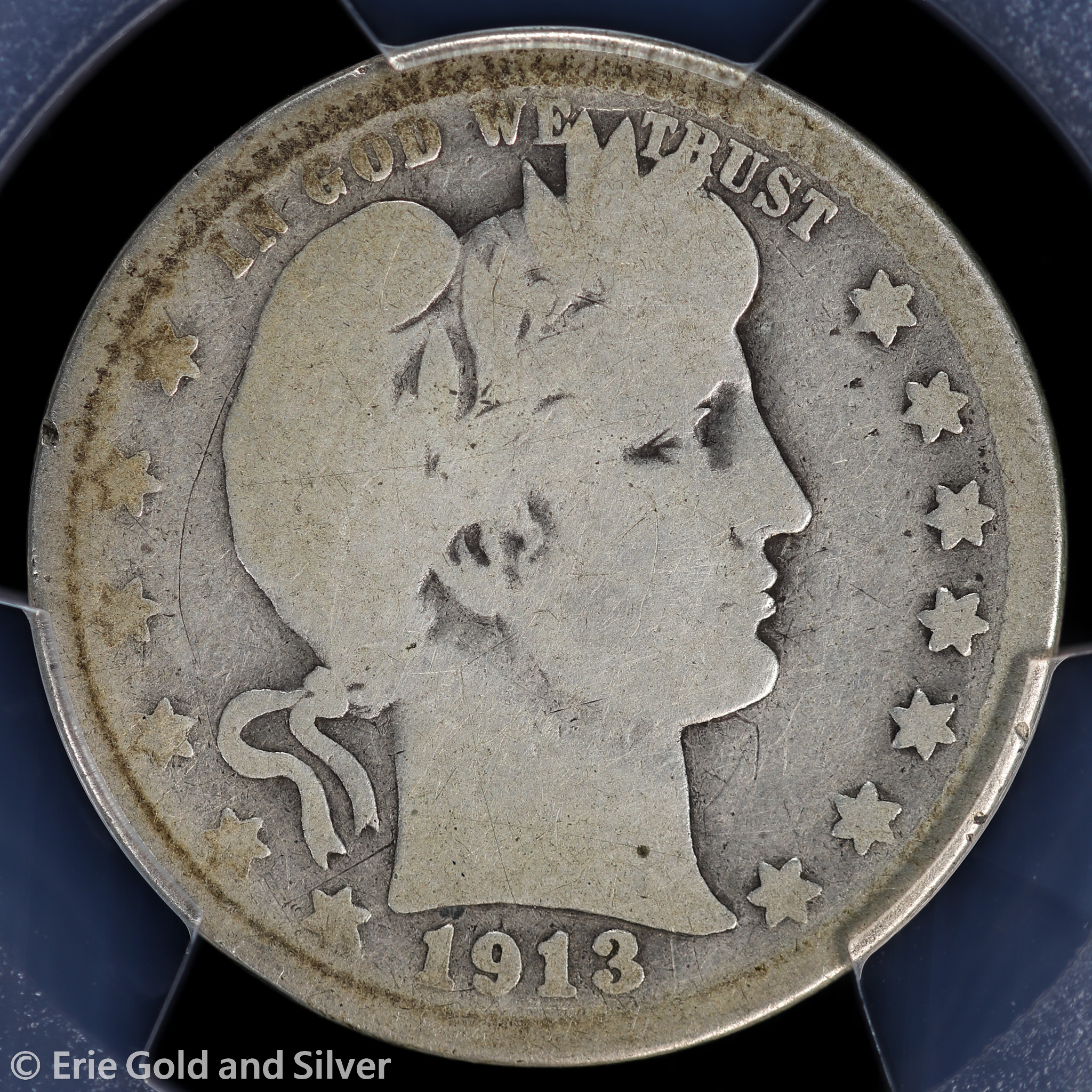 For sale is a 1913-S Barber Quarter. Certified / graded by PCGS at Genuine G Detail.