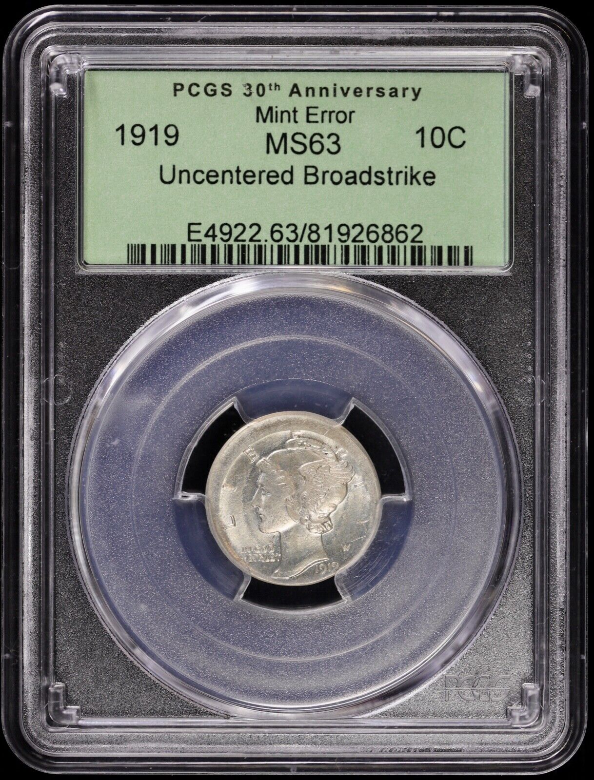 1919 Mercury Silver Dime 10c PCGS 30th Ann. Holder MS-63 Error Broadstrike (BU)