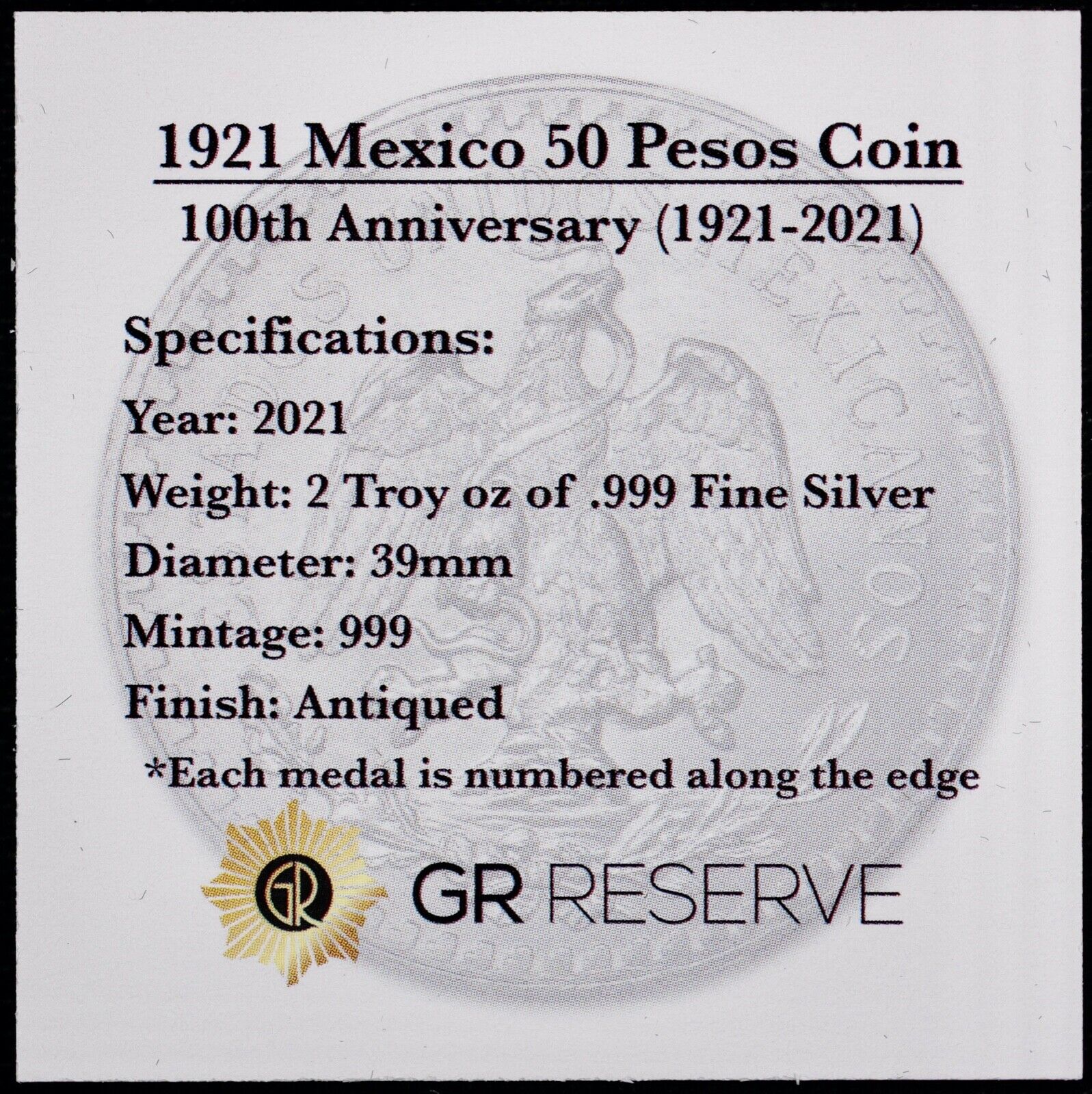 1921 2021 Mexico 2 oz Silver 50 Pesos 100th Anniversary BU MS Antiqued