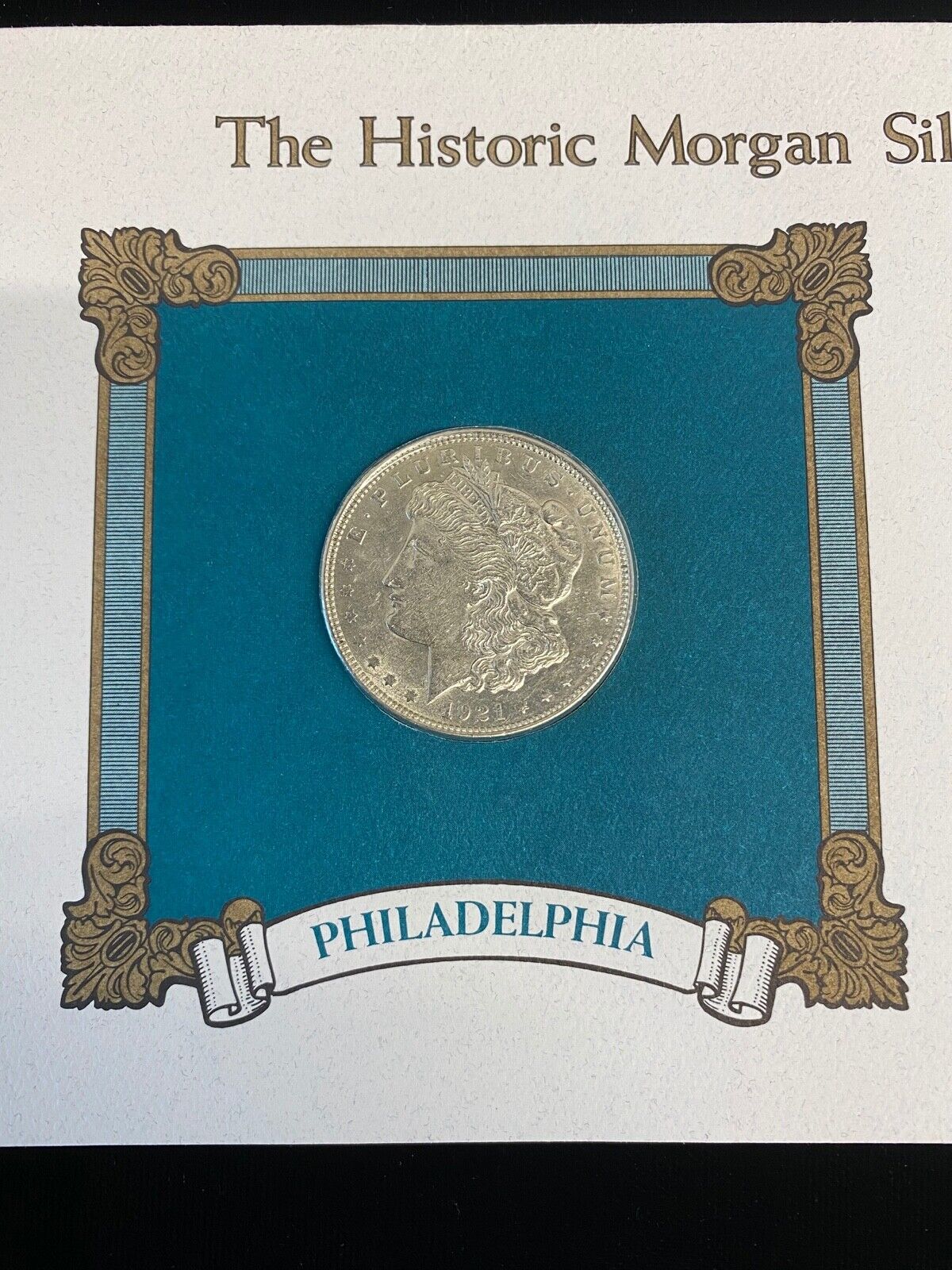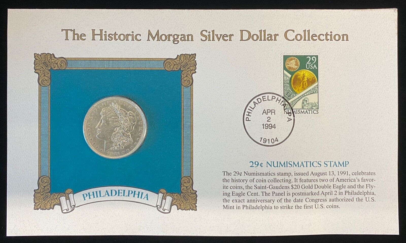 1921 Morgan Silver Dollar Philadelphia with 29 Cent Stamp & Album Page