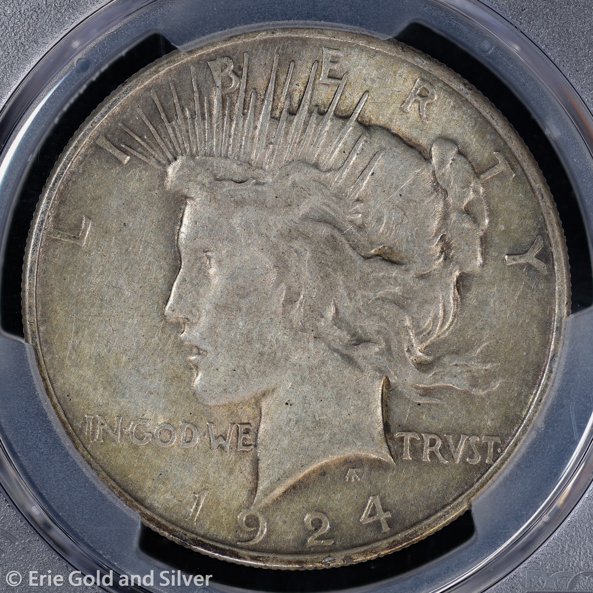 For sale is a 1924-P Peace Silver Dollar. Certified / graded by PCGS at VF 35.