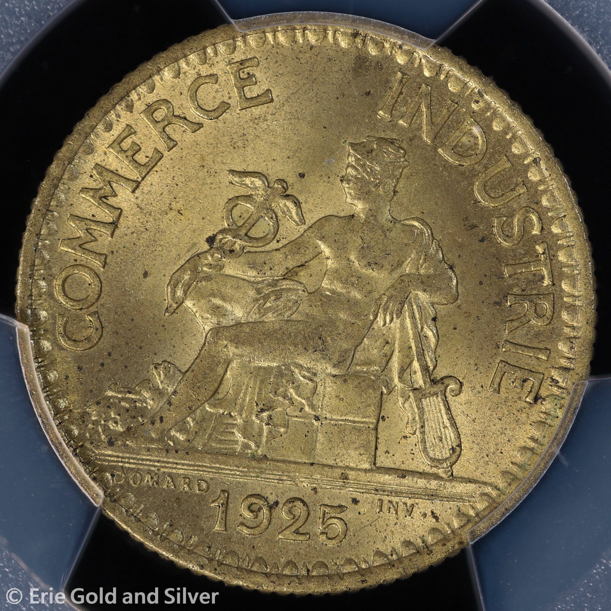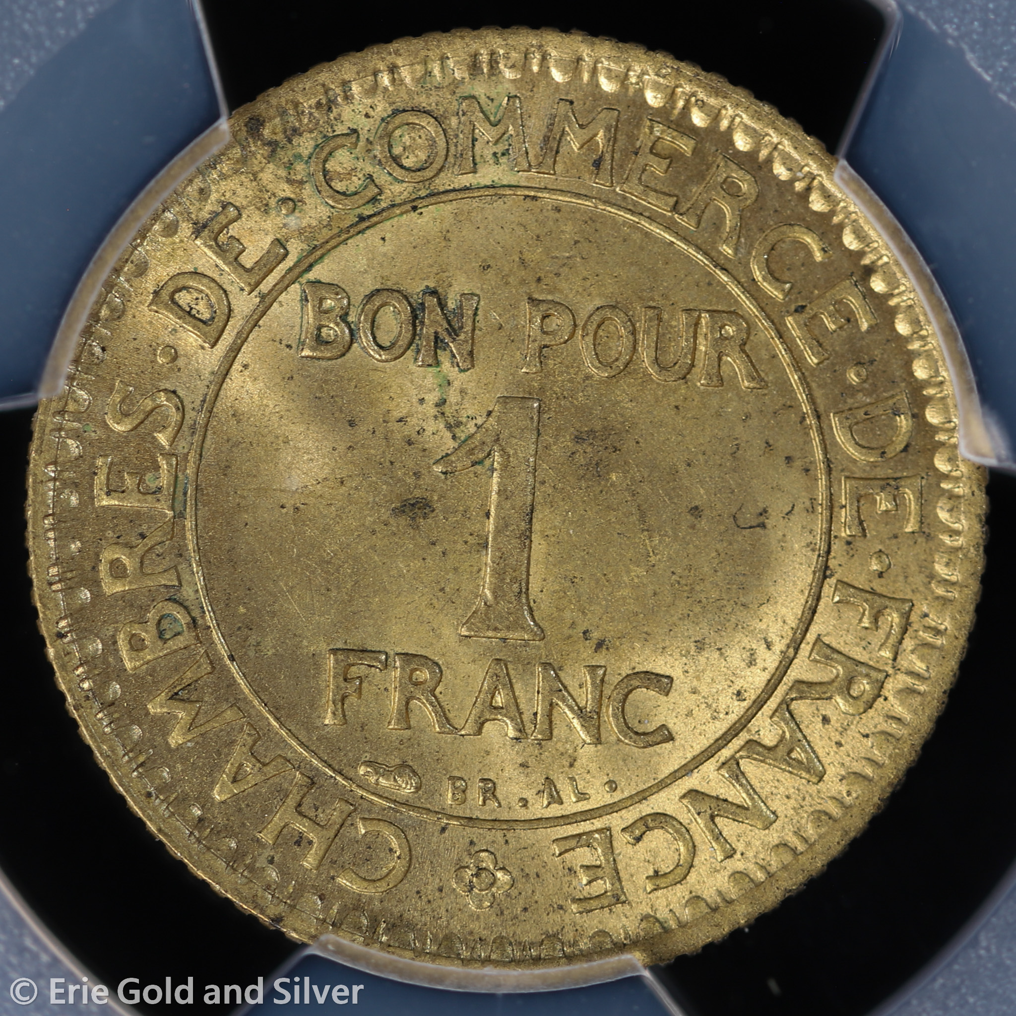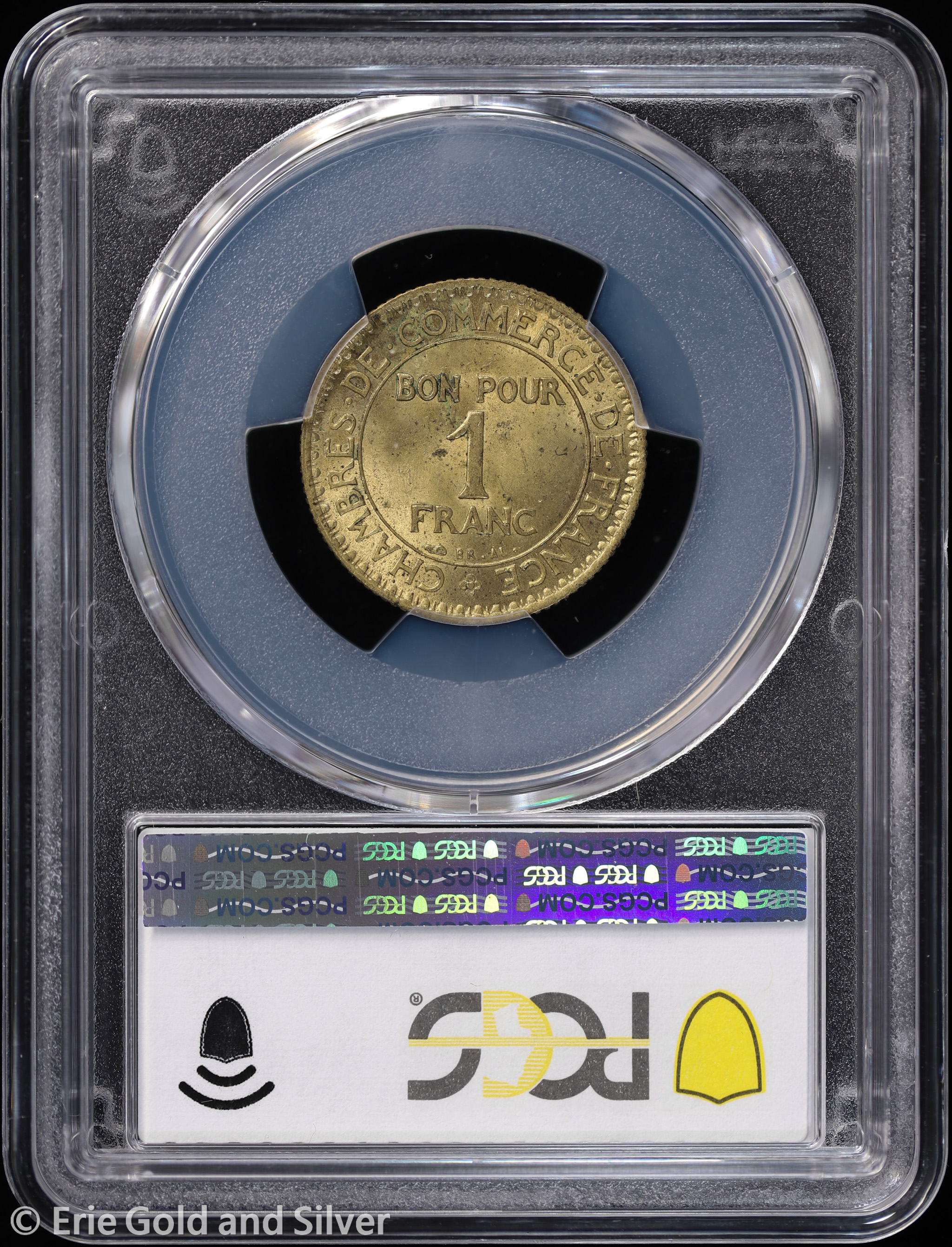 For sale is a 1925 France Chambers of Commerce 1 Franc. Certified / graded by PCGS at MS 63.