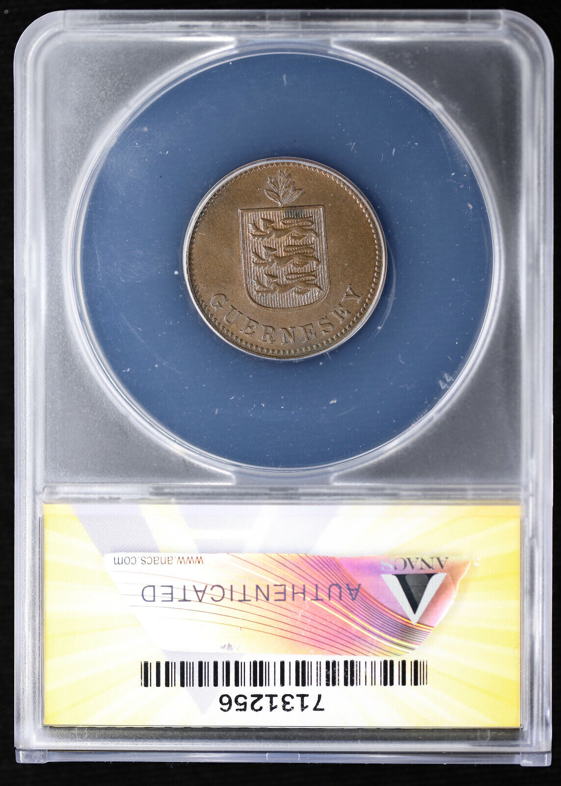 1929-H Guernsey 2 Doubles ANACS MS 64 BRN | Low Mintage: 79,000 UNC Brown