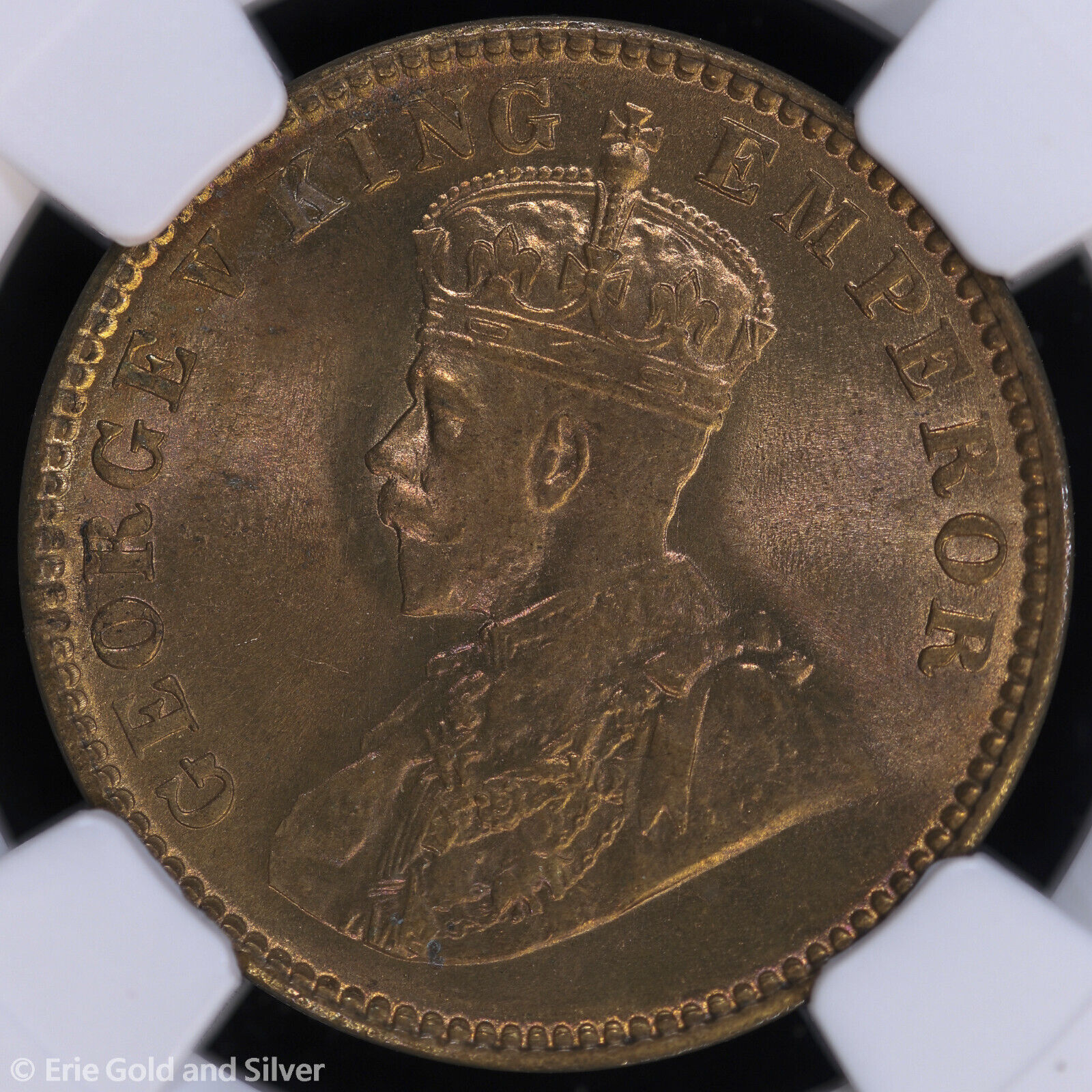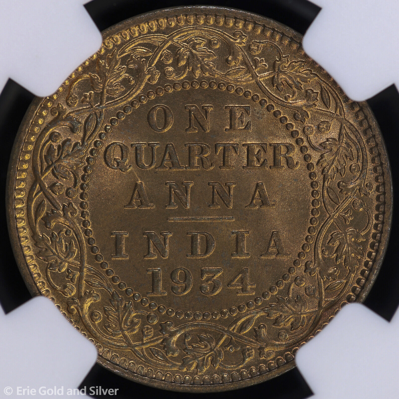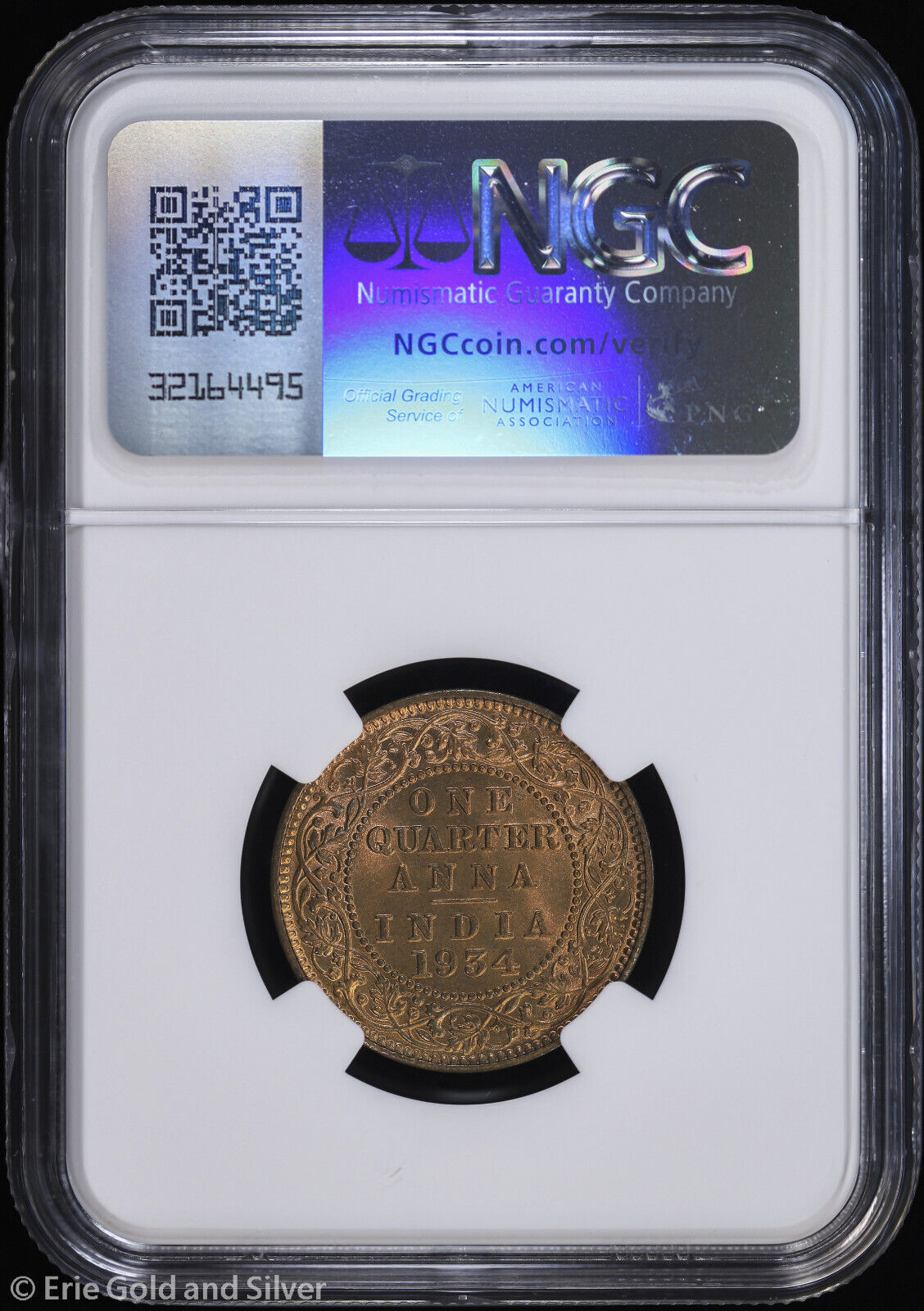 1934-(C) India 1/4 Anna NGC MS 65 RD | Toned Uncirculated UNC BU
