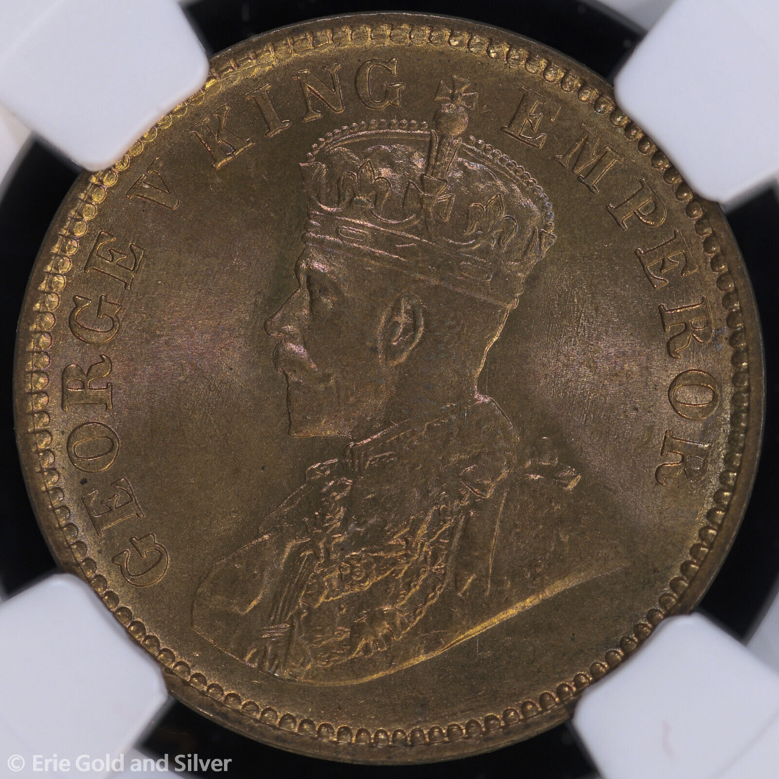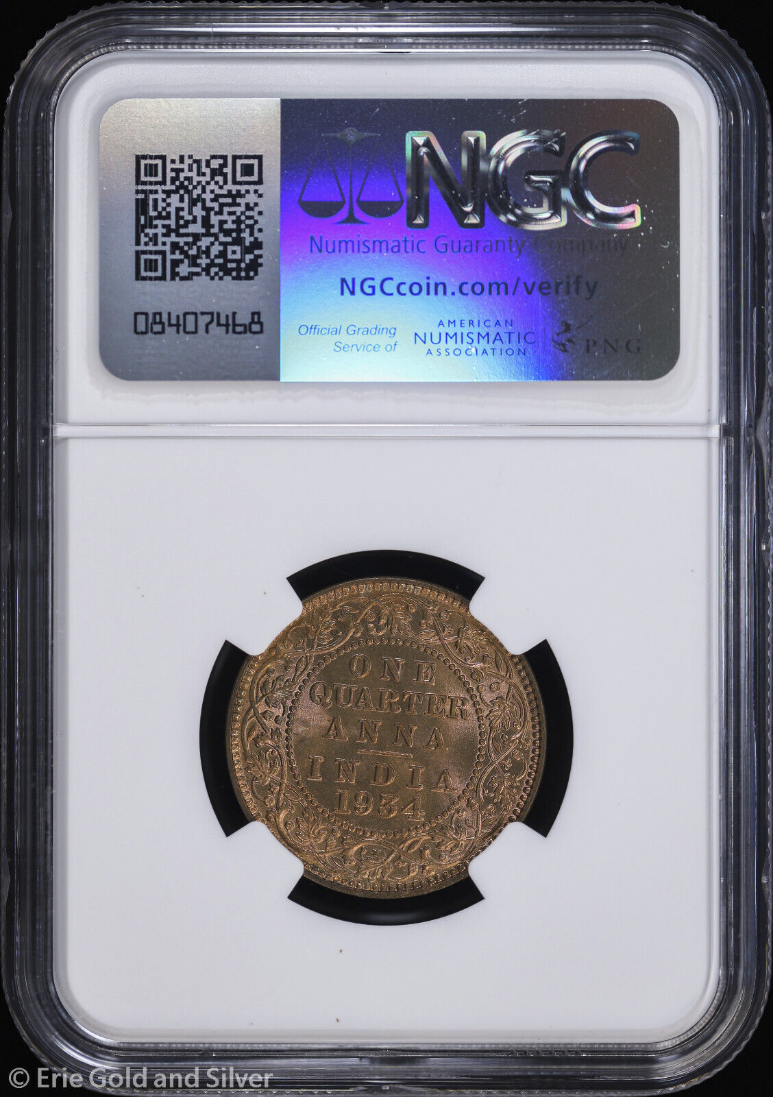 1934-(C) India 1/4 Anna NGC MS 66 RB | Light Purple Toned Uncirculated UNC BU
