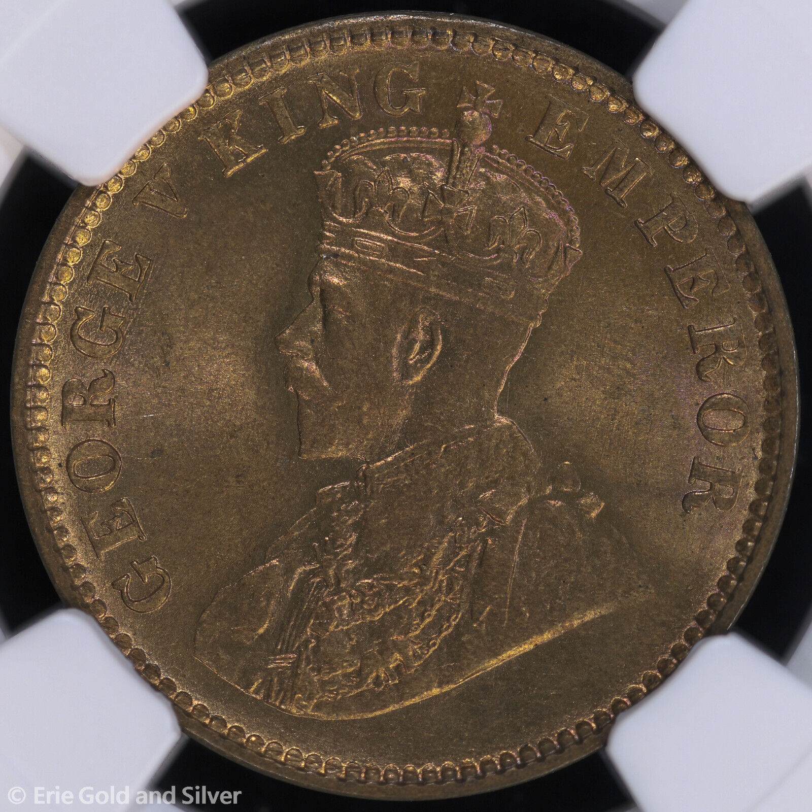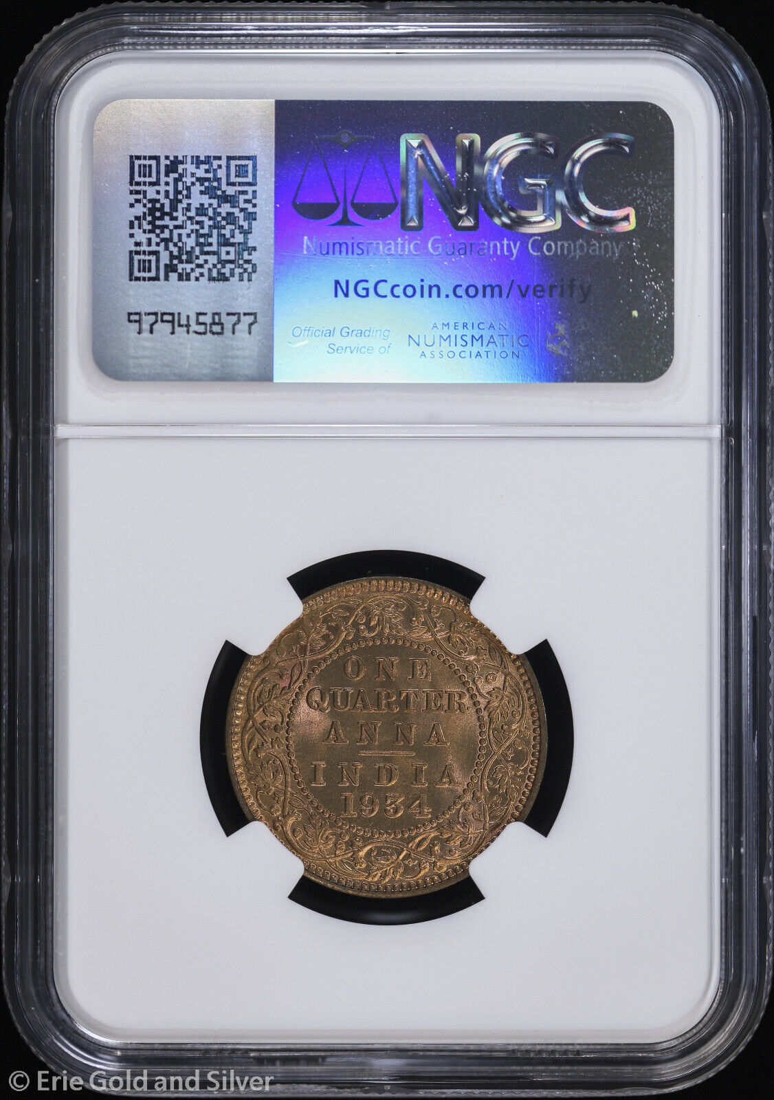 1934-(C) India 1/4 Anna NGC MS 66 RB | Purple Toned Uncirculated UNC BU