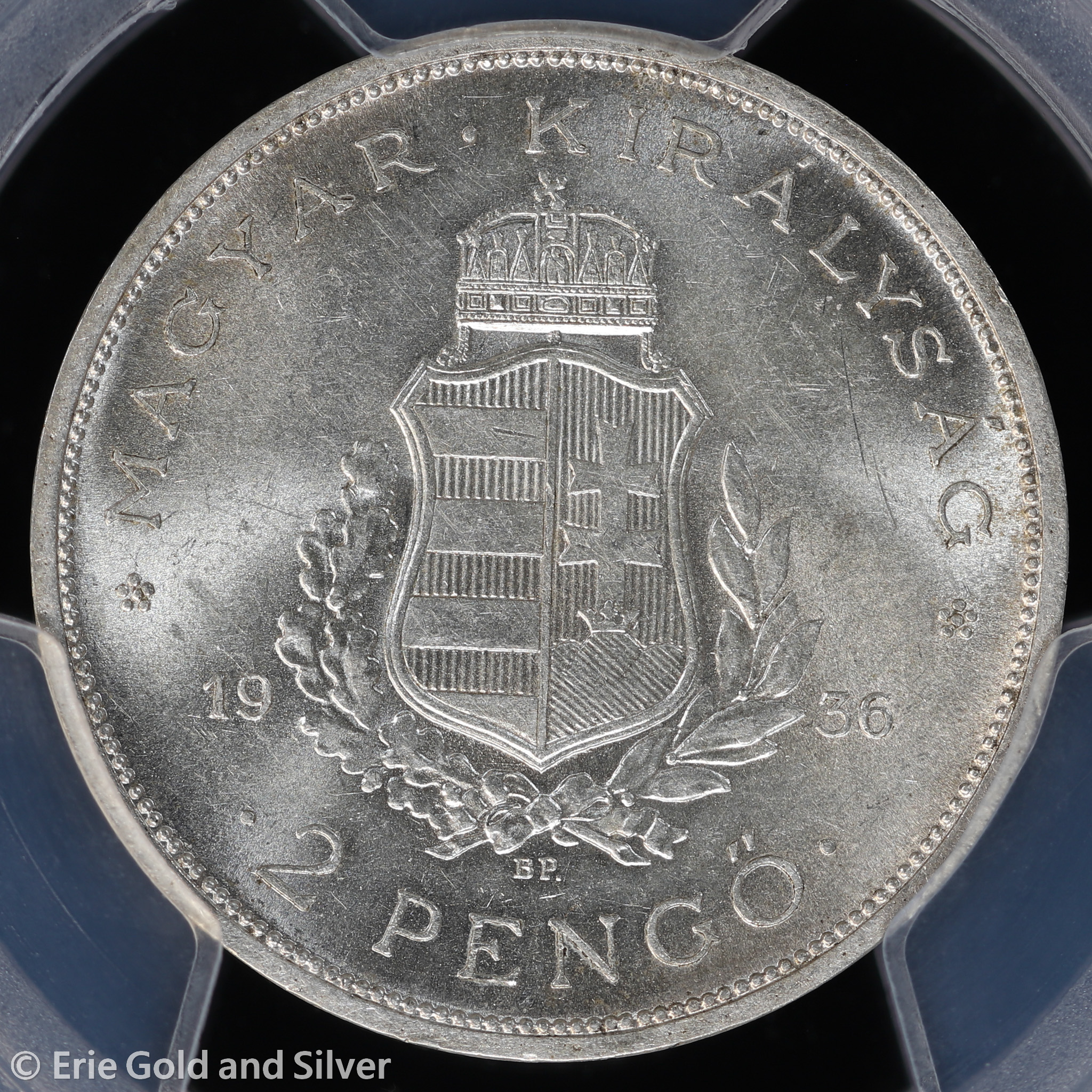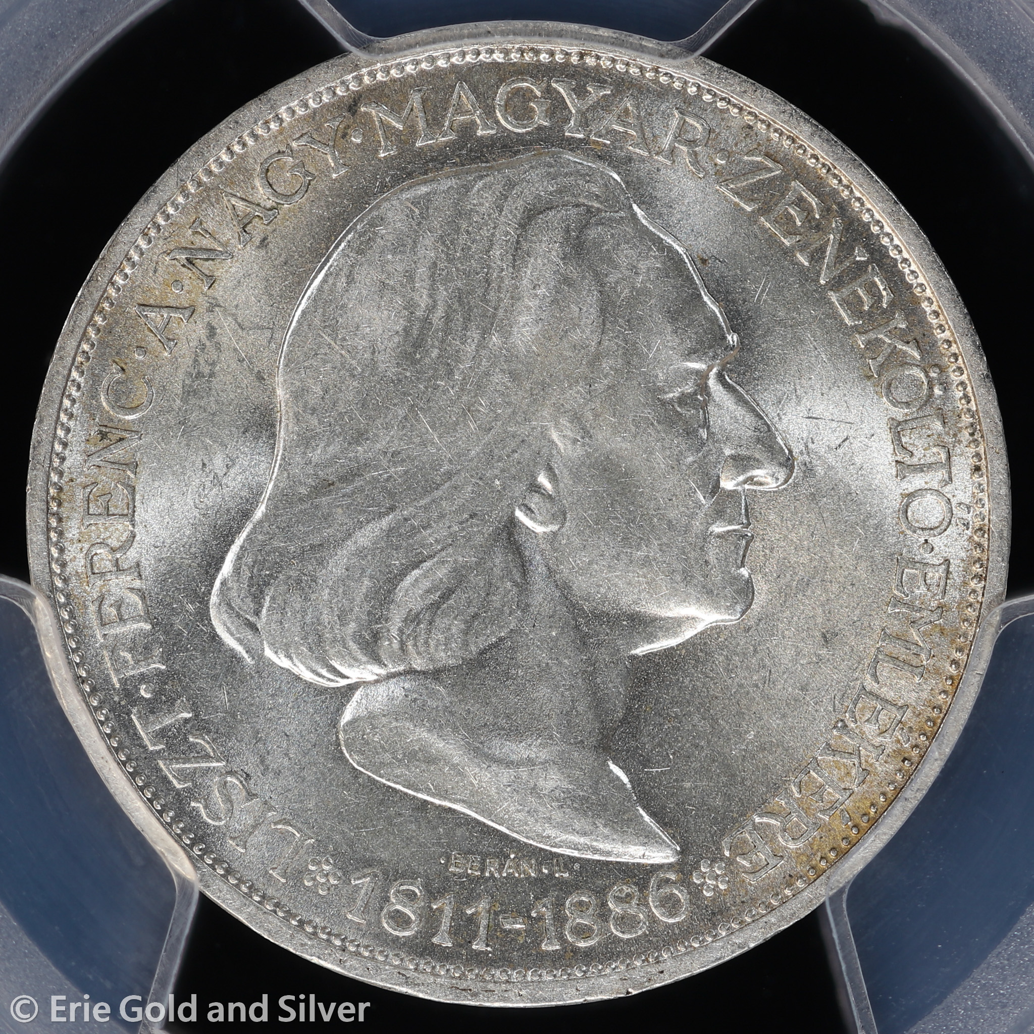 For sale is a 1936-BP Hungary Silver Franz von Liszt 2 Pengő. Certified / graded by PCGS at MS 63.