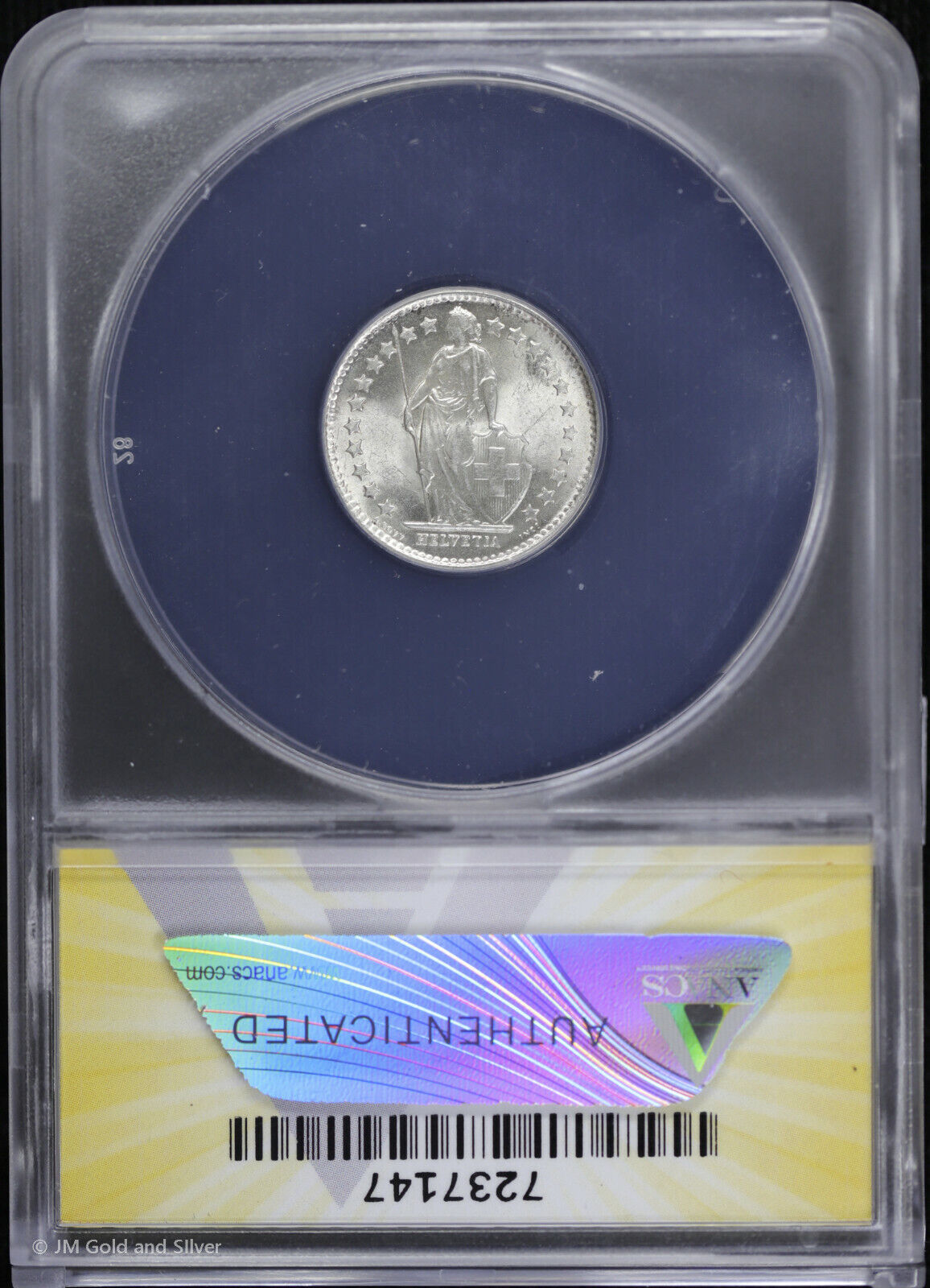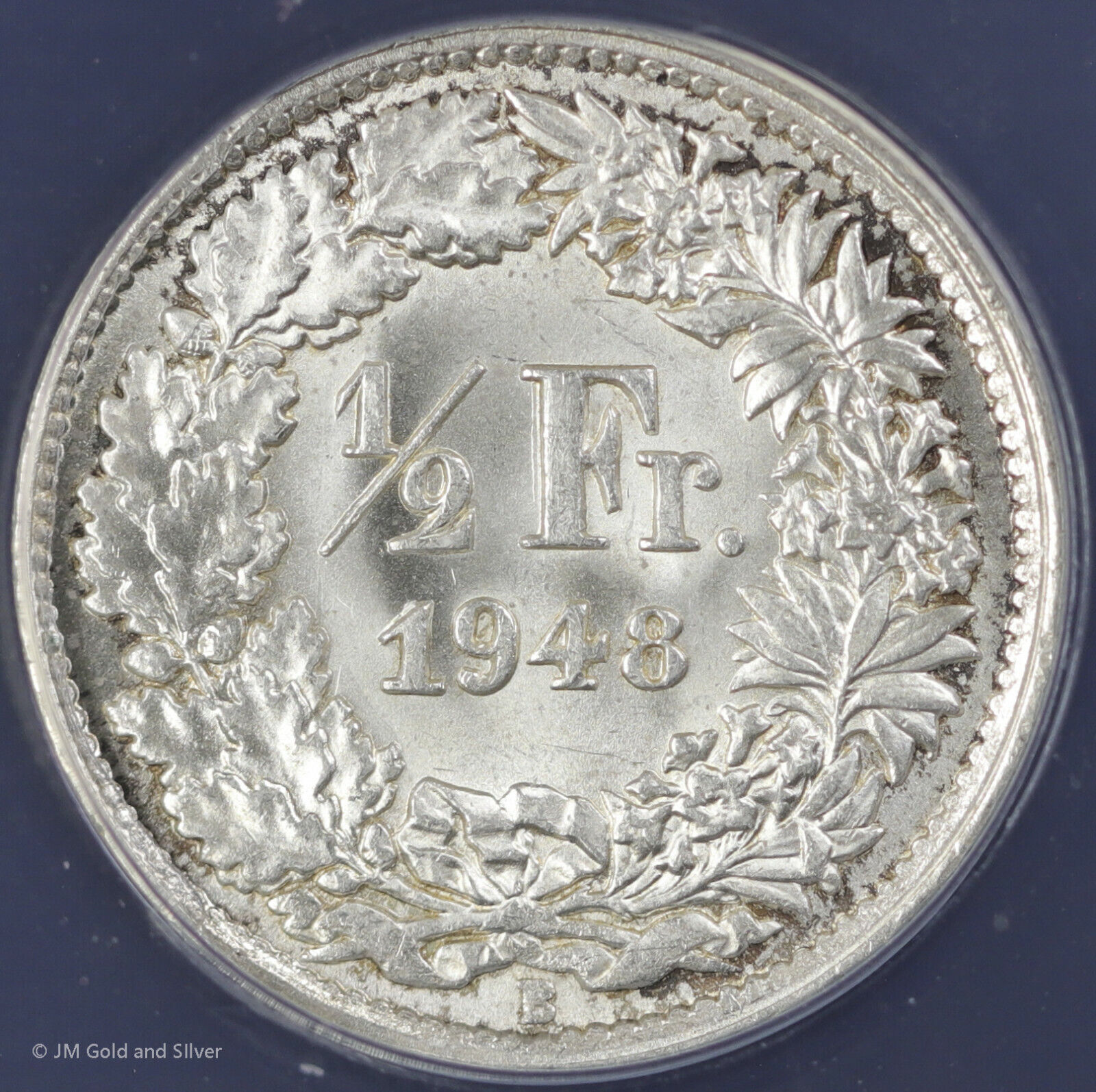 1948-B 1/2FR Franc Switzerland Silver KM#23 ANACS MS 63 Helvetia (BU Unc) Swiss