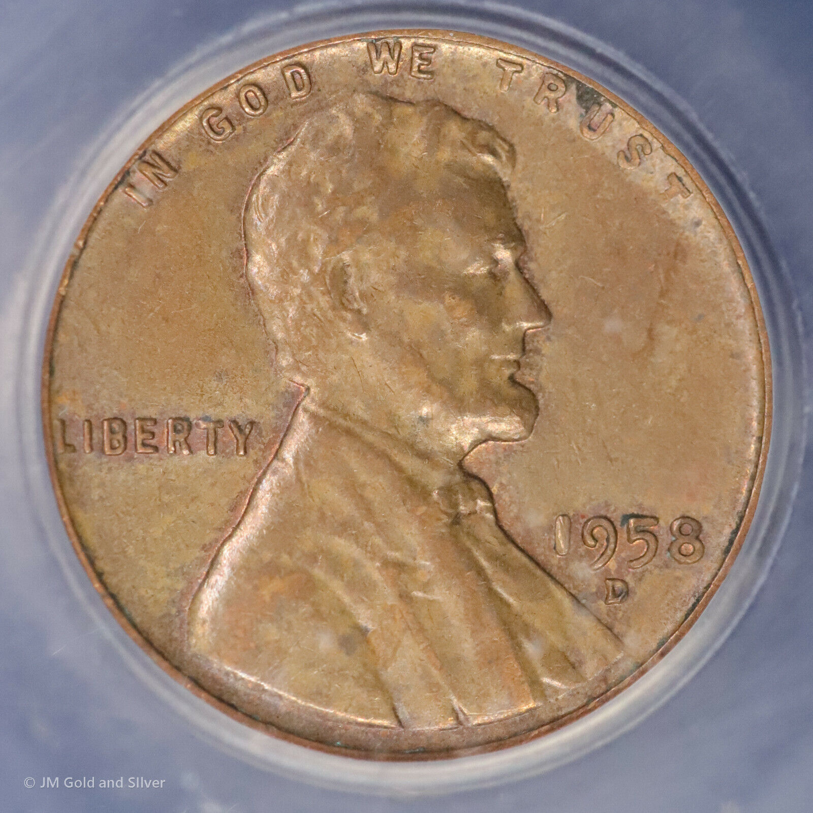 1958-D 1C Lincoln Wheat Cent ANACS AU 50 | Struck Through Debris