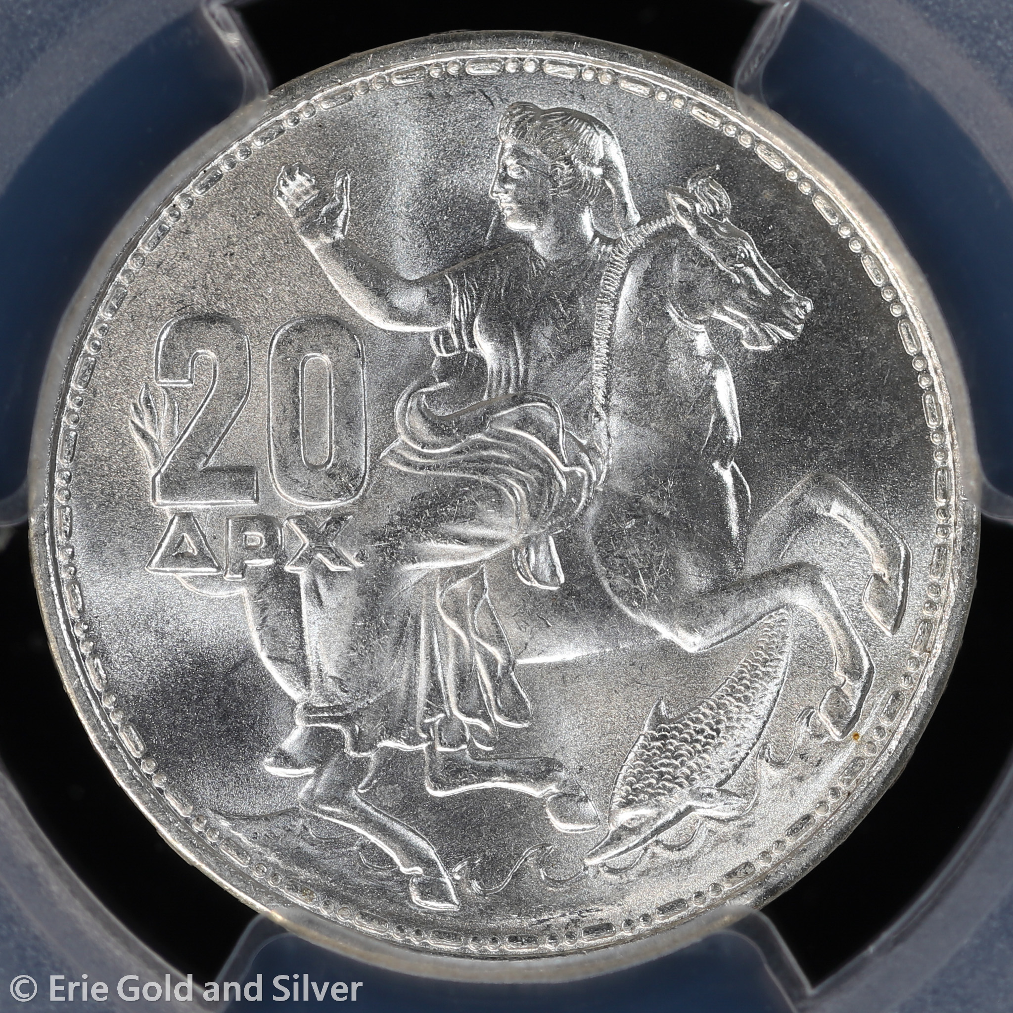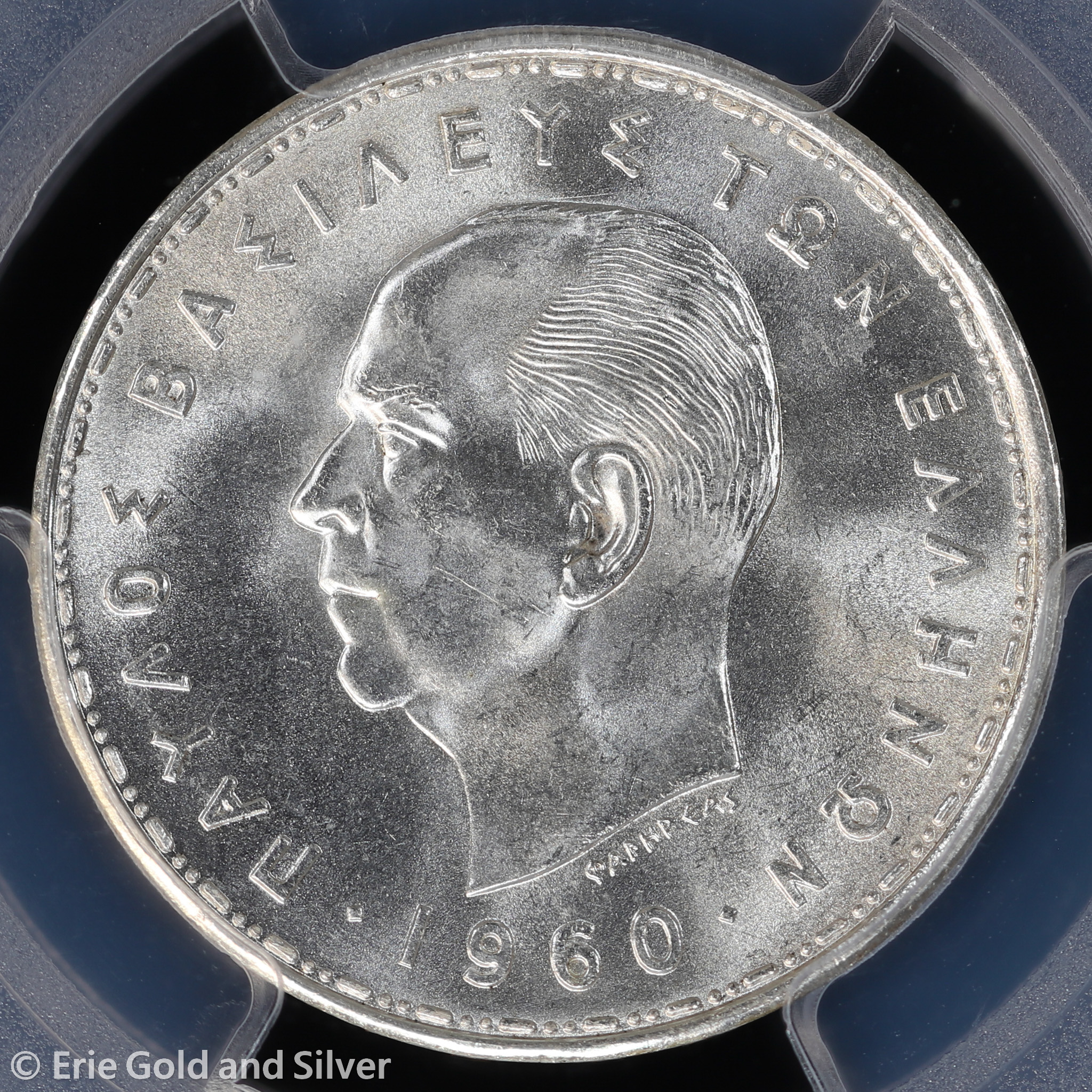 For sale is a 1960 Greece Silver 20 Drachmai. Certified / graded by PCGS at MS 65.